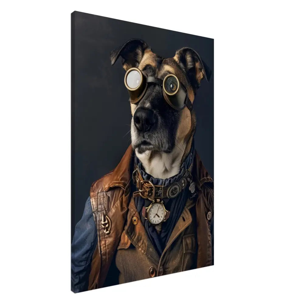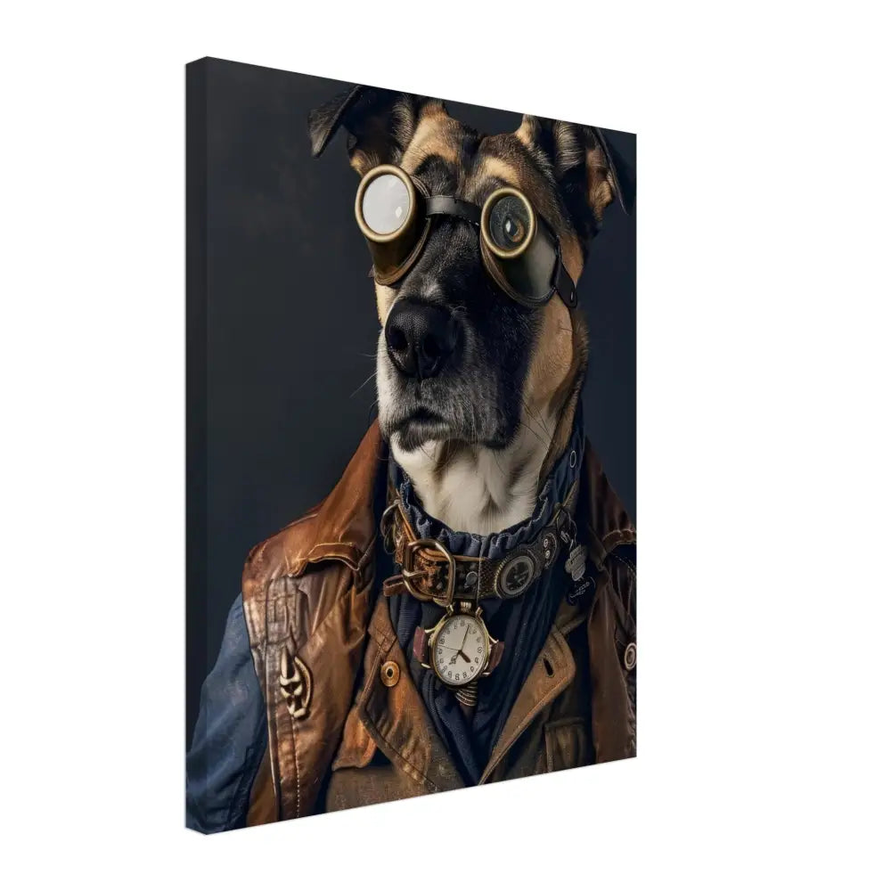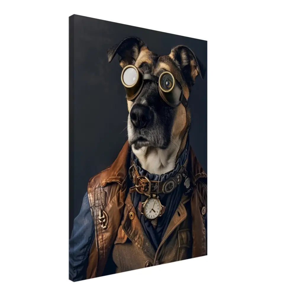 Deze afbeelding toont een dier, gekleed in een prachtige vintage steampunk outfit. Het draagt een stijlvolle, bruine jas met subtiele koperkleurige accenten en intricaten stiksels. Om de nek hangt een antieke gouden klok die de elegante uitstraling versterkt. De kop van het dier is versierd met een paar imposante steampunk-brillen met metalen details in bronskleur, wat een tijdreiziger-uitstraling geeft. De pootjes zijn voorzien van leren accenten en de manchetjes zijn afgezet met contrasterende stiksels. De donkere, minimalistische achtergrond benadrukt de gedetailleerde en klassieke kleding van het dier, waardoor de steampunk sfeer nog sterker overkomt.