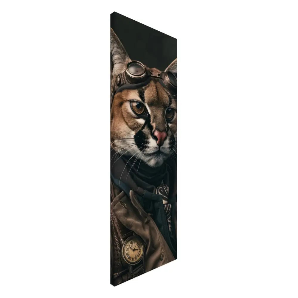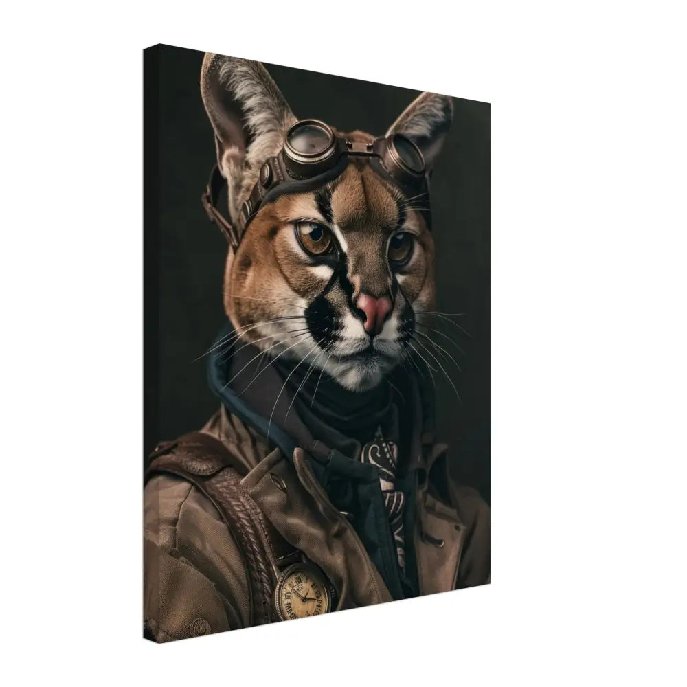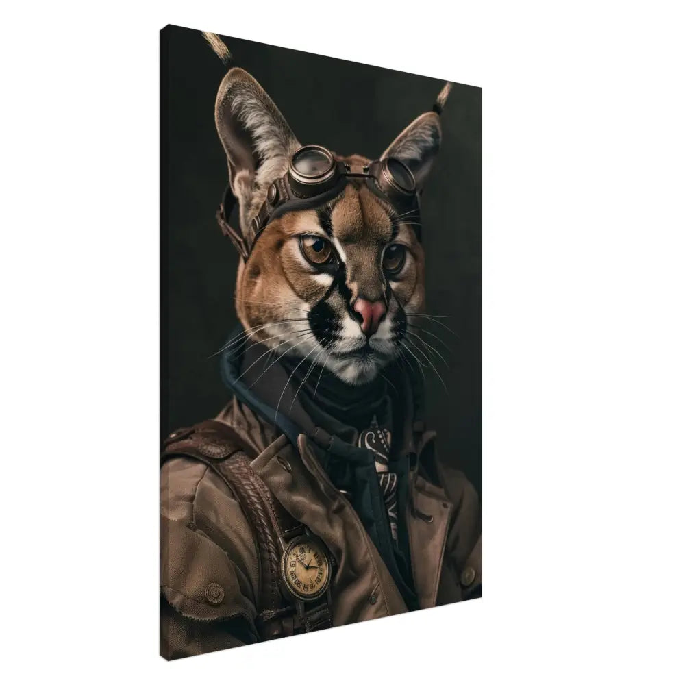 Deze afbeelding toont een dier, gekleed in een prachtige vintage steampunk outfit. Het draagt een stijlvolle, bruine jas met subtiele versleten accenten en decoratieve metalen knopen. Om de nek hangt een antieke bronzen klok, die de tijd een mysterieuze flair geeft. De kop wordt gesierd door een paar grote, retro-futuristische brillen met robuuste metalen details en een bronskleurig montuur, waardoor dit dier eruitziet als een gedreven ontdekkingsreiziger. De schouders zijn voorzien van leren riempjes en contrasterende stiksels die het geheel een robuuste uitstraling geven. De achtergrond is donker en mysterieus, passend bij de avontuurlijke sfeer van het portret.