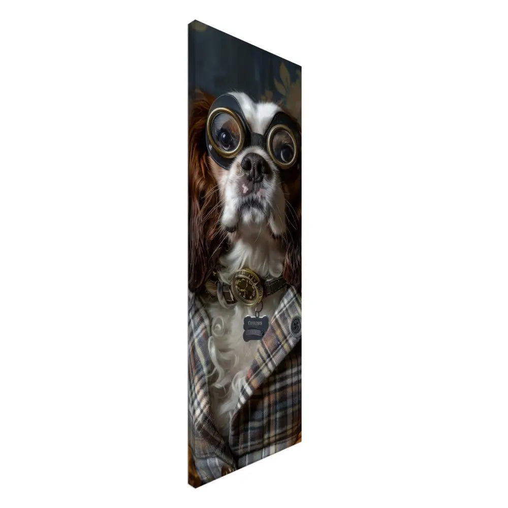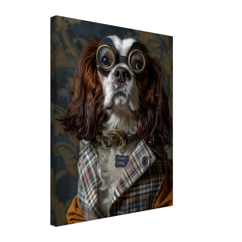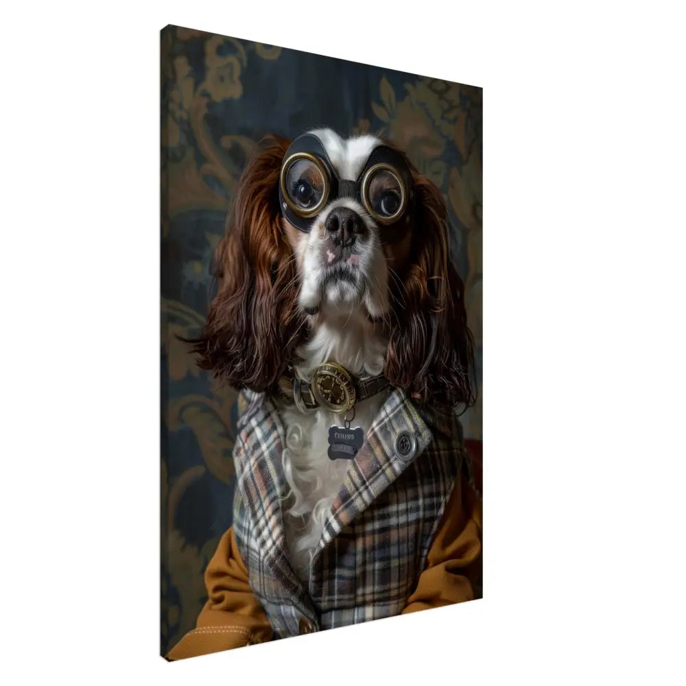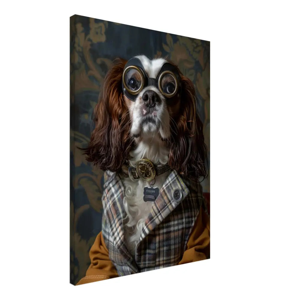 Deze afbeelding toont een hond, gekleed in een prachtige vintage steampunk outfit. Het draagt een stijlvol, geruit jasje in aardetinten met elegante knopen en subtiele patronen die doen denken aan de Victoriaanse tijd. Om de nek hangt een antieke bronzen klok, die de verfijnde uitstraling van het dier onderstreept. De kop wordt gesierd door een paar grote, retro-futuristische brillen met metalen details in goudkleur, wat de hond een avontuurlijke uitstraling geeft. De pootjes zijn gedecoreerd met okerkleurige leren accenten en contrasterende stiksels. De achtergrond wordt gevormd door een klassieke, met bloemen bedrukte behang.