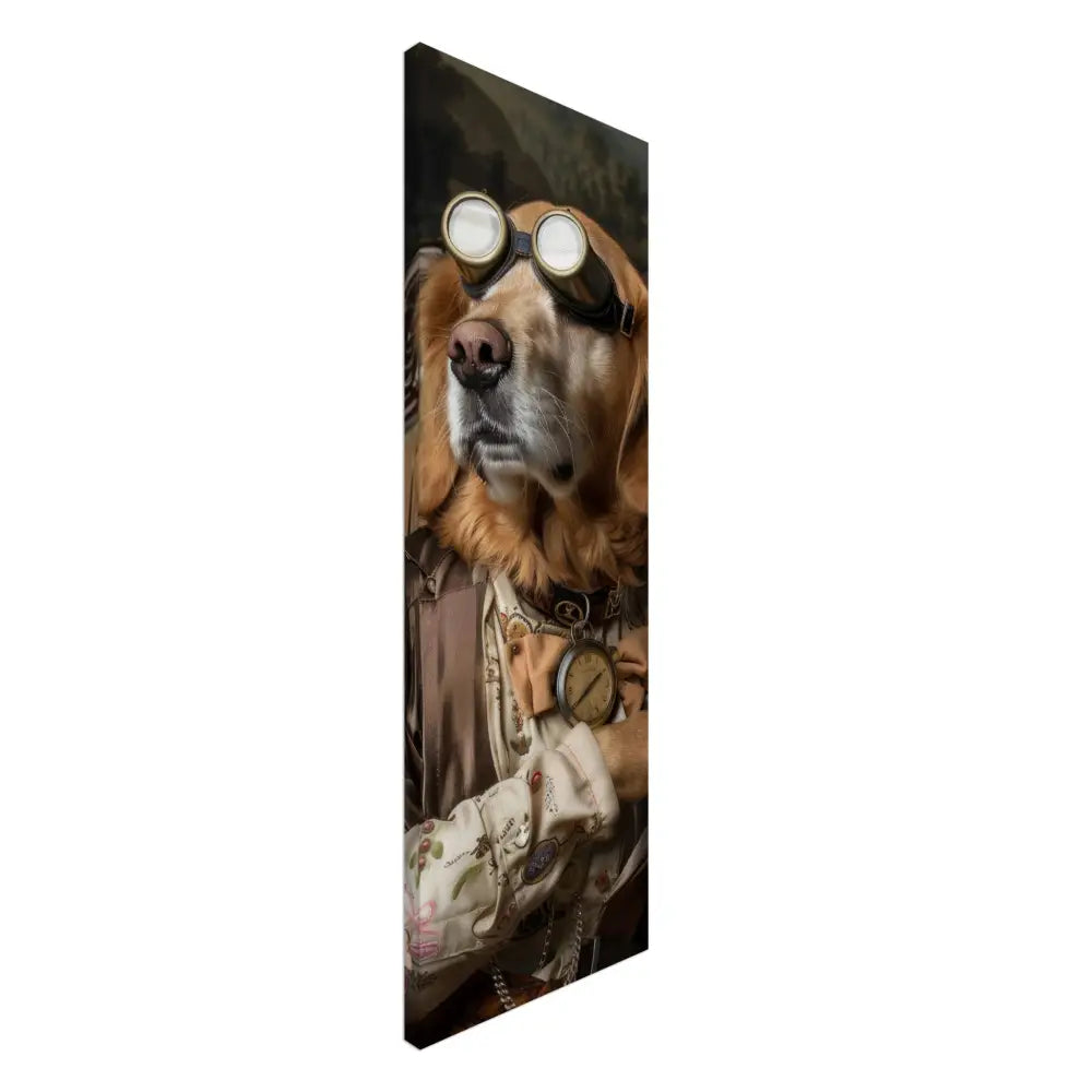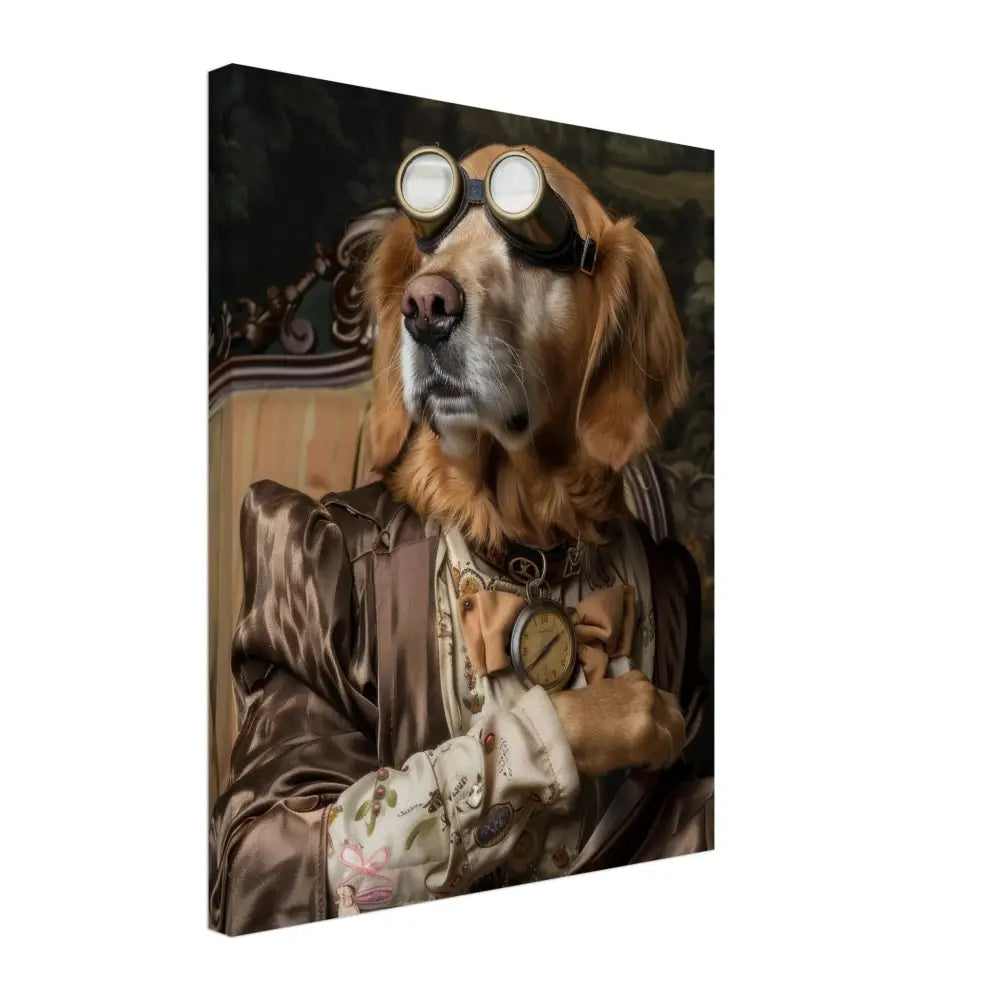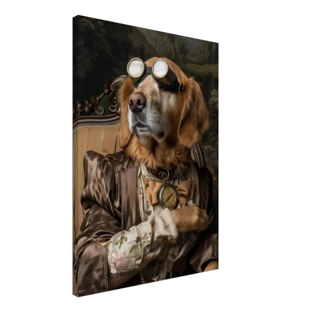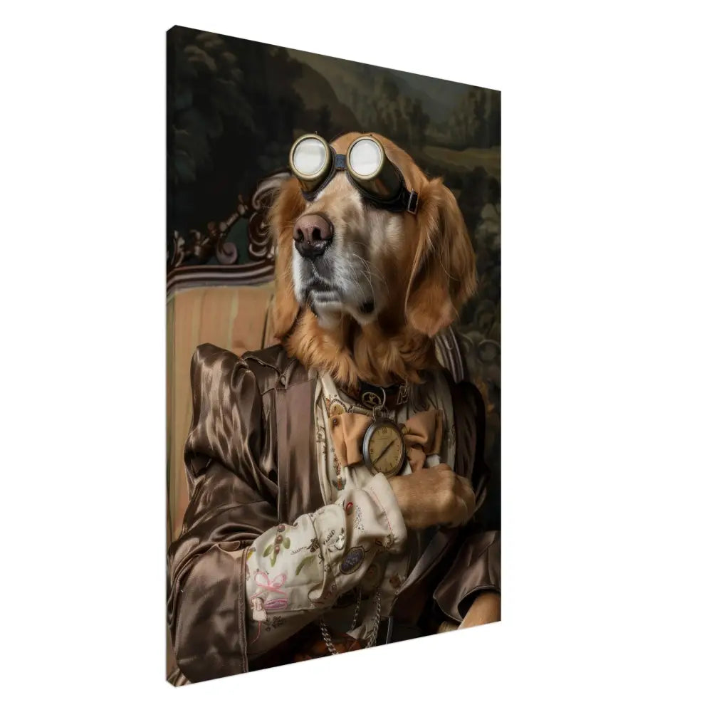 Deze afbeelding toont een dier, gekleed in een prachtige vintage steampunk outfit. De hond draagt een elegante, bronzen jas met subtiele glanzende patronen die een luxe uitstraling creëeren. Om de nek hangt een antieke gouden klok, die het historische karakter van het portret benadrukt. De kop wordt geaccentueerd door een paar grote, retro-futuristische brillen met metalen details in goudkleur, wat het geheel een verkennersuitstraling geeft. De voorpoten zijn voorzien van chique, crèmekleurige manchetjes, leren accenten, en verfijnde contrasterende stiksels. De achtergrond toont een weelderig landschap, compleet met groene heuvels en dramatische vergezichten.