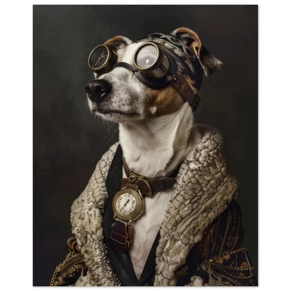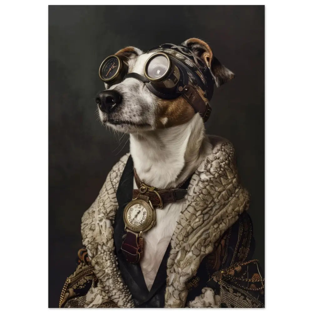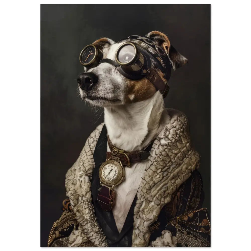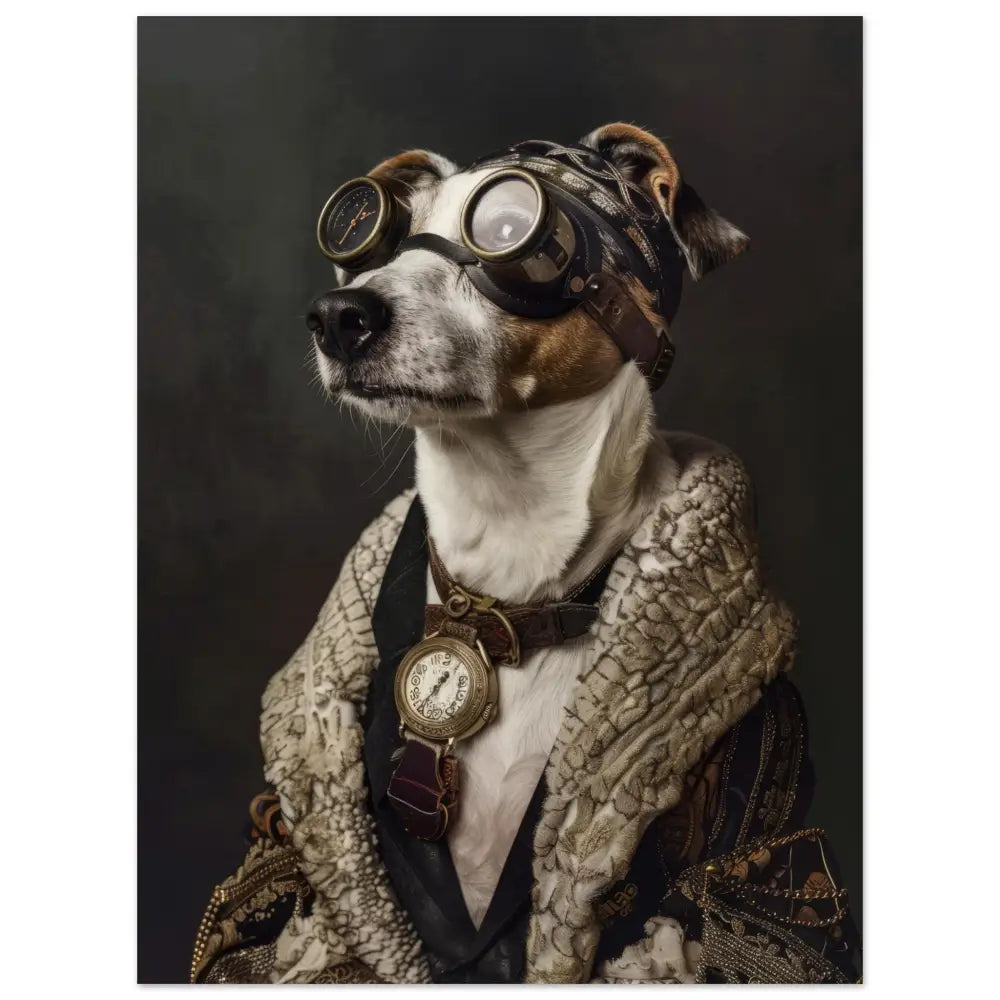 Deze afbeelding toont een dier, gekleed in een prachtige vintage steampunk outfit. Het draagt een imposante, bruine jas met gedetailleerde patronen en luxueuze accenten. Om de nek hangt een antieke gouden klok, die de verfijnde look benadrukt. De kop van het dier wordt geaccentueerd door een paar grote, retro-futuristische brillen met bronzen metalen details, wat een gevoel van mysterie en avontuur oproept. De pootjes zijn versierd met elegante, fleeceachtige manchetjes en leren accenten, afgewerkt met contrasterende stiksels die het geheel een robuuste uitstraling geven. De donkere achtergrond voegt een dramatisch element toe, waardoor de outfit nog meer opvalt.