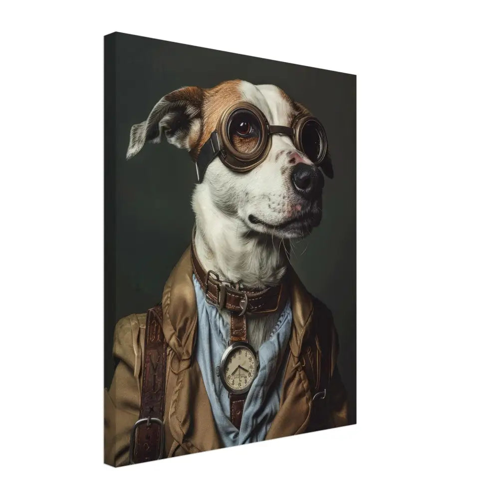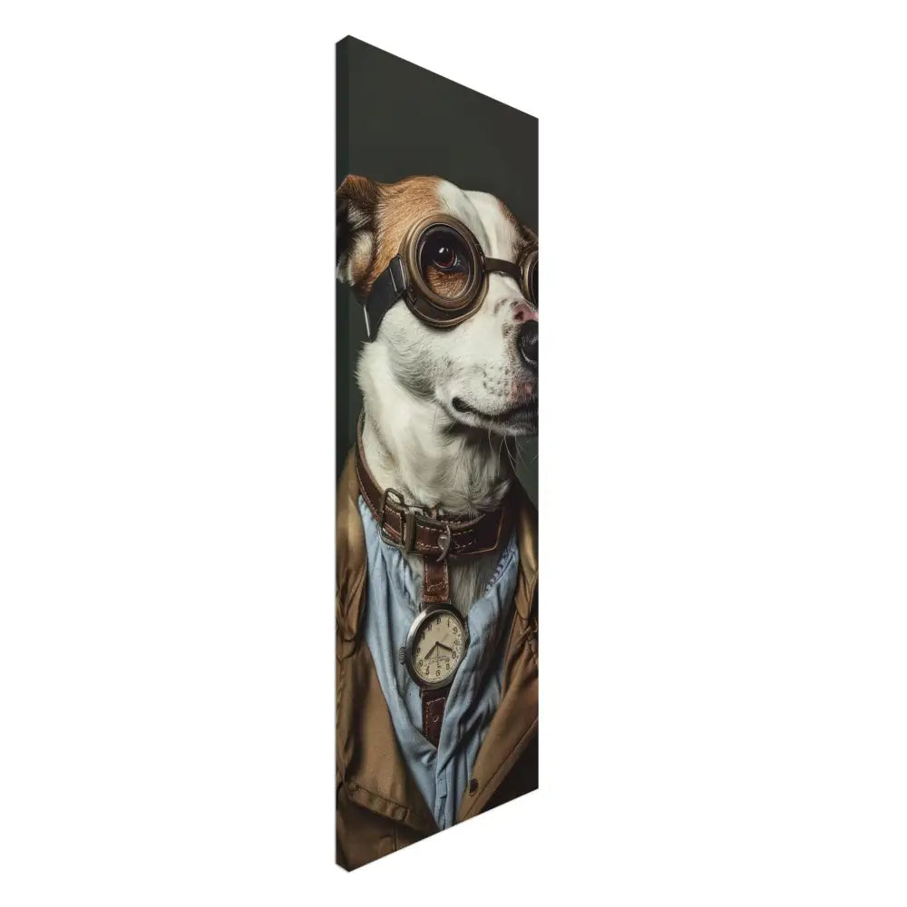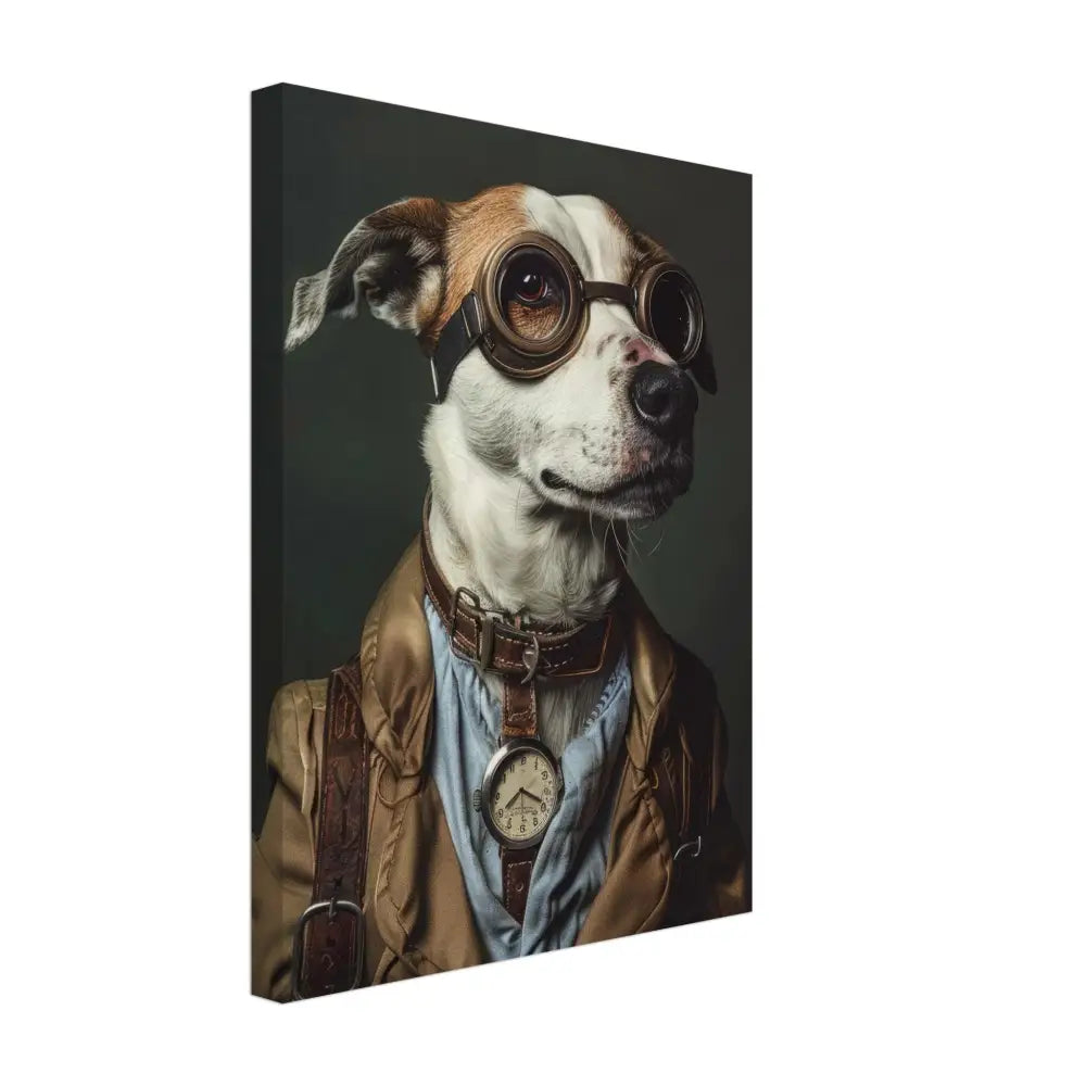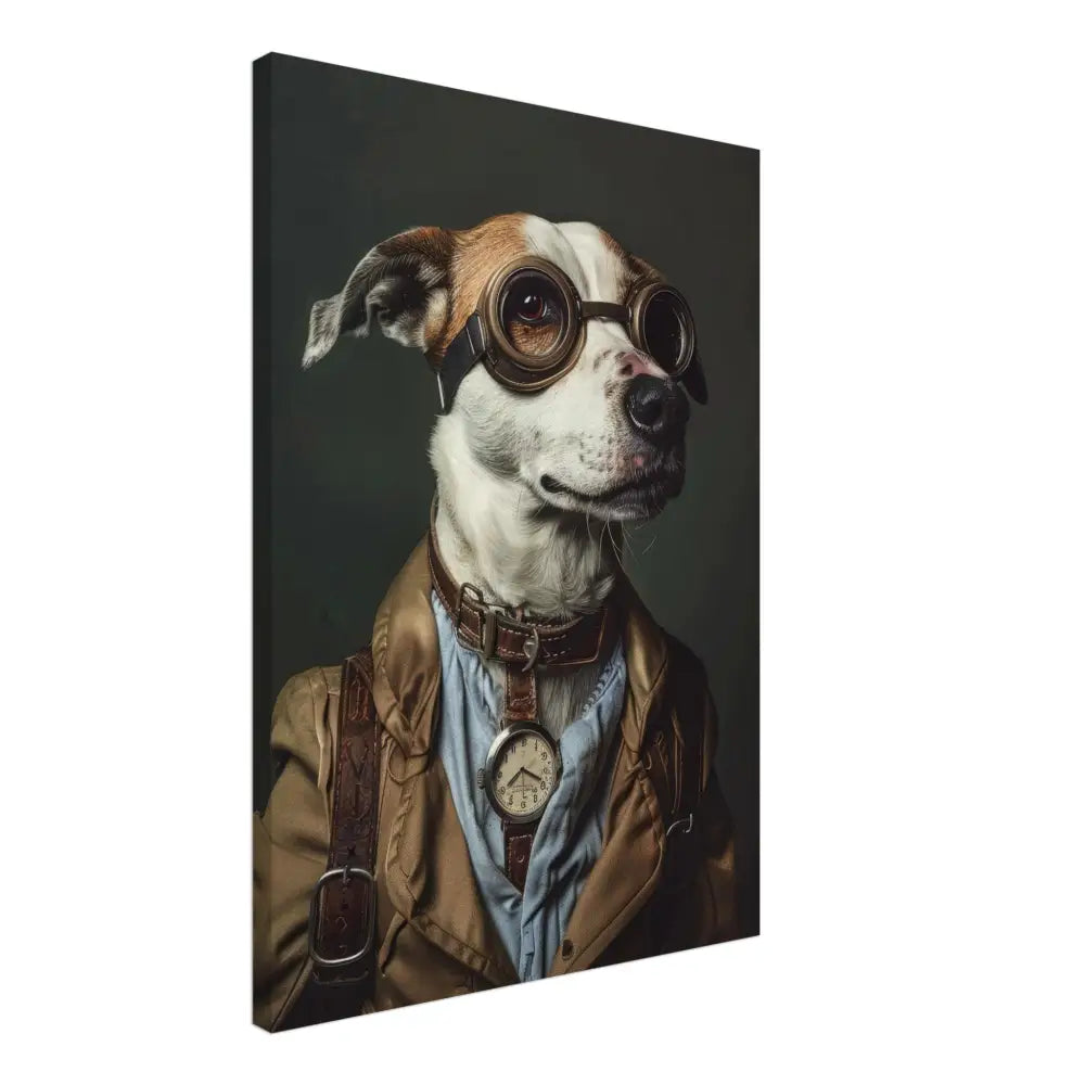 Deze afbeelding toont een hond, gekleed in een prachtige vintage steampunk outfit. Het draagt een elegante, bruine jas met subtiele, golvende patronen. Om de nek hangt een antieke, zilveren klok, die prachtig contrasteert met de donkere leren riem. De kop wordt gesierd door een paar grote, retro-futuristische brillen met bronzen metalen details, die de hond een avontuurlijke uitstraling geven. Het geheel wordt verder verfraaid door leren schouderriemen en subtiele stiksels die de outfit compleet maken. De afbeelding heeft een donkergrijze achtergrond, die de aandacht volledig op de stijlvolle hond richt.
