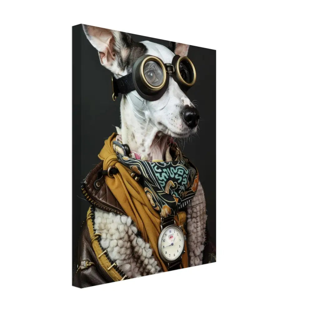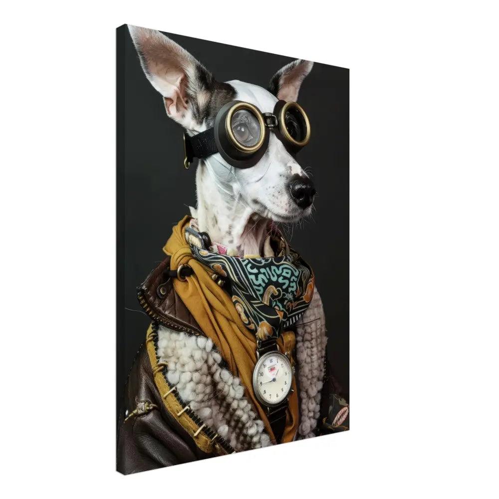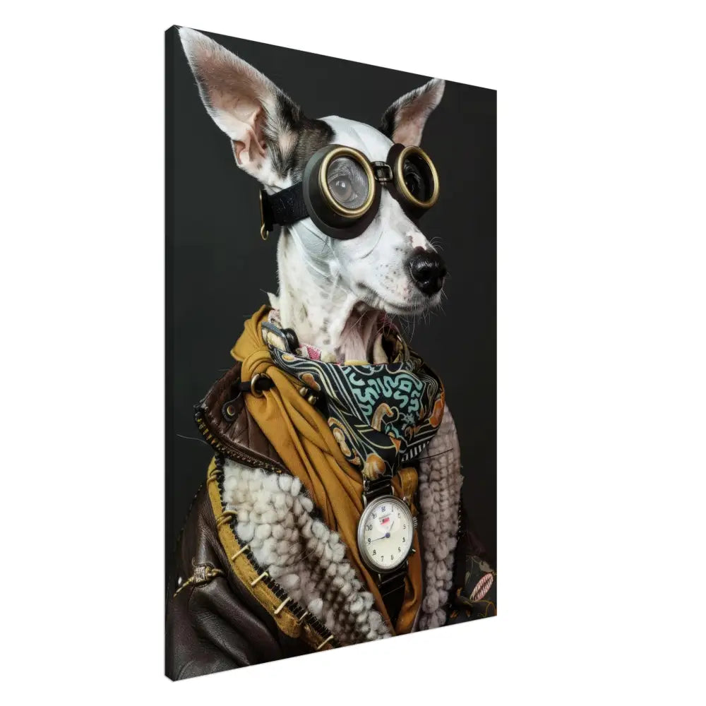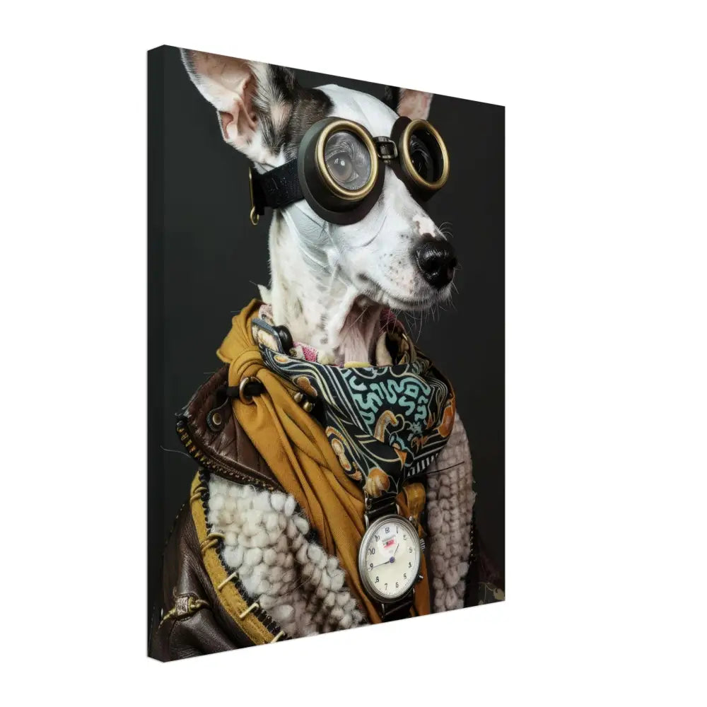 Deze afbeelding toont een dier, gekleed in een prachtige vintage steampunk outfit. Het draagt een statige, bruine leren jas met subtiele stiksels en harige accenten. Om de nek hangt een antieke klok met een zilveren kast, die het steampunk-thema kracht bijzet. De kop wordt benadrukt door een paar indrukwekkende, bronzen veiligheidsbrillen met robuuste metalen details. Daarnaast heeft het dier een sierlijke, kleurrijke sjaal om, die de outfit een levendige toets geeft. De weelderige bontachtige manchetjes en leren accenten maken het geheel af. De achtergrond is een donker, neutraal vlak dat de nadruk legt op de gedetailleerde en inventieve outfit van het dier.