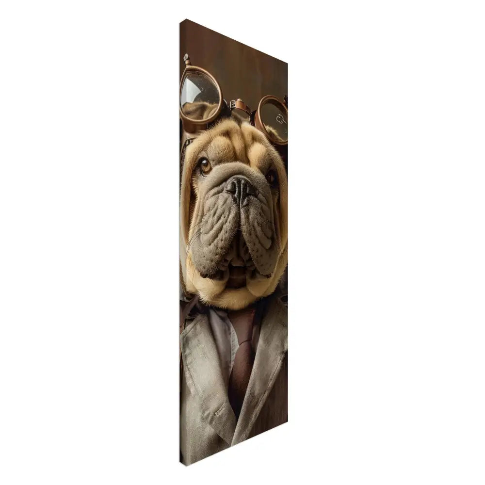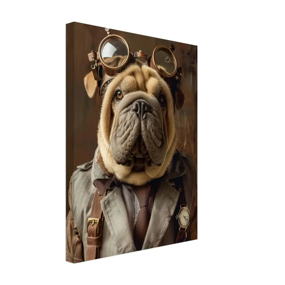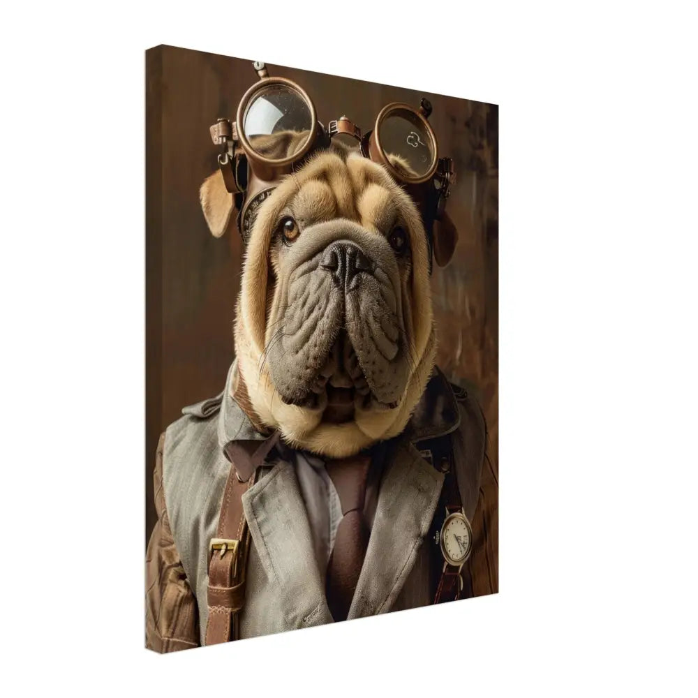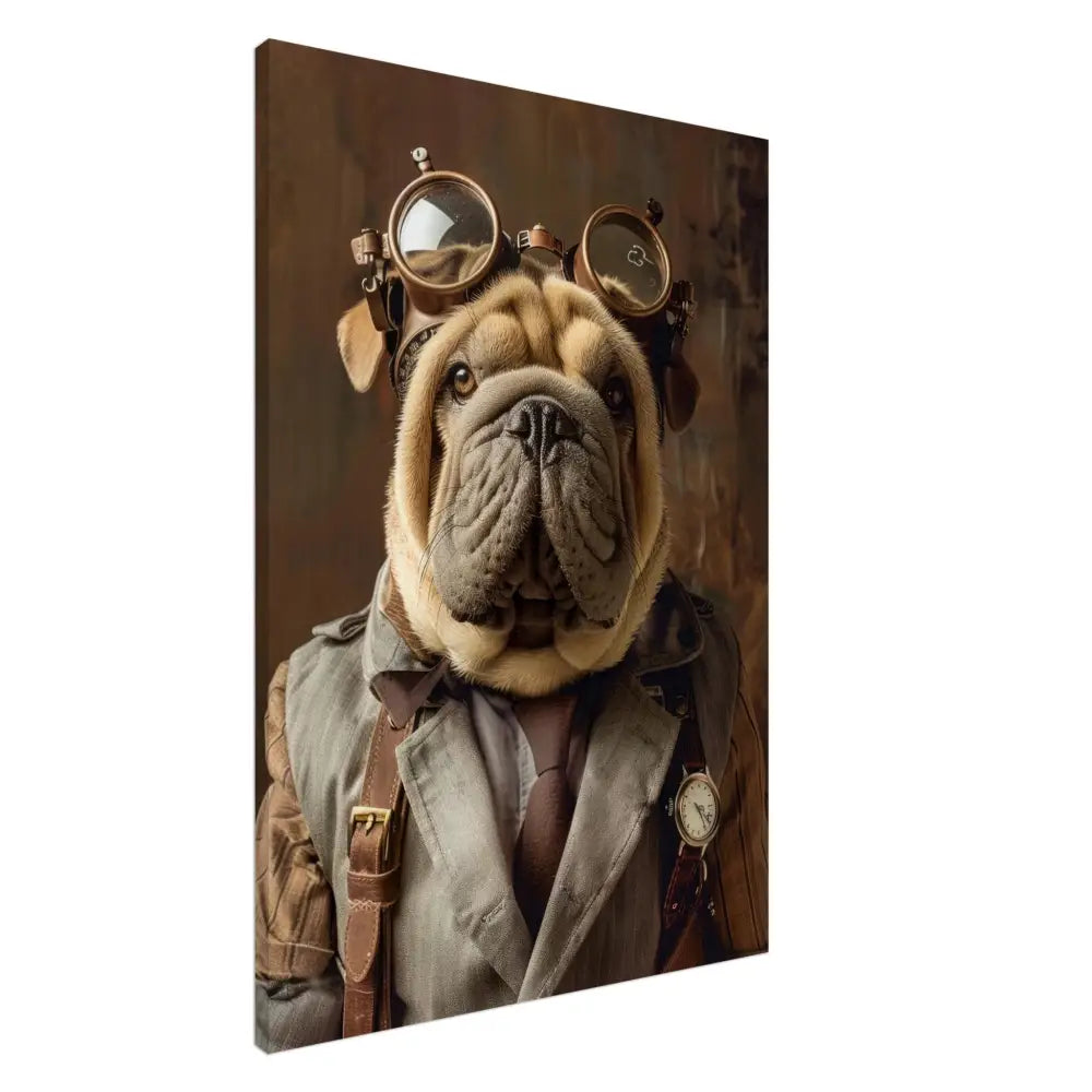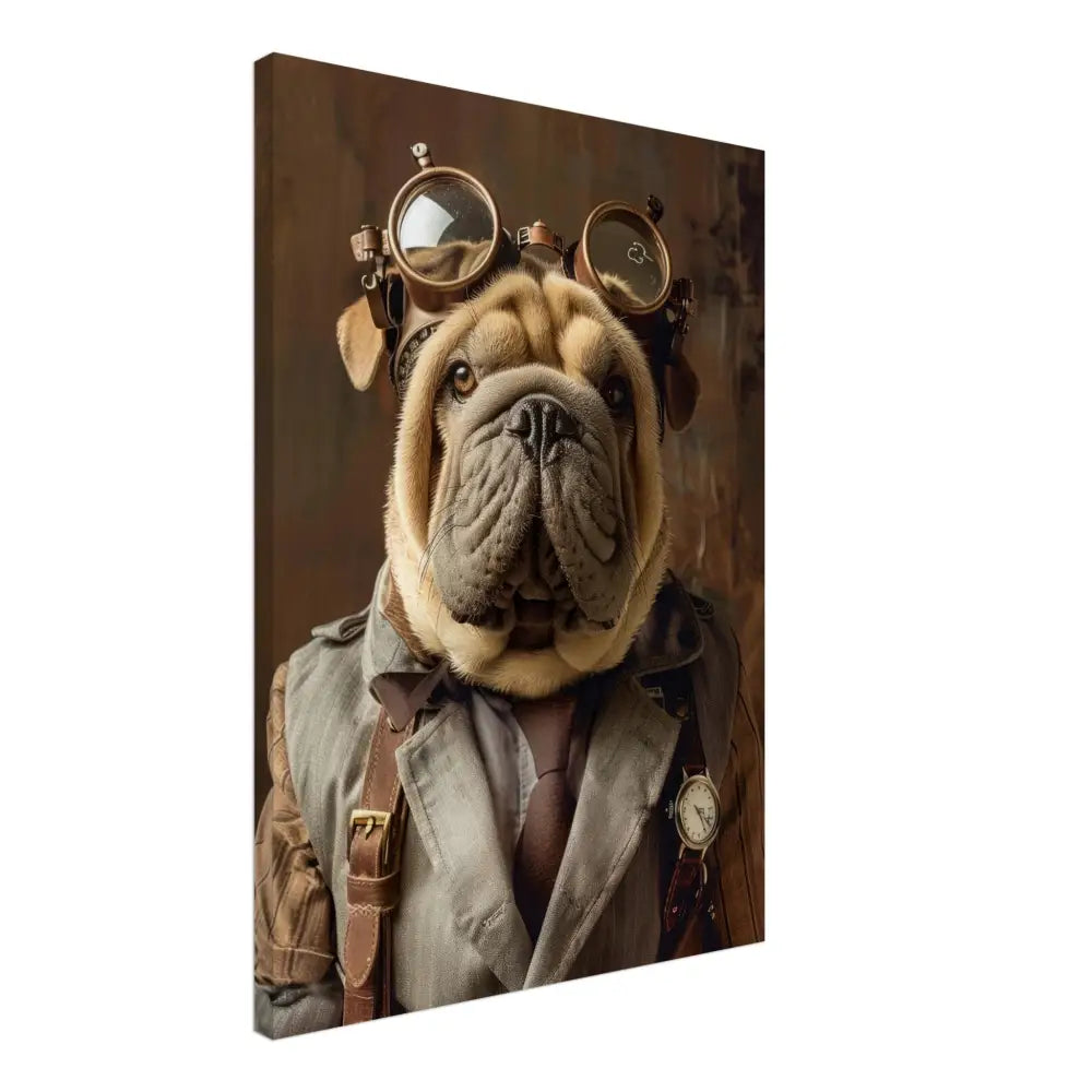 Deze afbeelding toont een dier, gekleed in een prachtige vintage steampunk outfit. Het draagt een gedetailleerde, grijze jas die een verfijnde uitstraling geeft met subtiele bruin-getinte accenten op de mouwen. Om de nek hangt een antieke zilveren klok, wat bijdraagt aan de historische ambiance van het geheel. Op het hoofd prijkt een opvallende retro-futuristische bril met robuuste, bronzen details, waardoor het dier een tijdreiziger lijkt. De accessoires worden gecompleteerd door elegante leren riemen die over de schouders hangen. De achtergrond is rustiek, met een aardse tint, wat het steampunk-thema perfect aanvult.