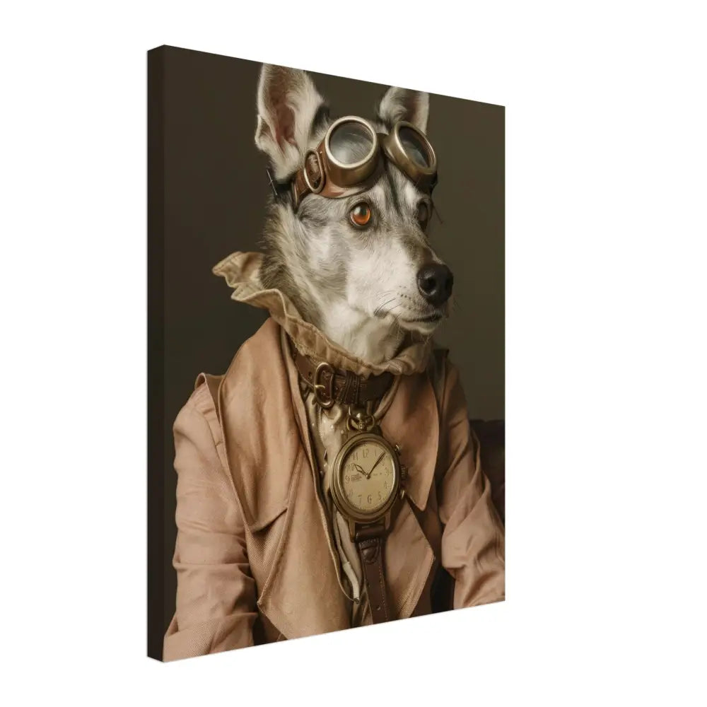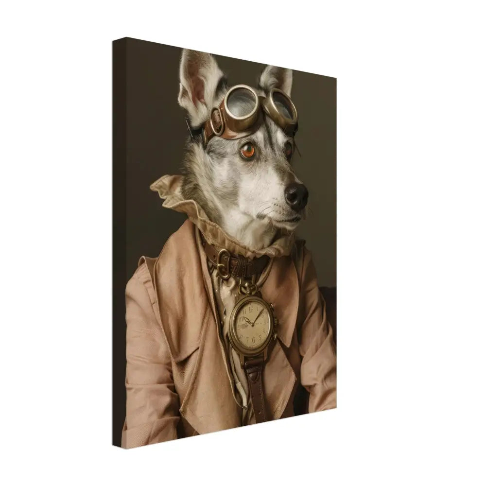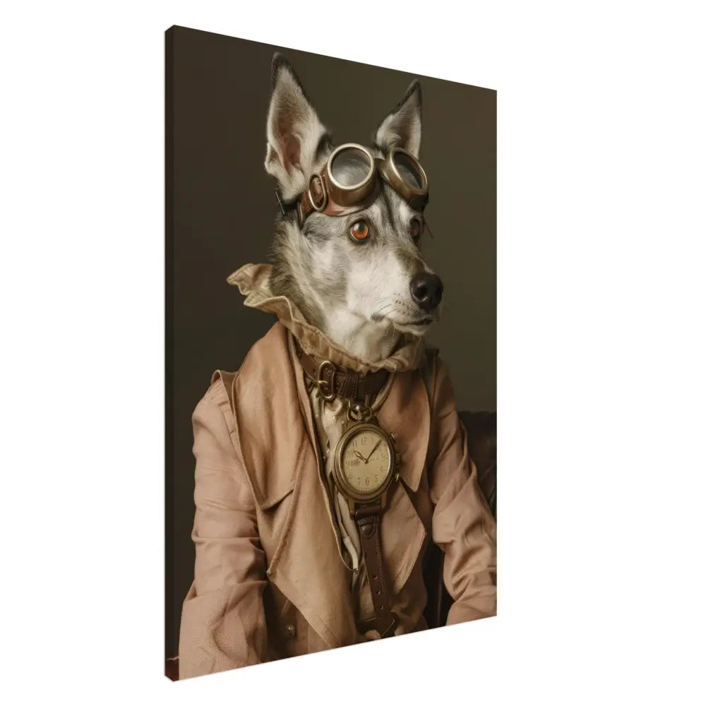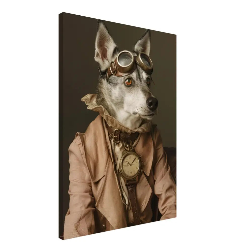 Deze afbeelding toont een dier, gekleed in een prachtige vintage steampunk outfit. Het draagt een elegante, lichtroze jas met subtiele plooien en delicate stiksels. Om de nek hangt een antieke gouden klok, die de tijdloze charme van het ensemble accentueert. De kop wordt geaccentueerd door een paar grote, retro-futuristische brillen met robuuste metalen details in bronzen kleur, wat de avontuurlijke uitstraling versterkt. De pootjes zijn afgewerkt met luxe, crèmekleurige manchetjes en leren accenten. De achtergrond is rustig gehouden in effen tinten, die het dier centraal stellen en het steampunk-thema benadrukken.