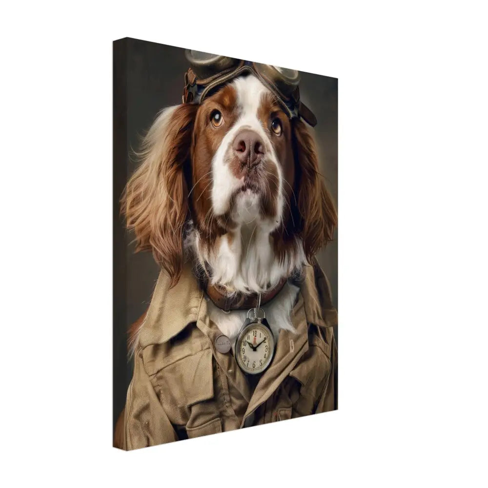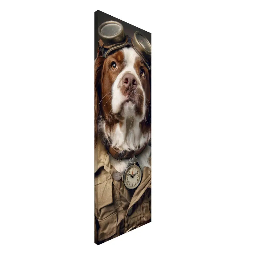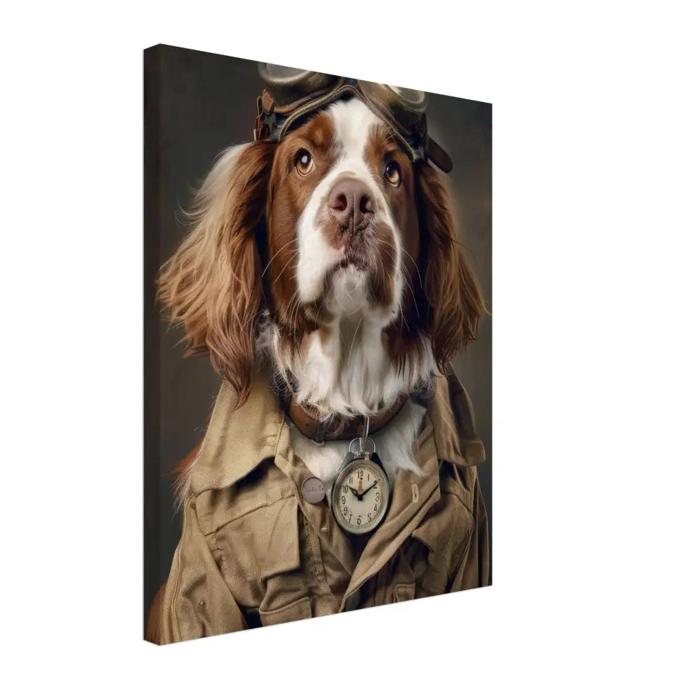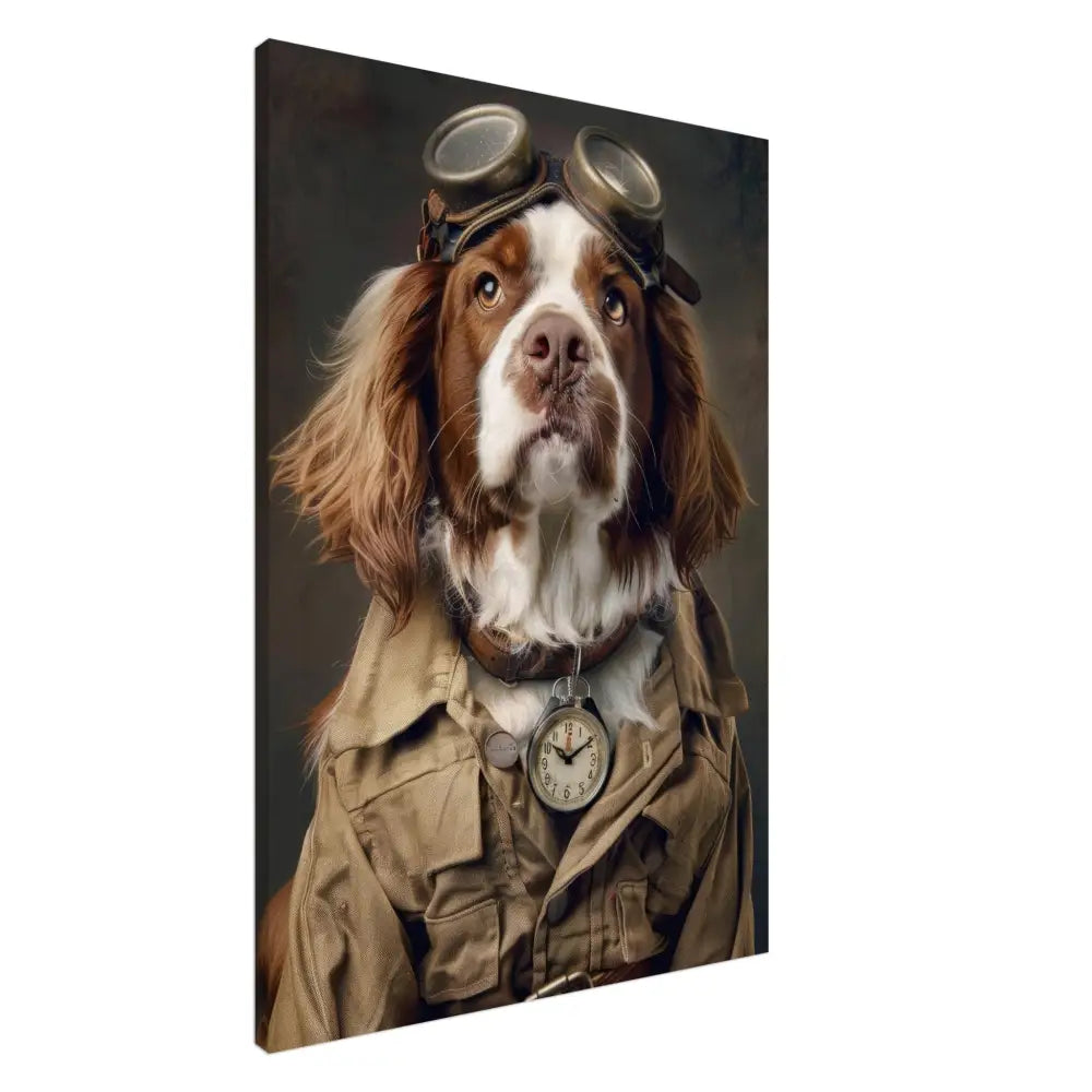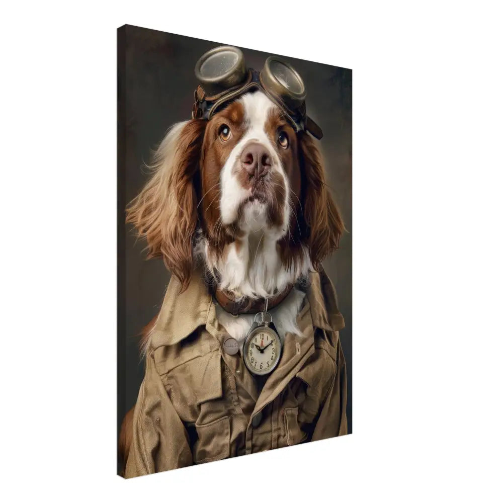 Deze afbeelding toont een hond, gekleed in een prachtige vintage steampunk outfit. De hond draagt een elegante, beige jas met zakken en subtiele stiksels die structuur toevoegen aan het ontwerp. Om de nek hangt een antieke zilveren klok, die perfect contrasteert met de warme tinten van de jas. Op het hoofd prijkt een groot paar retro-futuristische brillen met bronzen metalen details, wat de hond een gedistingeerde tijdreizigersuitstraling geeft. De pootjes zijn afgewerkt met bontachtige manchetjes en leren accenten. De achtergrond van de afbeelding is sfeervol gedecoreerd met donkere, industriële elementen, waardoor de steampunk sfeer compleet is.