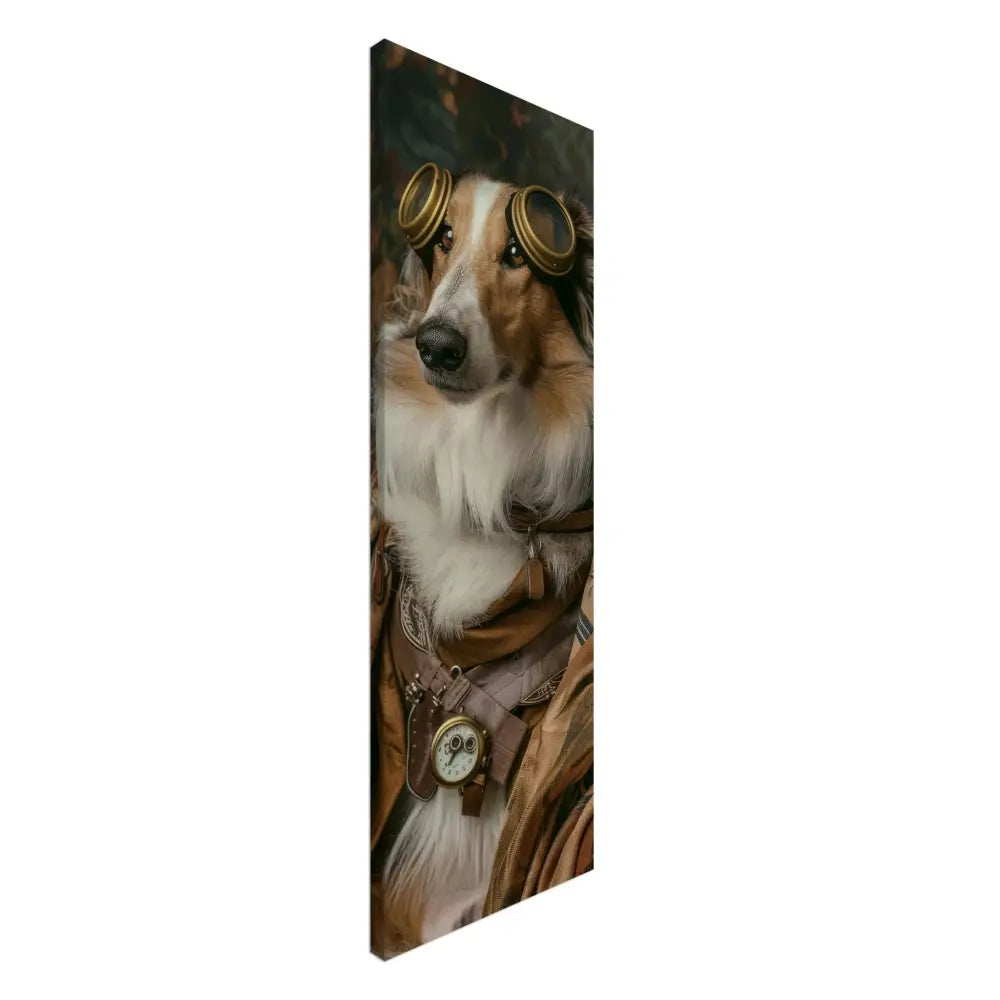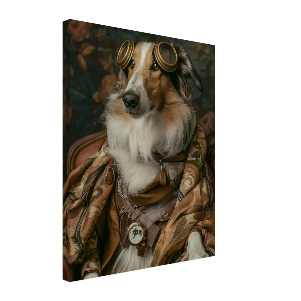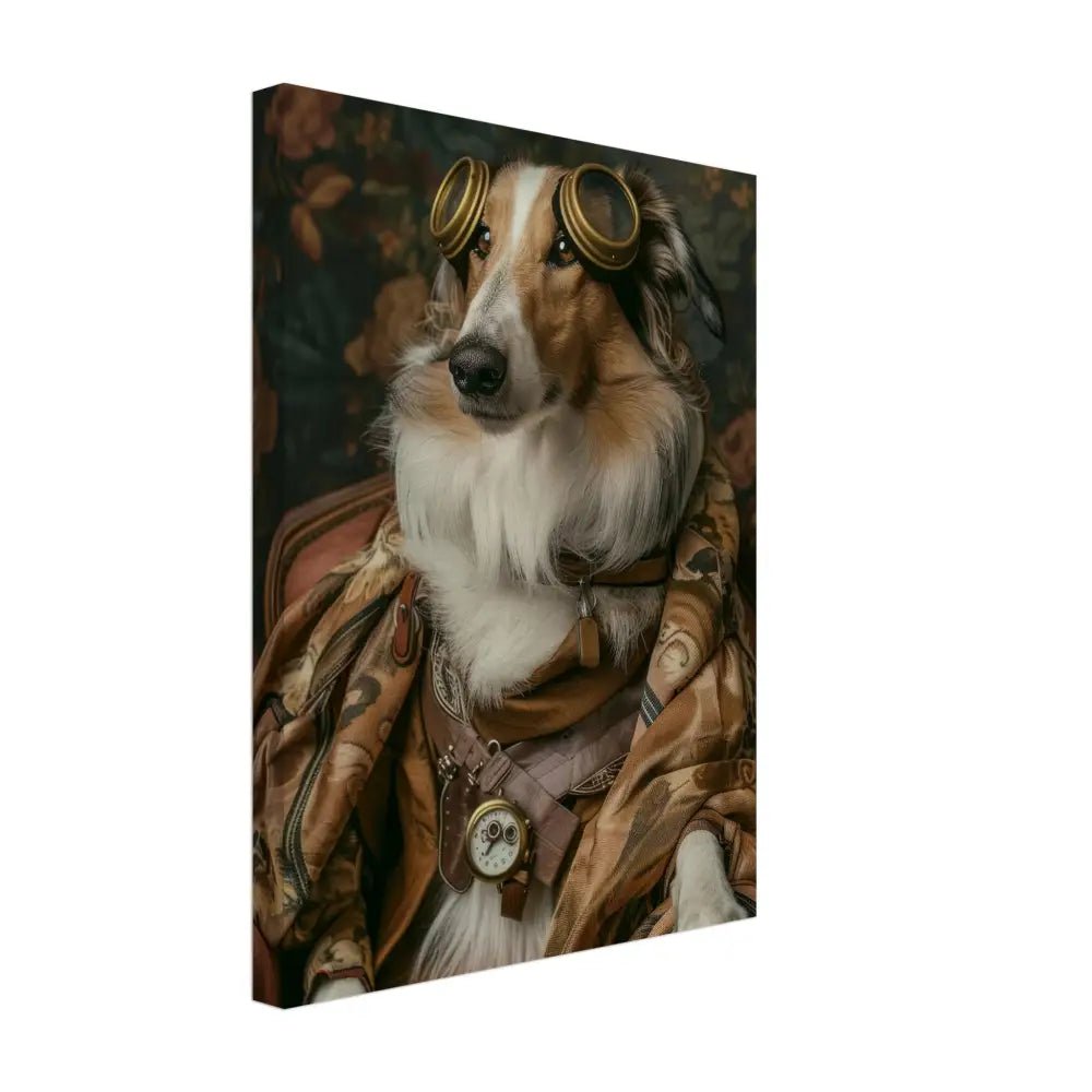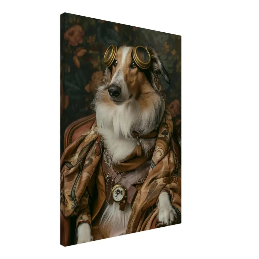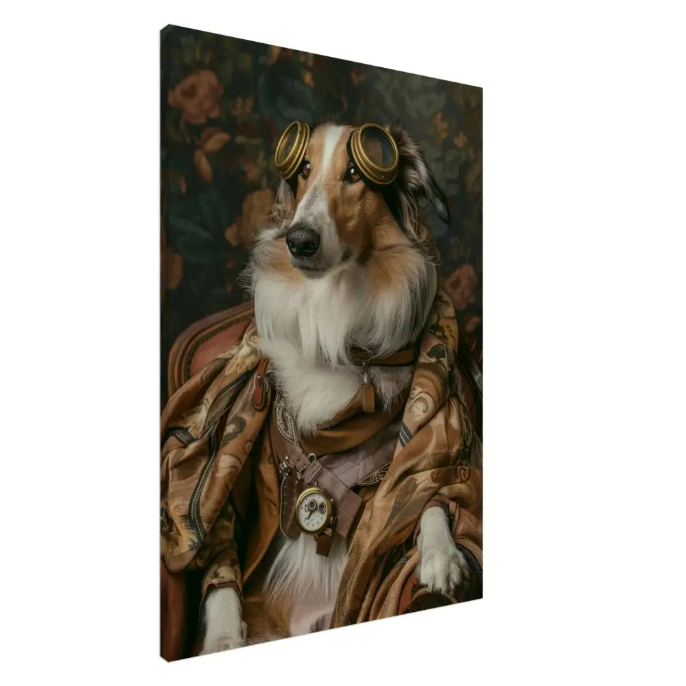 Deze afbeelding toont een dier, gekleed in een prachtige vintage steampunk outfit. Het draagt een rijk gedecoreerde, okergele jas met ingewikkelde patronen en gecapitonneerde accenten. Om de nek hangt een antieke bronzen klok, die de historische allure versterkt. De kop wordt gesierd door een paar grote, retro-futuristische brillen met metalen details in gouden tinten, waardoor deze eruitziet als een avontuurlijke tijdreiziger. De pootjes zijn voorzien van elegante, beigekleurige bontachtige manchetjes die het geheel afmaken. De afbeelding wordt extra sfeervol door de achtergrond gevuld met een weelderig bloemenpatroon.