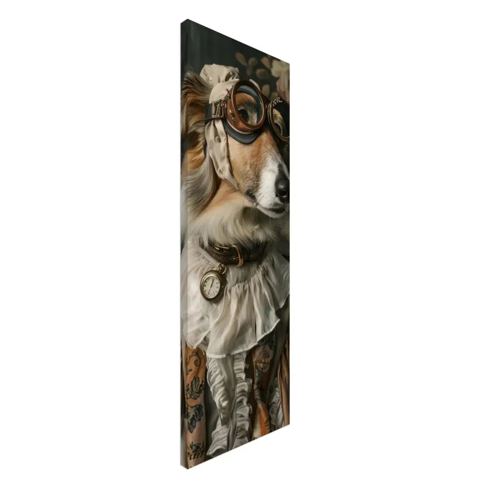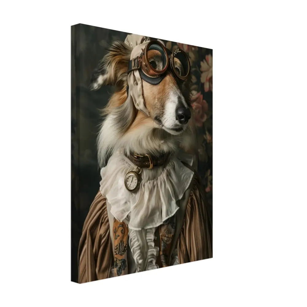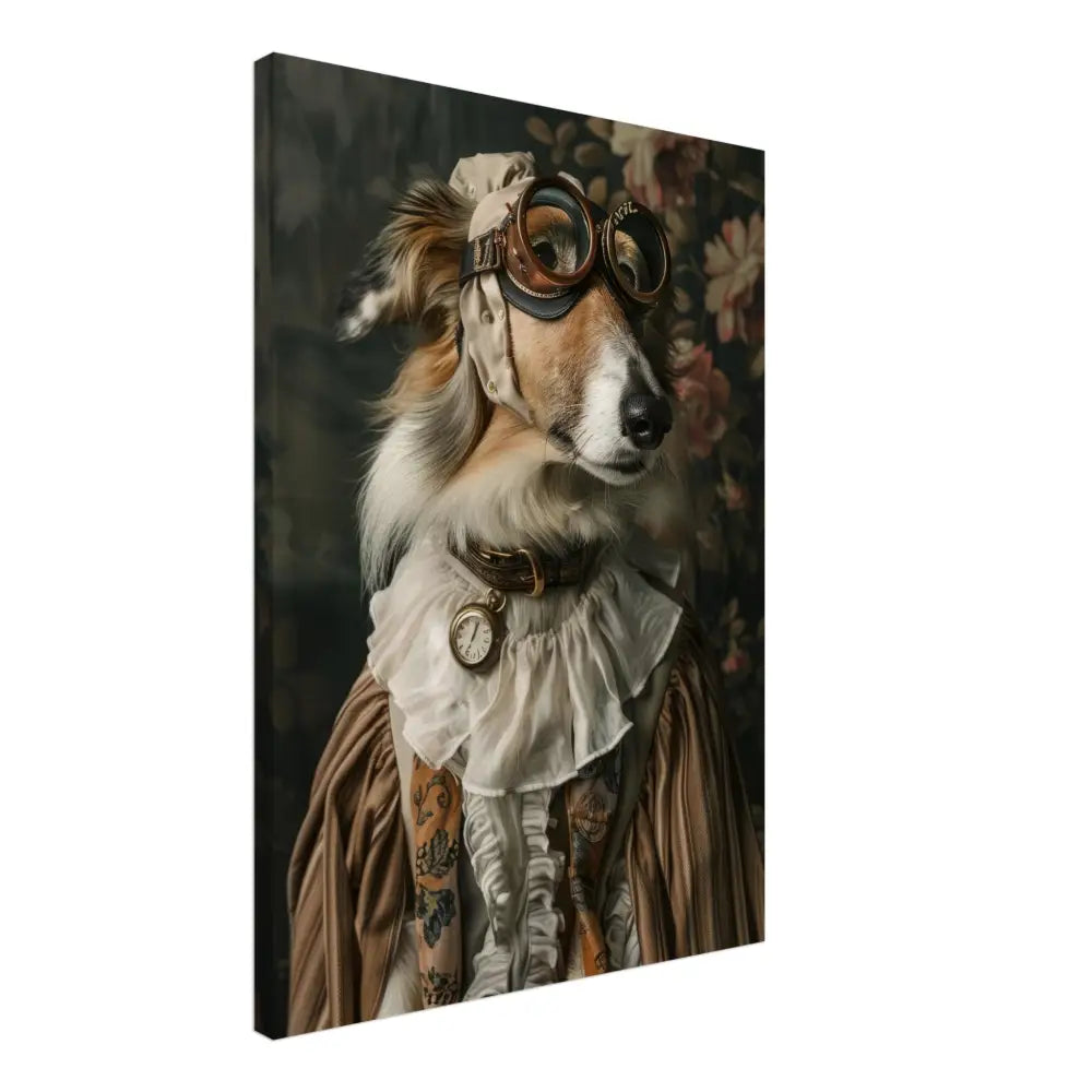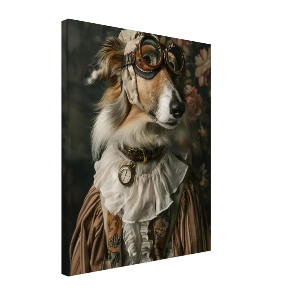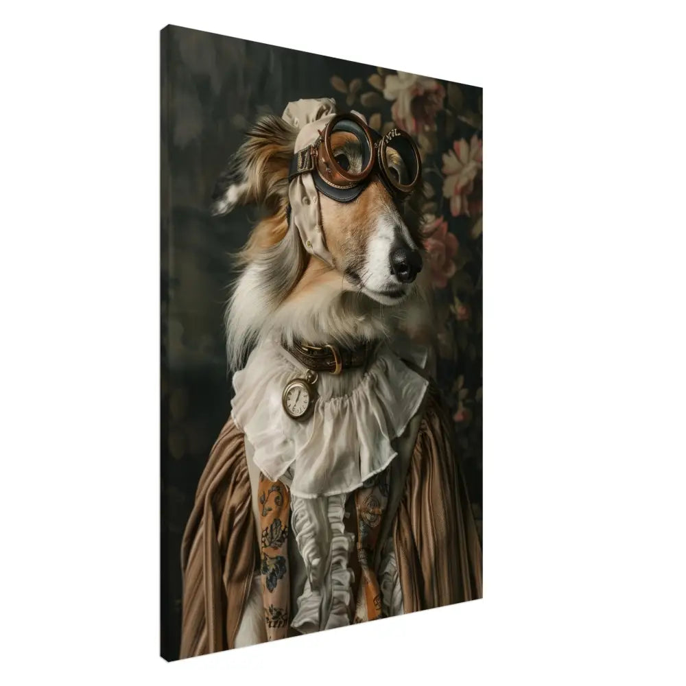 Deze afbeelding toont een dier, gekleed in een prachtige vintage steampunk outfit. Het draagt een stijlvolle, beige jas met subtiele patronen en fluweelachtige accenten. Om de nek hangt een antieke zilveren klok, die elegant op zijn borst rust. Op het hoofd van het dier prijkt een paar robuuste, bronzen brillen met gedetailleerde metalen randen, wat een authentieke, futuristische uitstraling geeft. De voorpoten zijn versierd met weelderige, witte bontachtige manchetjes en leren accenten met contrasterende stiksels. De achtergrond is voorzien van een artistiek bloemenbehang, wat de charme en elegantie van het portret benadrukt.