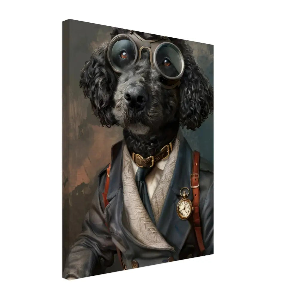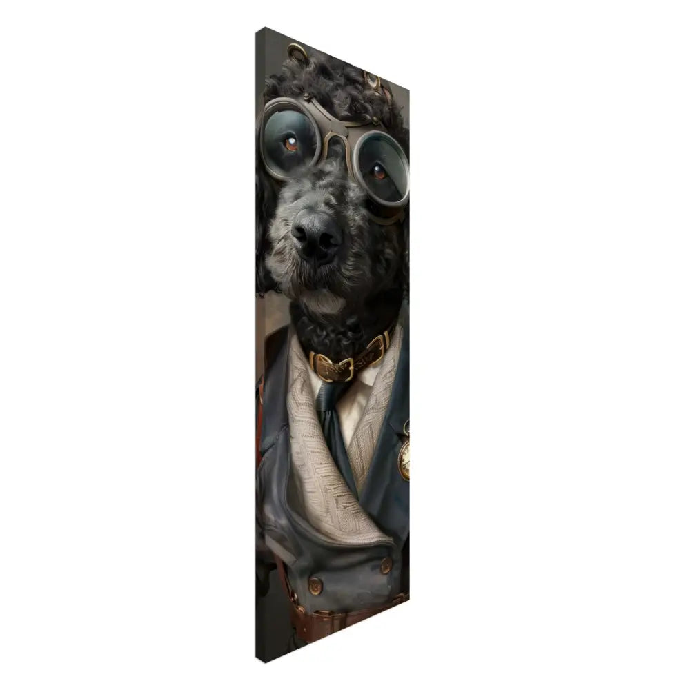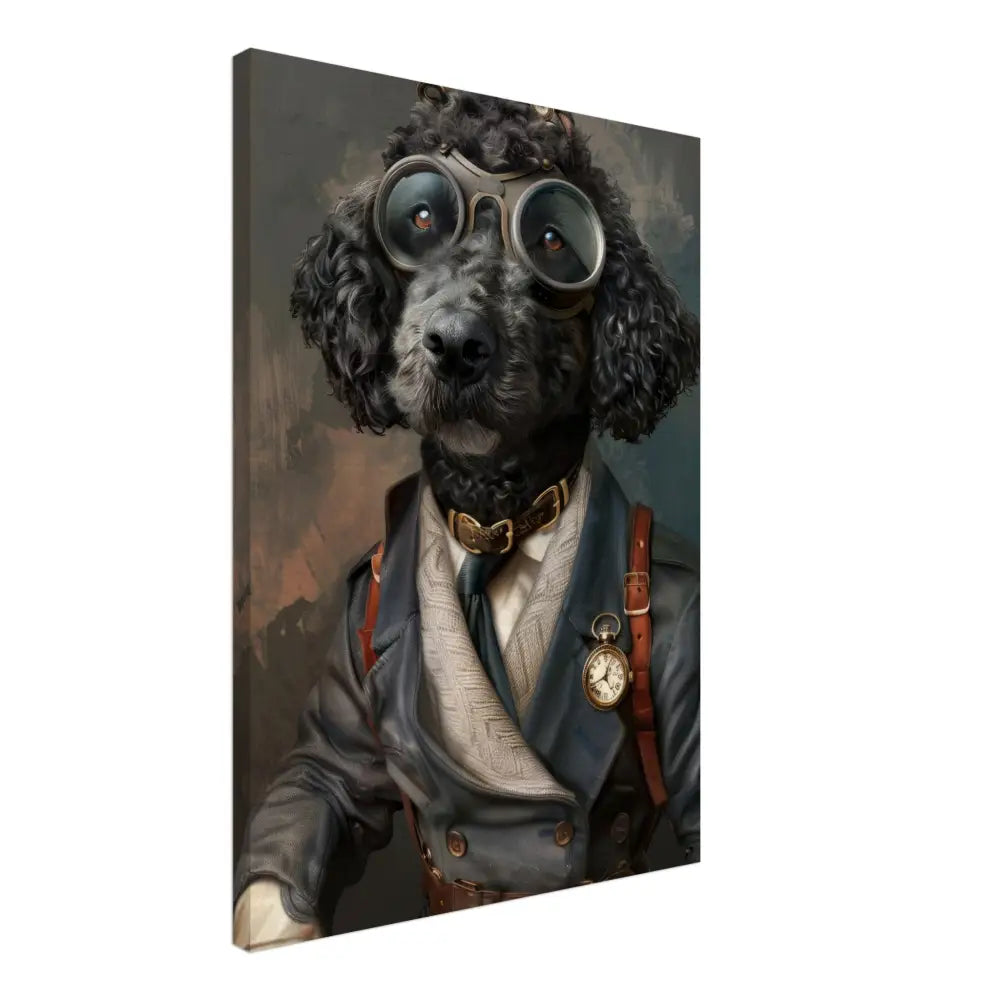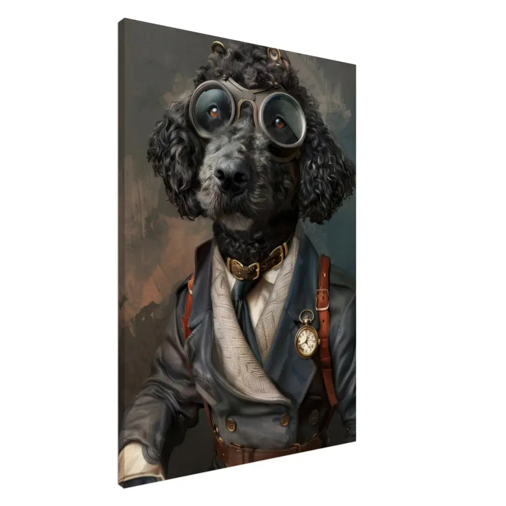 Deze afbeelding toont een dier, gekleed in een prachtige vintage steampunk outfit. Het draagt een elegante, donkergrijze jas met subtiele patronen en contrasterende leren accenten. Om de nek hangt een antieke gouden klok, die een verfijnde look geeft. De kop wordt gesierd door een set grote, futuristische brillen met metalen details in bronskleur, waardoor het dier een avontuurlijke tijdreiziger lijkt. De pootjes zijn voorzien van chique, witte bontachtige manchetjes die perfect samenkomen met het ingewikkelde stikwerk. De achtergrond, met zijn rustieke, bewerkte tonen, versterkt de steampunk-ambiance, waardoor de afbeelding een nostalgische sfeer krijgt.