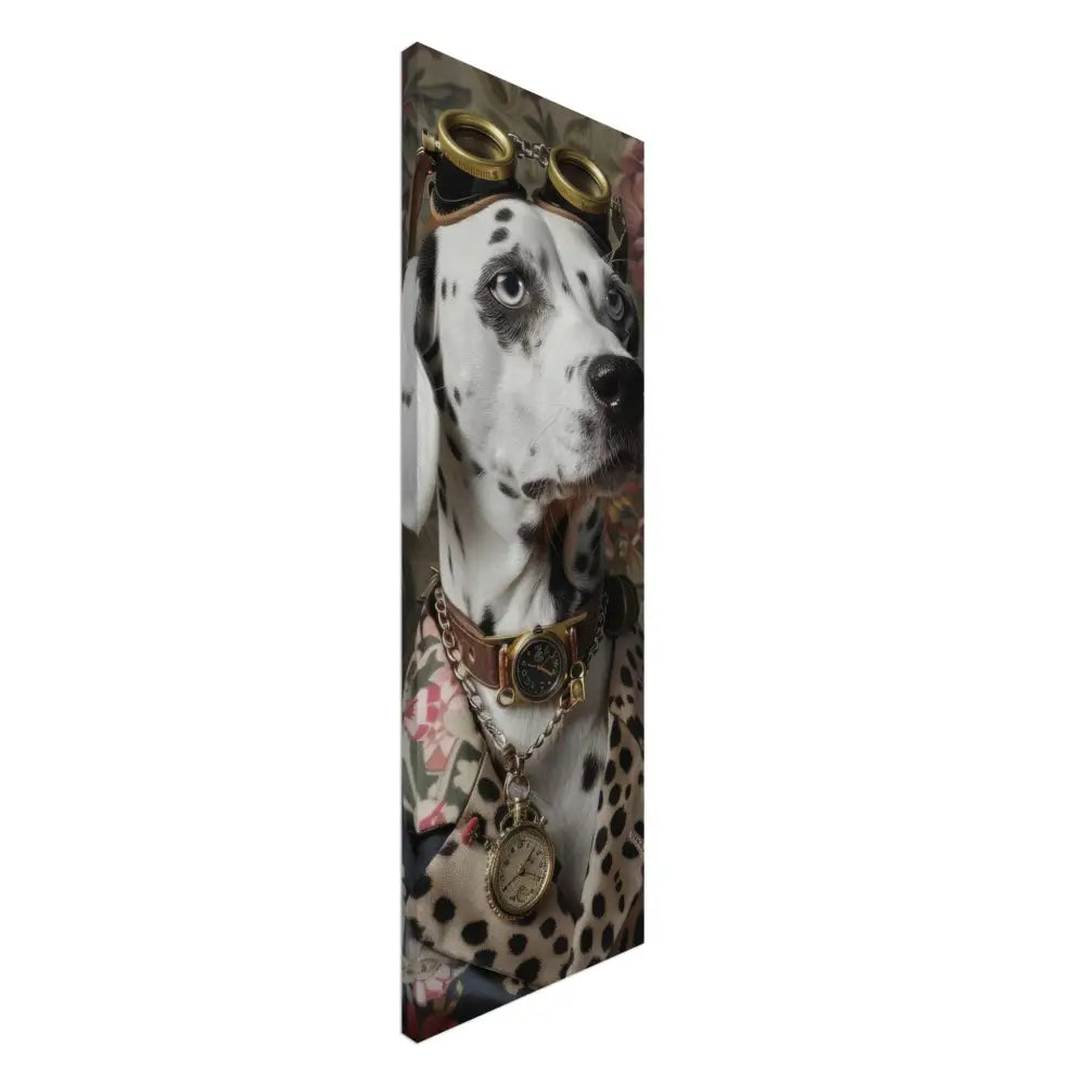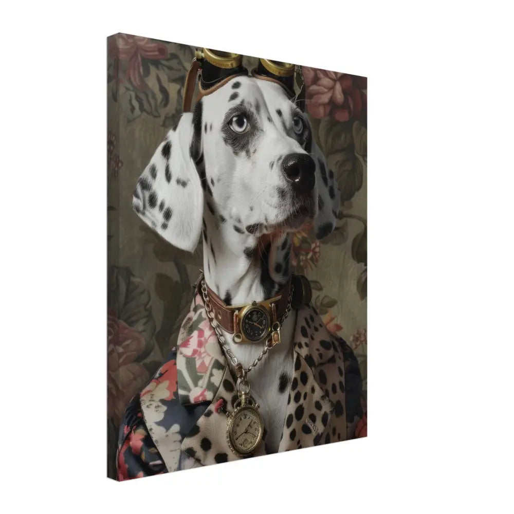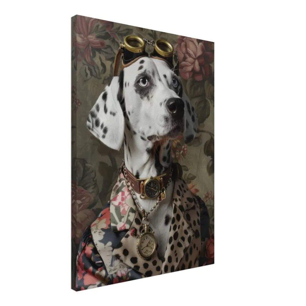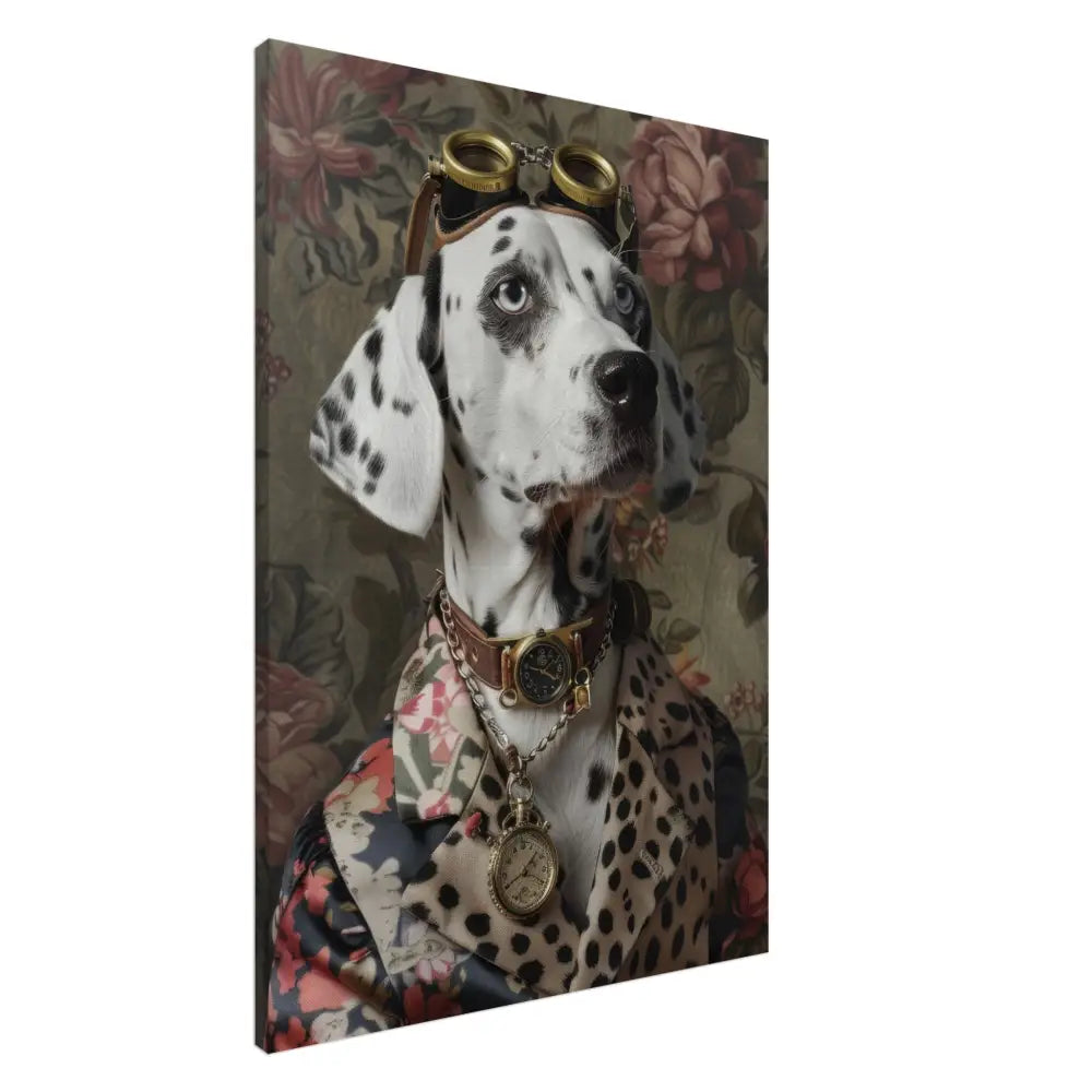 Deze afbeelding toont een dier, gekleed in een prachtige vintage steampunk outfit. Het draagt een sierlijke, veelkleurige jas met een combinatie van bloemenpatronen en polka-dot accenten. Om de nek hangt een antieke gouden klok, die de aristocratische uitstraling versterkt. De kop wordt gesierd door een paar grote, retro-futuristische brillen met glanzende, messing metalen details, waardoor deze eruitziet als een avontuurlijke tijdreiziger. De pootjes zijn voorzien van elegante leren bandjes met contrasterende stiksels die het geheel afmaken. De achtergrond bestaat uit een weelderig, bloemrijk tapijt dat een romantische sfeer toevoegt.