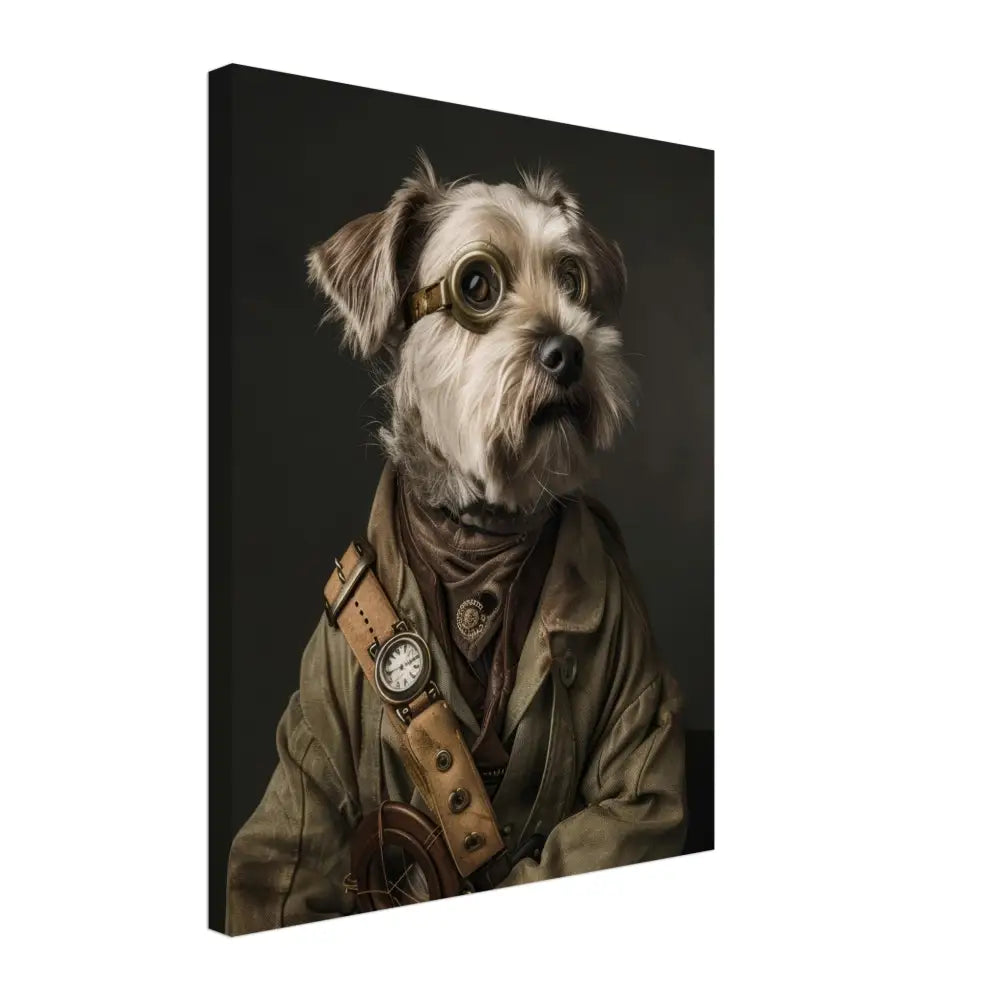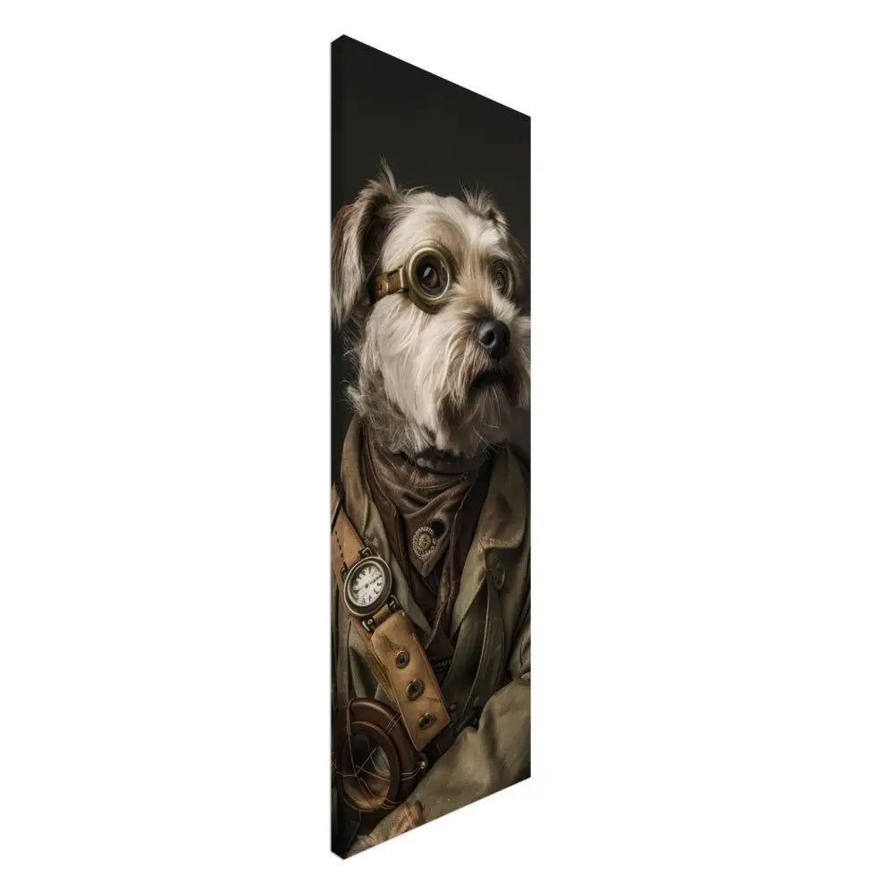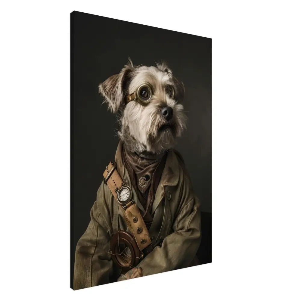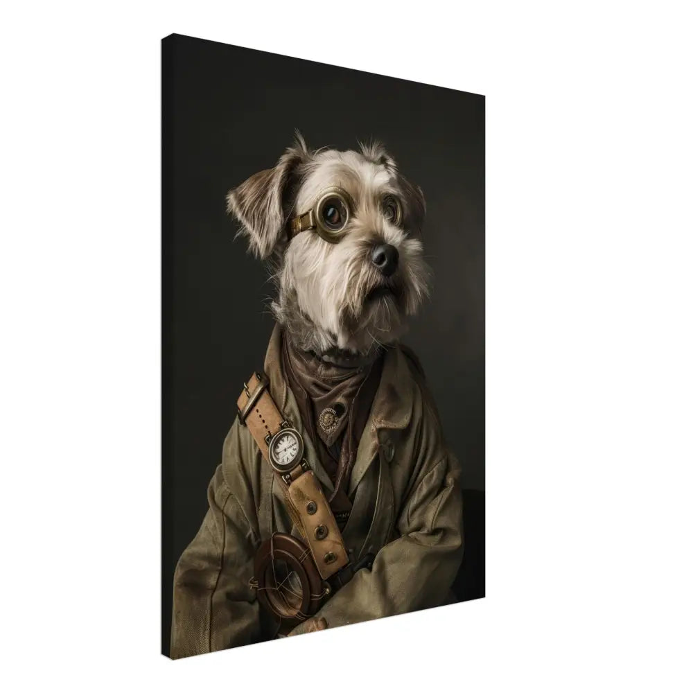 Deze afbeelding toont een hond, gekleed in een prachtige vintage steampunk outfit. Het draagt een stoere, khaki-kleurige jas met subtiele leren accenten en koperen knopen. Om de nek hangt een antieke bronzen klok, die zijn verkennerachtige uitstraling versterkt. De kop wordt gesierd door een paar grote, retro-futuristische brillen met metalen details in gouden tinten, waardoor hij eruitziet als een dappere avonturier. De pootjes zijn voorzien van elegante, beige bontachtige manchetjes met contrasterende stiksels die het geheel afmaken. De achtergrond van de afbeelding is donker en mysterieus, wat de steampunk sfeer prachtig complimenteert.