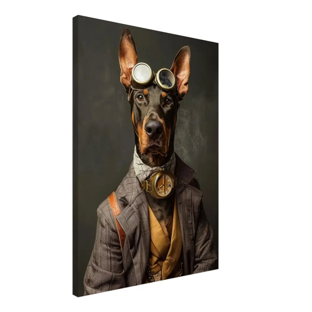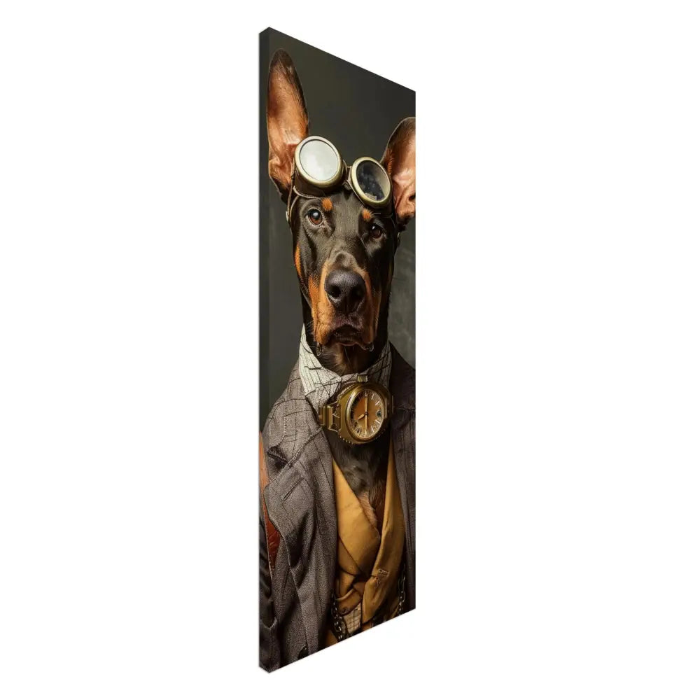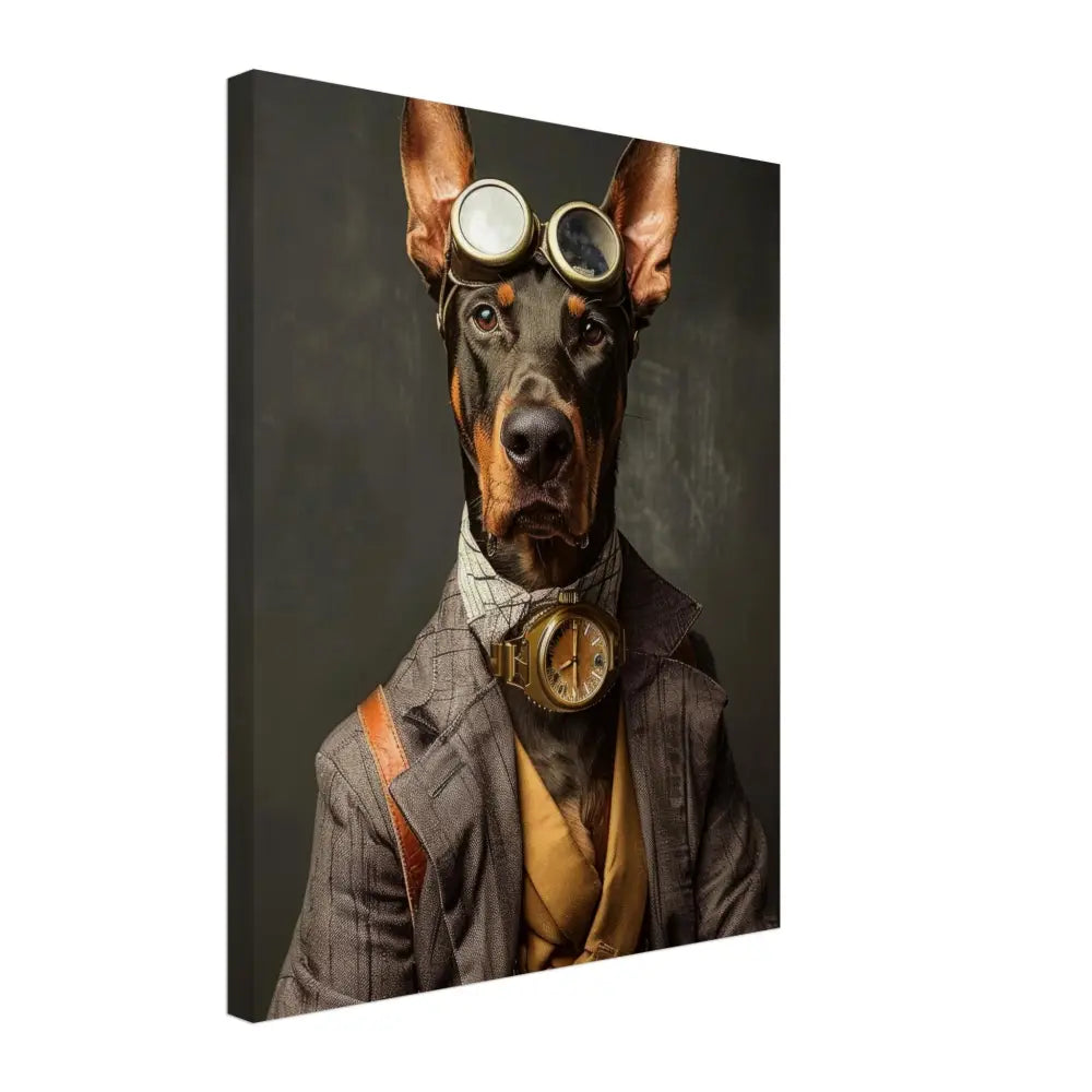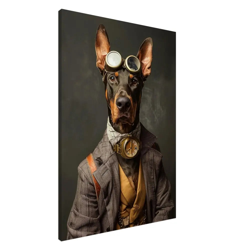 Deze afbeelding toont een dier, gekleed in een prachtige vintage steampunk outfit. Het draagt een verfijnde grijze jas met subtiele, verticale strepen en leren accenten op de schouders. Om de nek hangt een opvallende, antieke gouden klok, die schittert tegen de achtergrond van de sobere tinten van de jas. De kop van het dier wordt gesierd door een grote, retro-futuristische bril met metalen details in een robuuste bronskleur. De pootjes hebben verfijnde, bruinachtige leren manchetjes, voorzien van contrasterende, zwarte stiksels. De achtergrond is een dof, industrieel doek dat de steampunk esthetiek versterkt en het geheel een mysterieuze sfeer geeft.