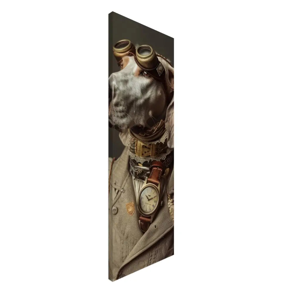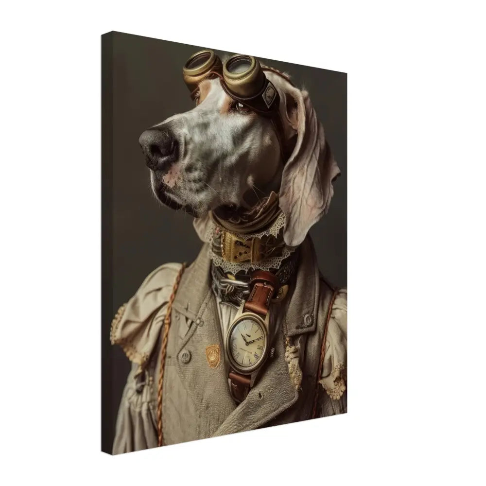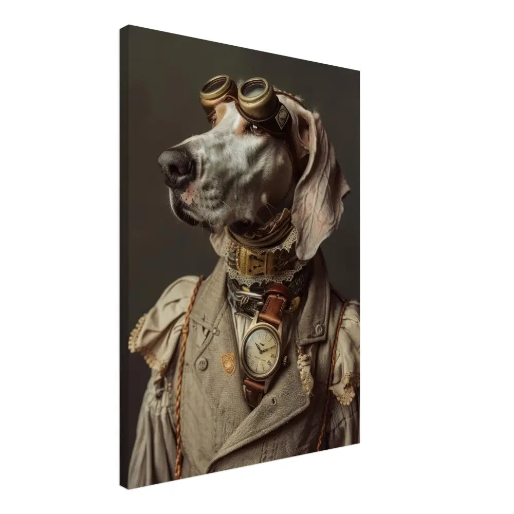 Deze afbeelding toont een dier, gekleed in een prachtige vintage steampunk outfit. Het draagt een elegante, beige jas met subtiele patronen en verfijnde kantafwerkingen. Om de nek hangt een antieke, gouden klok met een leren band, wat een vleugje klassiek raffinement toevoegt. De kop van het dier wordt gesierd door een paar robuuste, bronzen retro-futuristische brillen met verweerde metalen details die het beeld compleet maken. Daarnaast zijn er leren accenten en contrasterende stiksels zichtbaar, wat een extra laag van intrigerend detail toevoegt. Op de achtergrond is een zachte, neutrale kleurstelling die de focus op het majestueuze dier houdt.