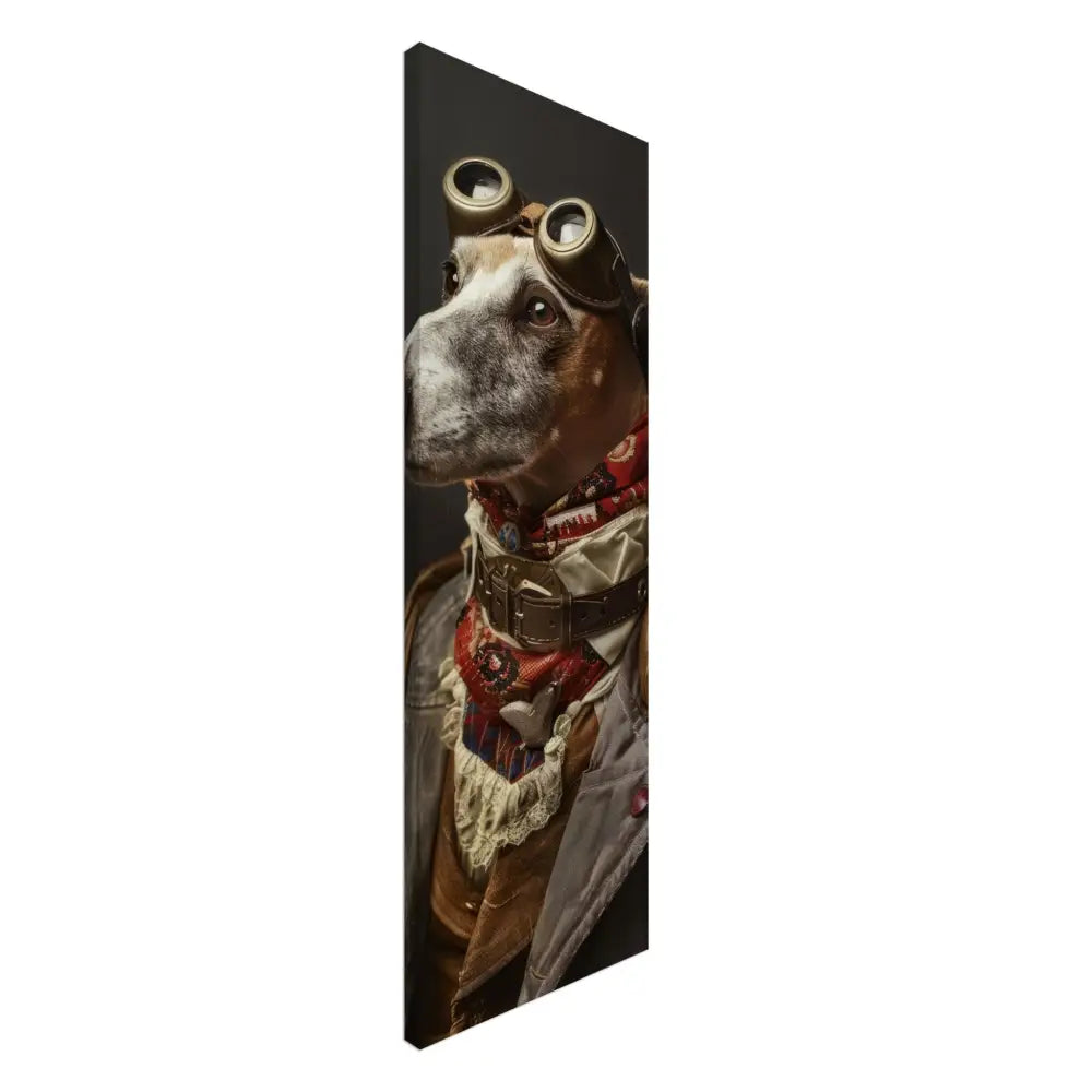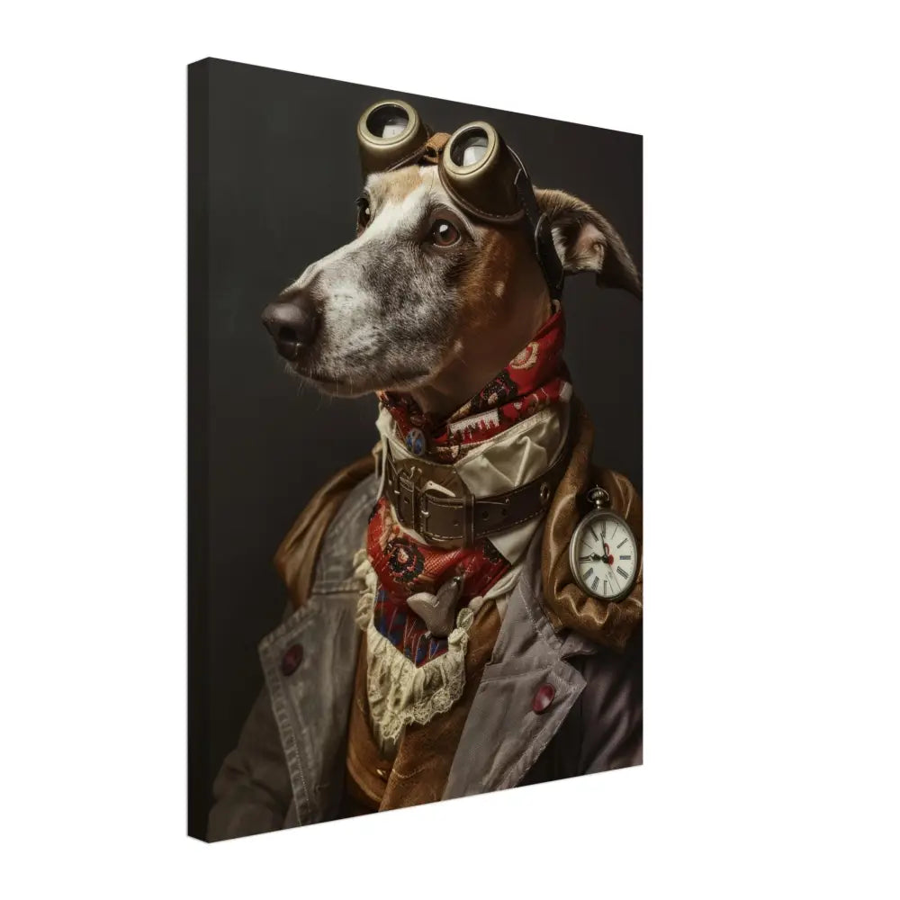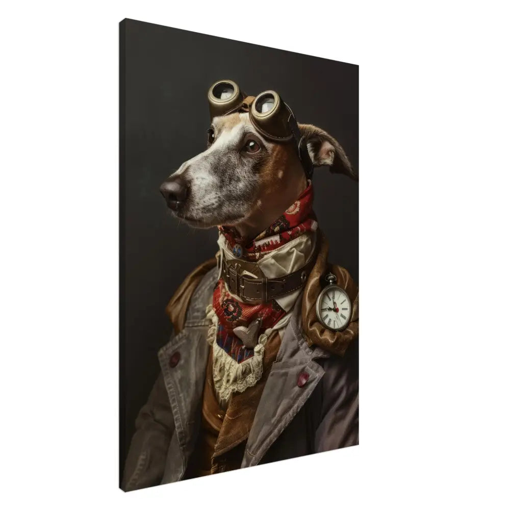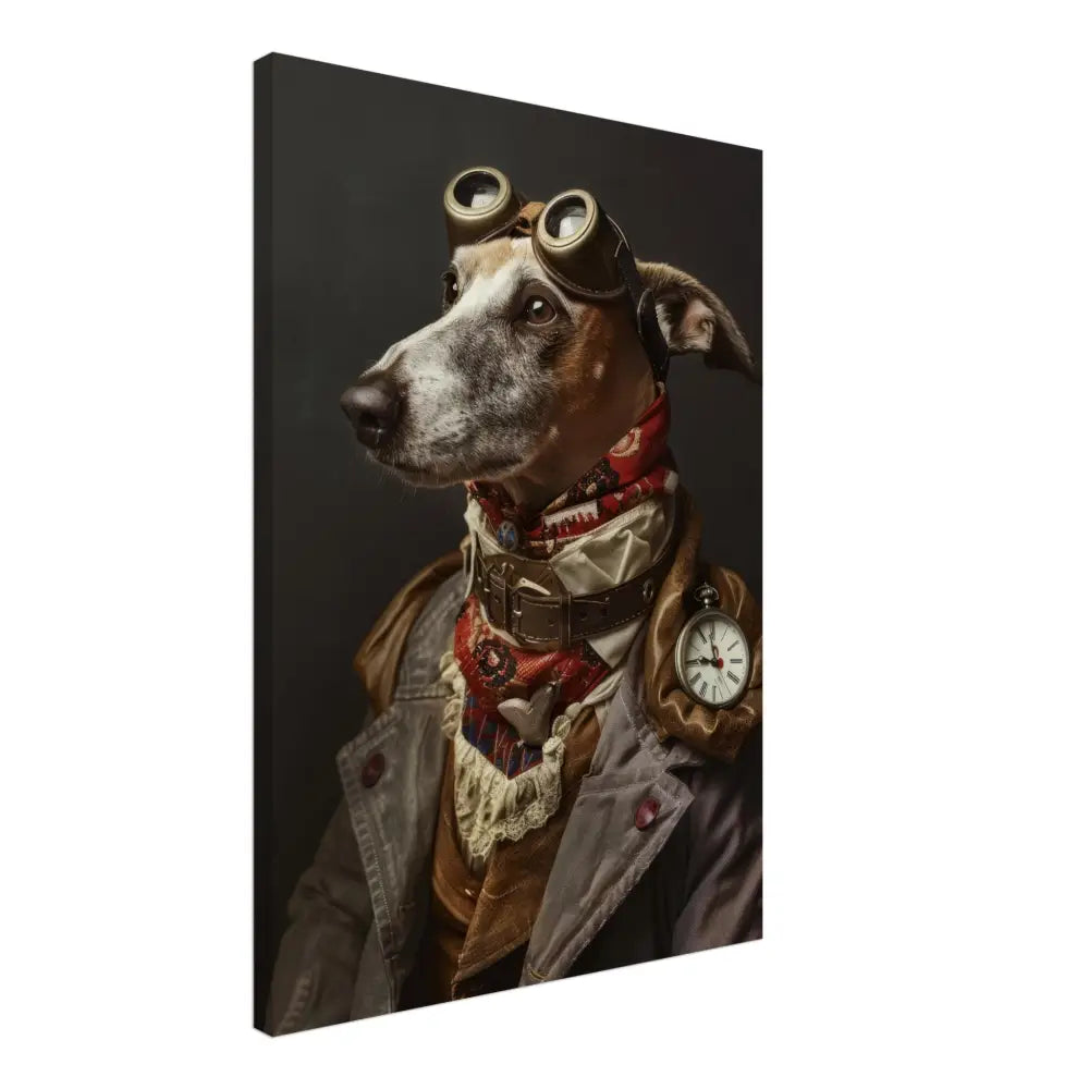 Deze afbeelding toont een elegant dier, gekleed in een prachtige vintage steampunk outfit. Het draagt een grijze jas met rijke, bruine accenten en gedetailleerde stiksels, die een oude maar verfijnde uitstraling geven. Om de nek hangt een antieke zilveren zakhorloge, wat een vleugje nostalgie toevoegt aan de look. Op het hoofd prijkt een paar grote, bronzen bril met ingewikkelde metalen details, die een futuristische flair geven. De pootjes zijn afgewerkt met elegant, wit kant en leren accessoires, wat een perfecte balans tussen stijl en avontuur creëert. De achtergrond is donker en eenvoudig, waardoor de focus volledig op het prachtig geklede dier ligt.