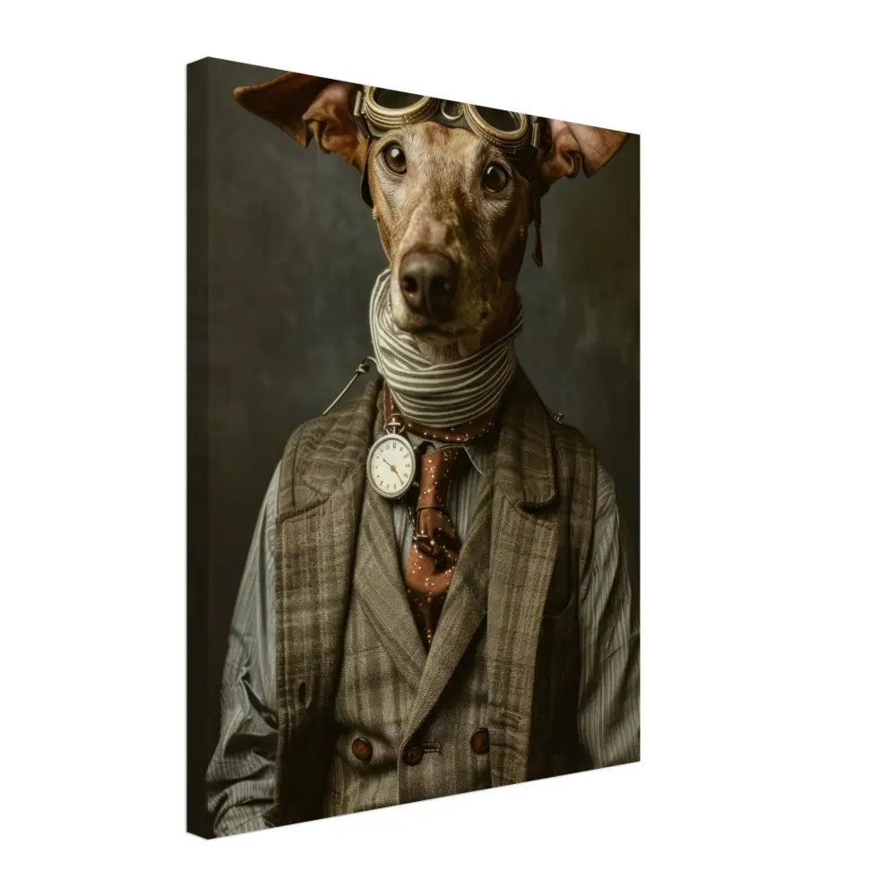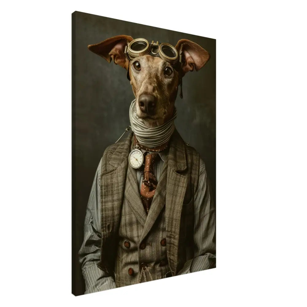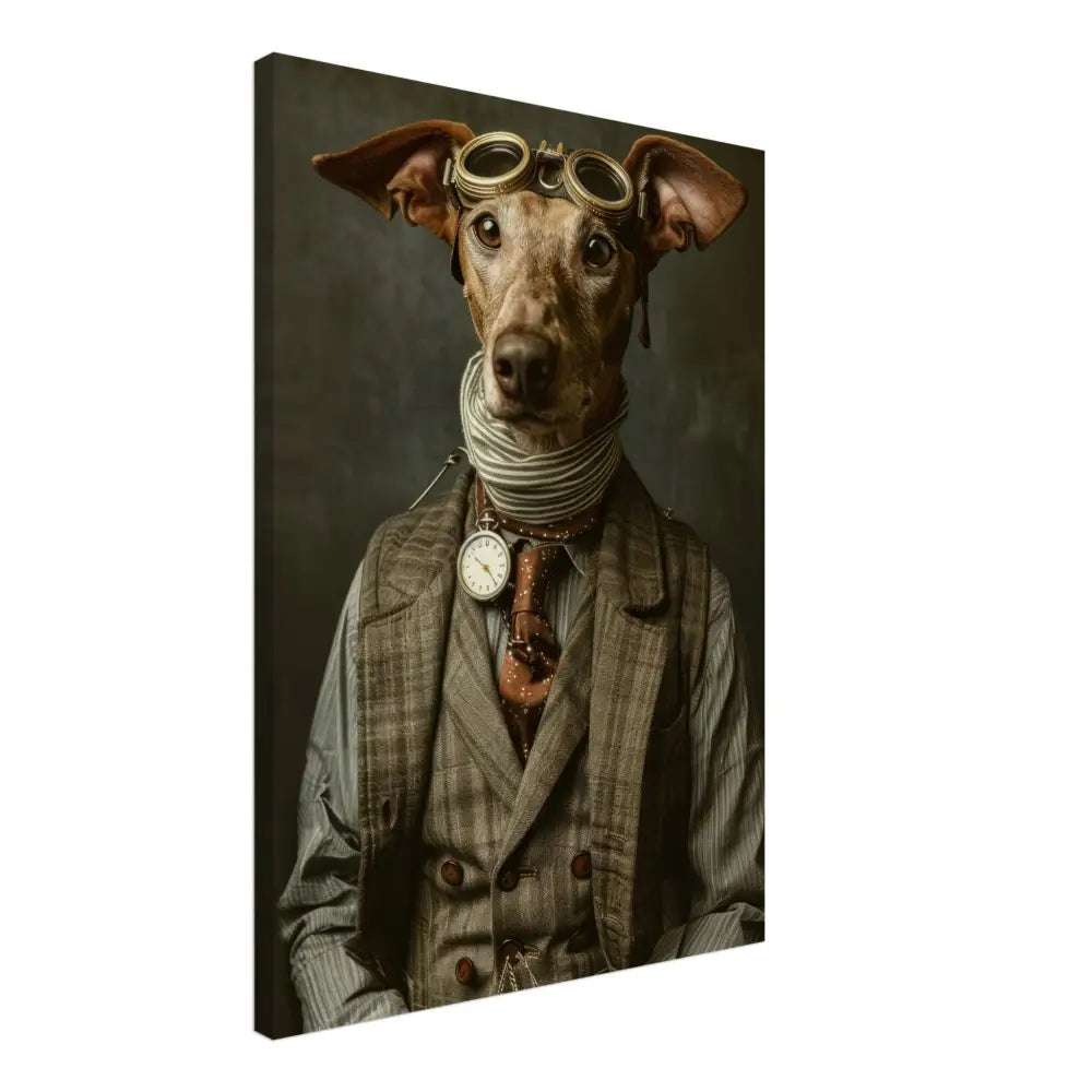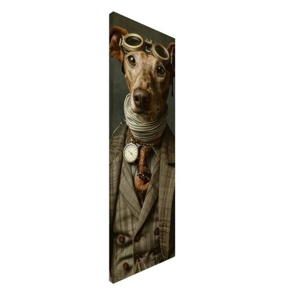 Deze afbeelding toont een dier, gekleed in een prachtige vintage steampunk outfit. Het draagt een elegant, bruin en grijs gestreepte jas met verfijnde patronen en koperkleurige accenten op de knopen. Om de nek hangt een antieke, witte zakhorloge, die de historische charme onderstreept. De kop wordt gesierd door een paar indrukwekkende brillen met metalen details in bronskleur, wat een gevoel van avontuur en mysterie geeft. De pootjes hebben stoffen manchetjes, leren accenten en contrasterende stiksels, die het geheel extra verfijnd maken. De achtergrond is ingetogen en mistig, waardoor de focus volledig op het stijlvolle dier ligt.