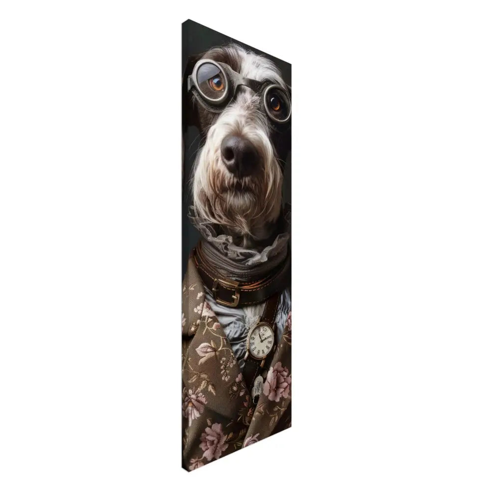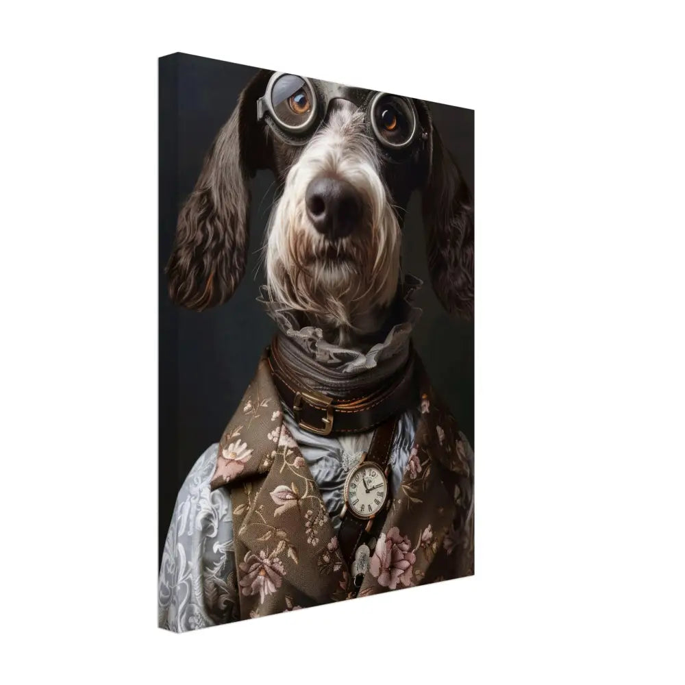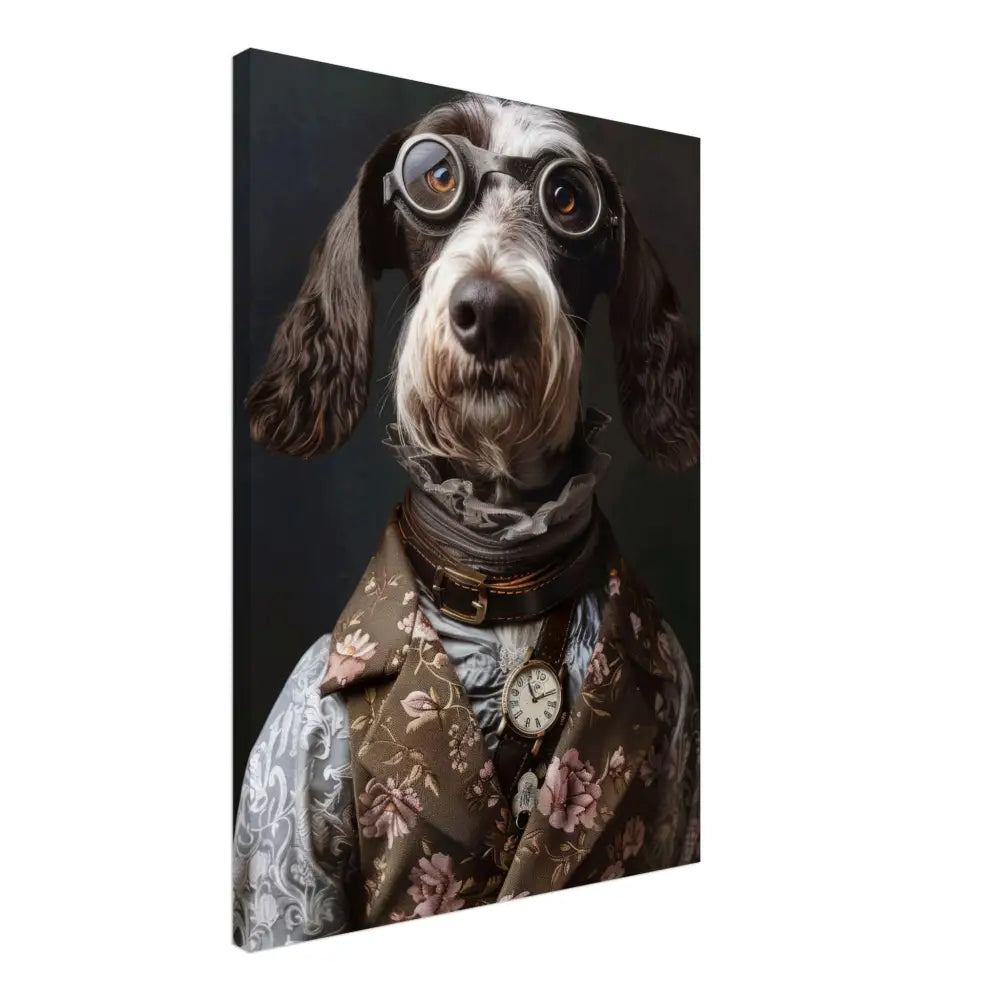 Deze afbeelding toont een dier, gekleed in een prachtige vintage steampunk outfit. Het draagt een elegante, bruin met bloemenpatronen jas die rijkelijk is versierd met subtiele motieven en fluwelen accenten. Om de nek hangt een antieke gouden klok, die de klassieke steampunk esthetiek benadrukt. De kop wordt gesierd door een paar grote, retro-futuristische brillen met zilveren metalen details, wat het dier een avontuurlijke en mysterieuze uitstraling geeft. De pootjes zijn voorzien van chique, grijze bontachtige manchetjes en leren accenten met contrasterende stiksels, wat het geheel verfijnd maakt. De achtergrond is sober met een donkergrijze tint, waardoor het dier nog meer opvalt.