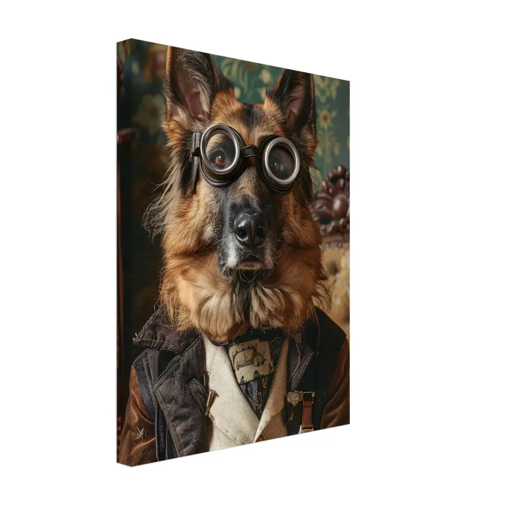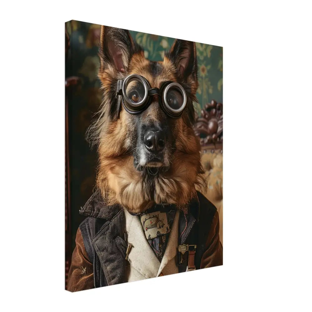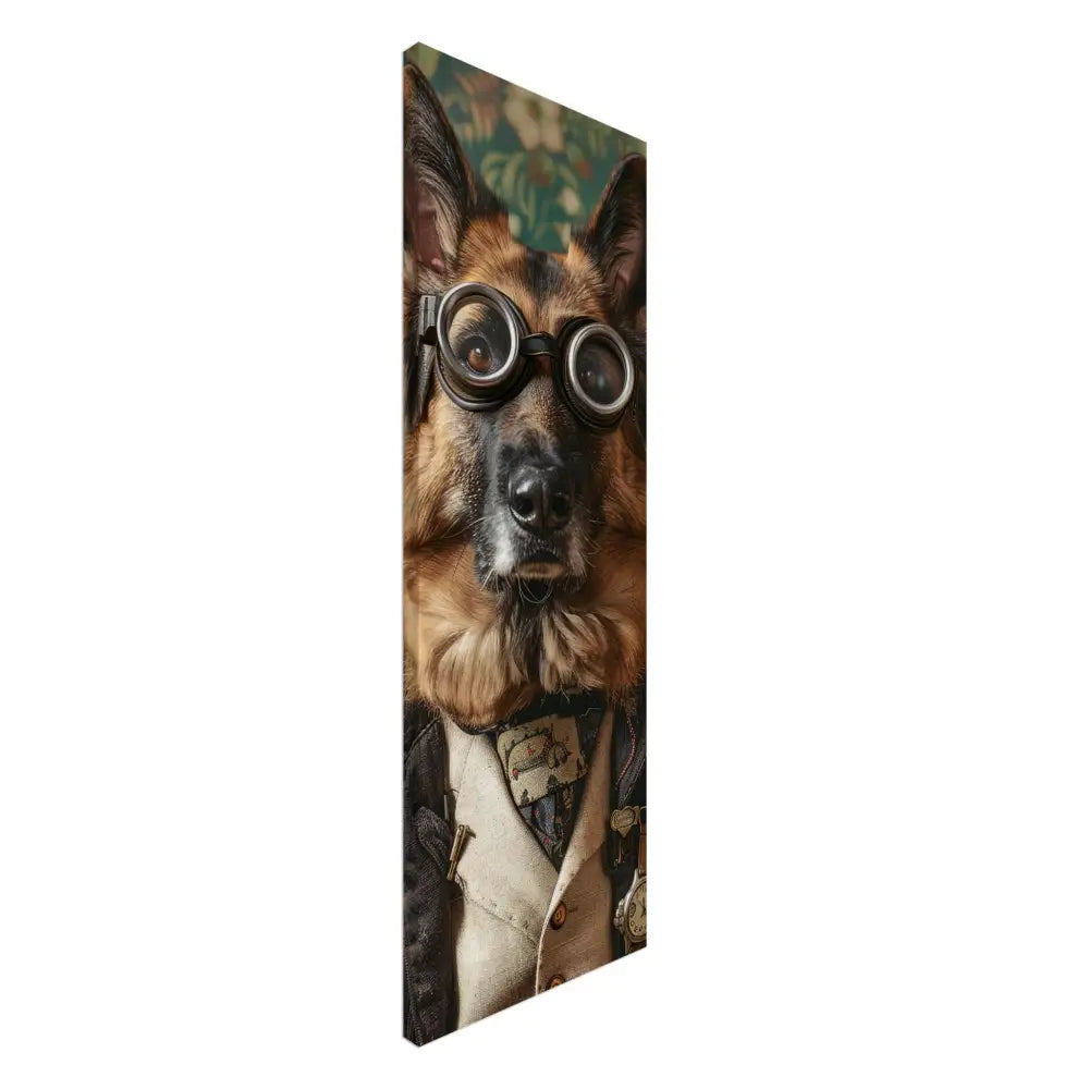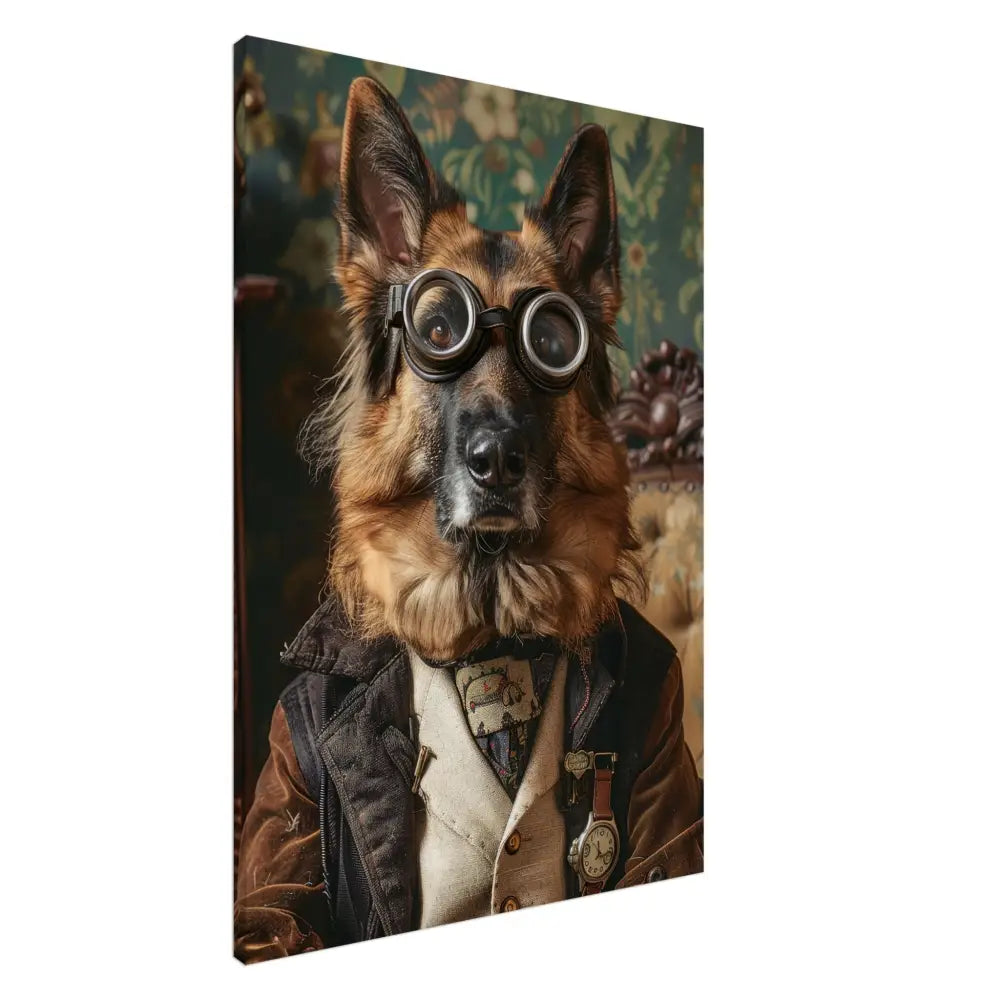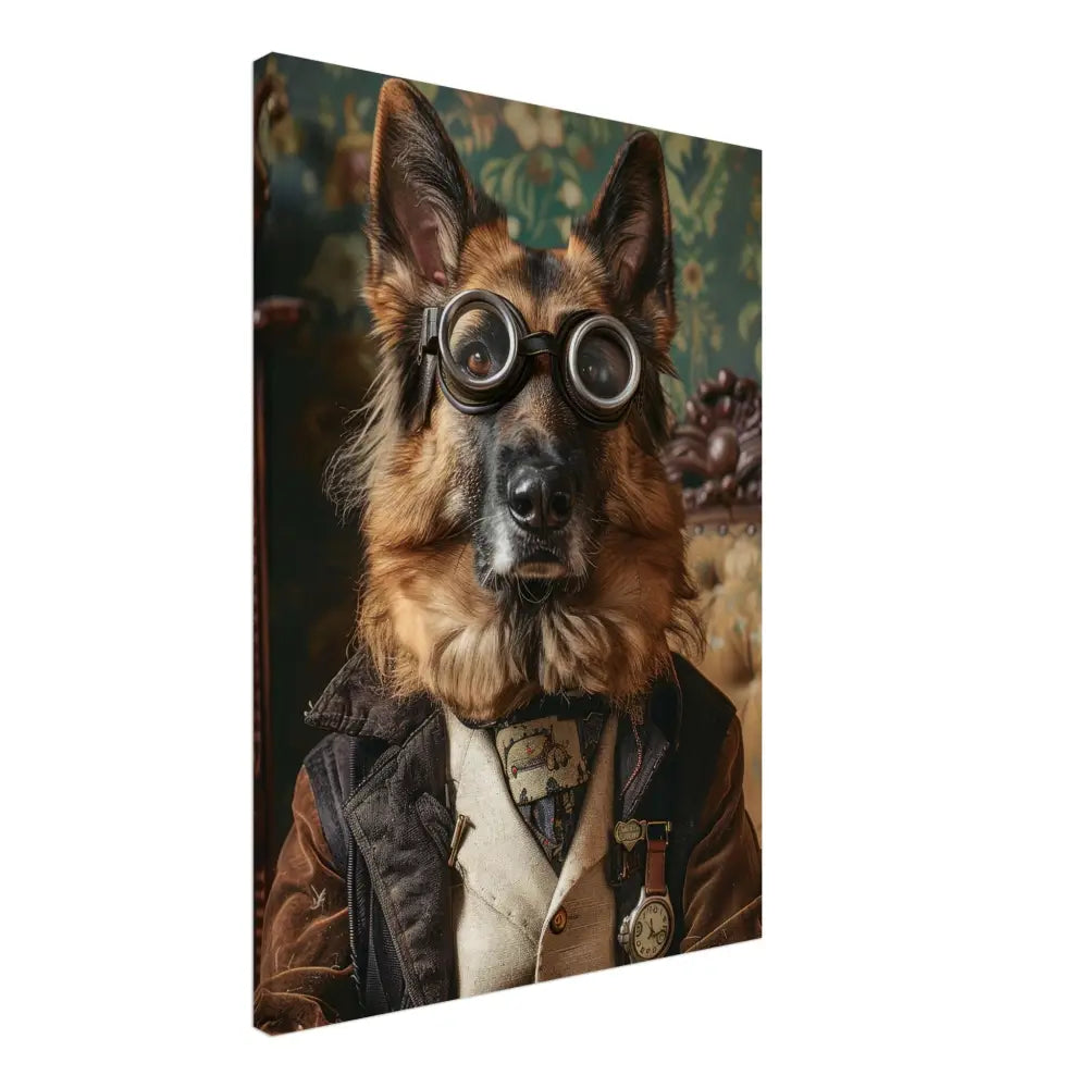 Deze afbeelding toont een dier, gekleed in een prachtige vintage steampunk outfit. Het draagt een elegante, diepbruine jas met subtiele, koperen accenten en fijne stiksels. Om de nek hangt een verfijnde, goudkleurige antieke klok die de tijdloze charme van het geheel accentueert. De kop wordt gesierd door een paar klassieke, retro-futuristische brillen met glanzende metalen details in zilverkleur, die het dier een ontdekkingsreizigers-uitstraling geven. De pootjes zijn versierd met luxueuze, donkergrijze bontachtige manchetjes die het ensemble compleet maken. De achtergrond heeft een klassieke uitstraling met een rijkelijk gedetailleerd bloemenbehang, dat een nostalgisch en romantisch gevoel opro