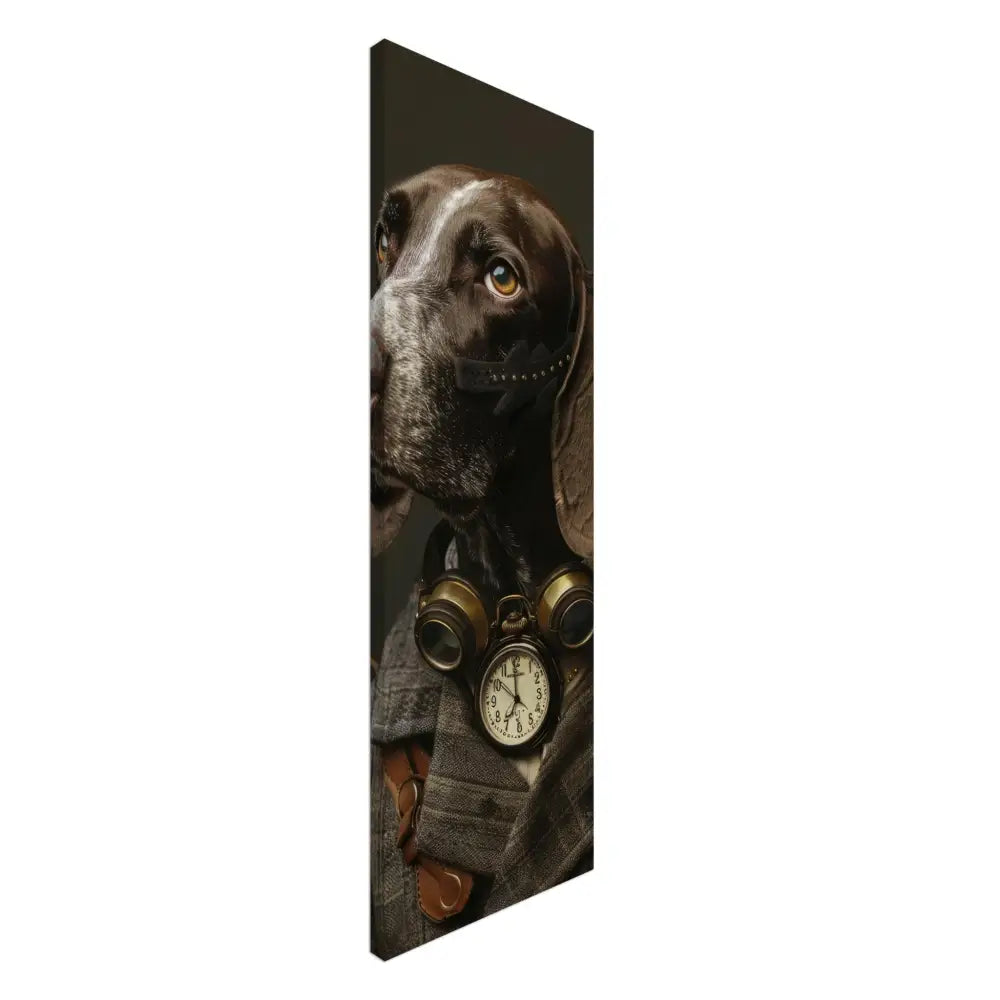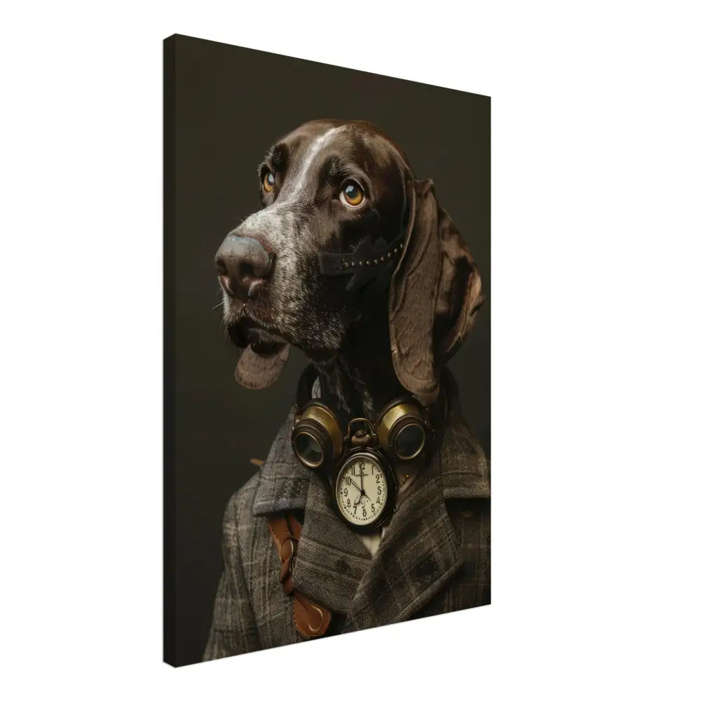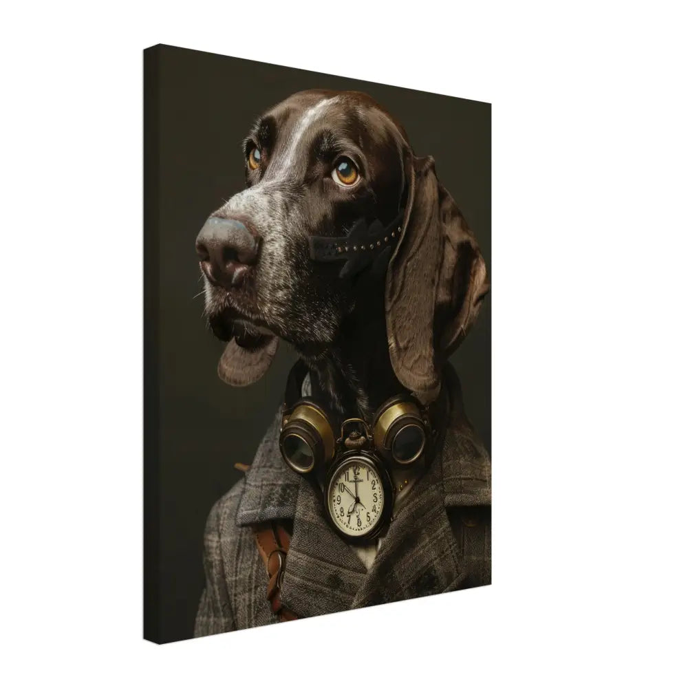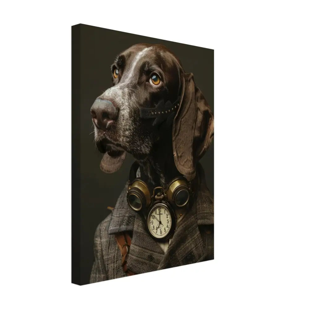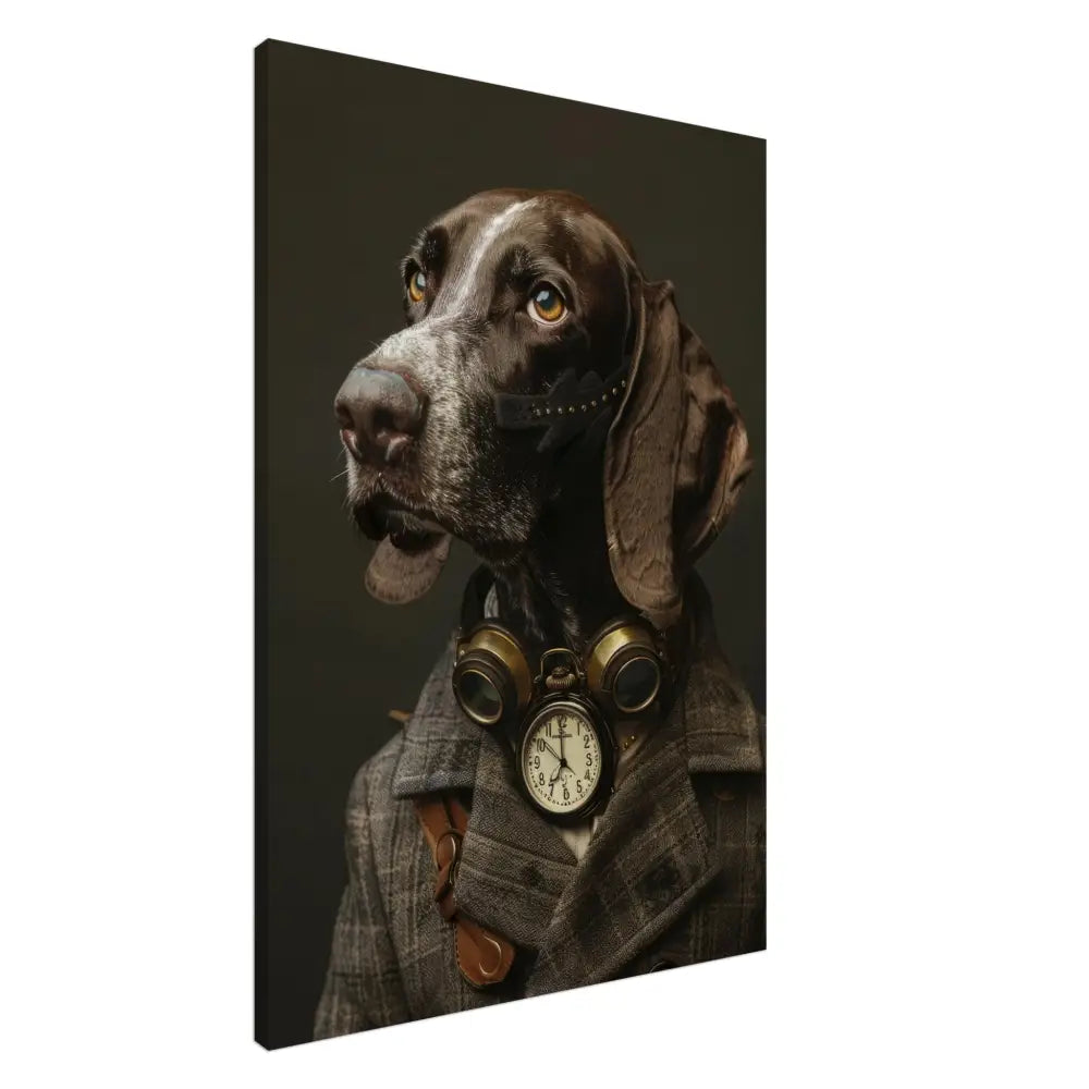 Deze afbeelding toont een hond, gekleed in een prachtige vintage steampunk outfit. Het draagt een elegante, grijze geruite jas met leren accenten en opvallende knopen. Om de nek hangt een antieke gouden klok, die de verfijnde uitstraling versterkt. De kop wordt gesierd door een paar grote, retro-futuristische brillen met metalen details in bronskleur, wat een avontuurlijke tijdreiziger hint. De donkerbruine stof van de jas heeft contrasterende stikdetails die het geheel compleet maken. De achtergrond is eenvoudig en effen, zodat alle aandacht gaat naar het gedetailleerde en stijlvolle steampunk-kostuum van de hond.