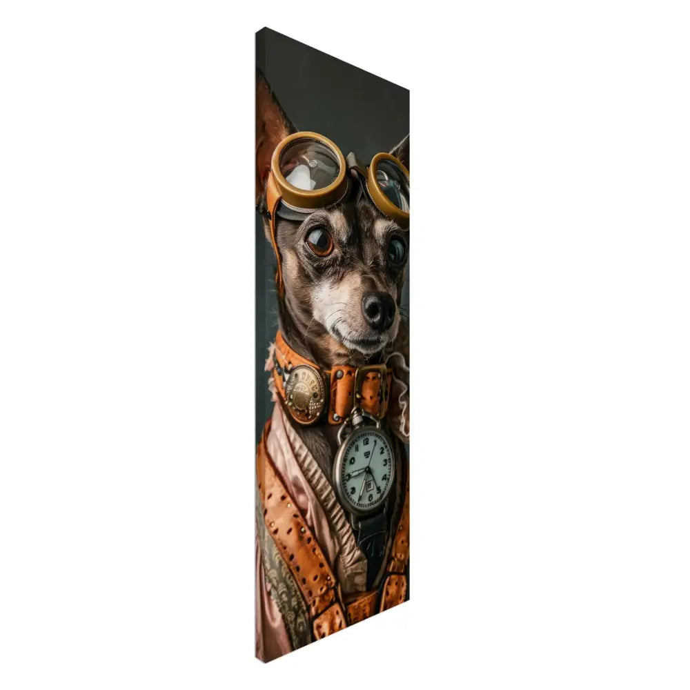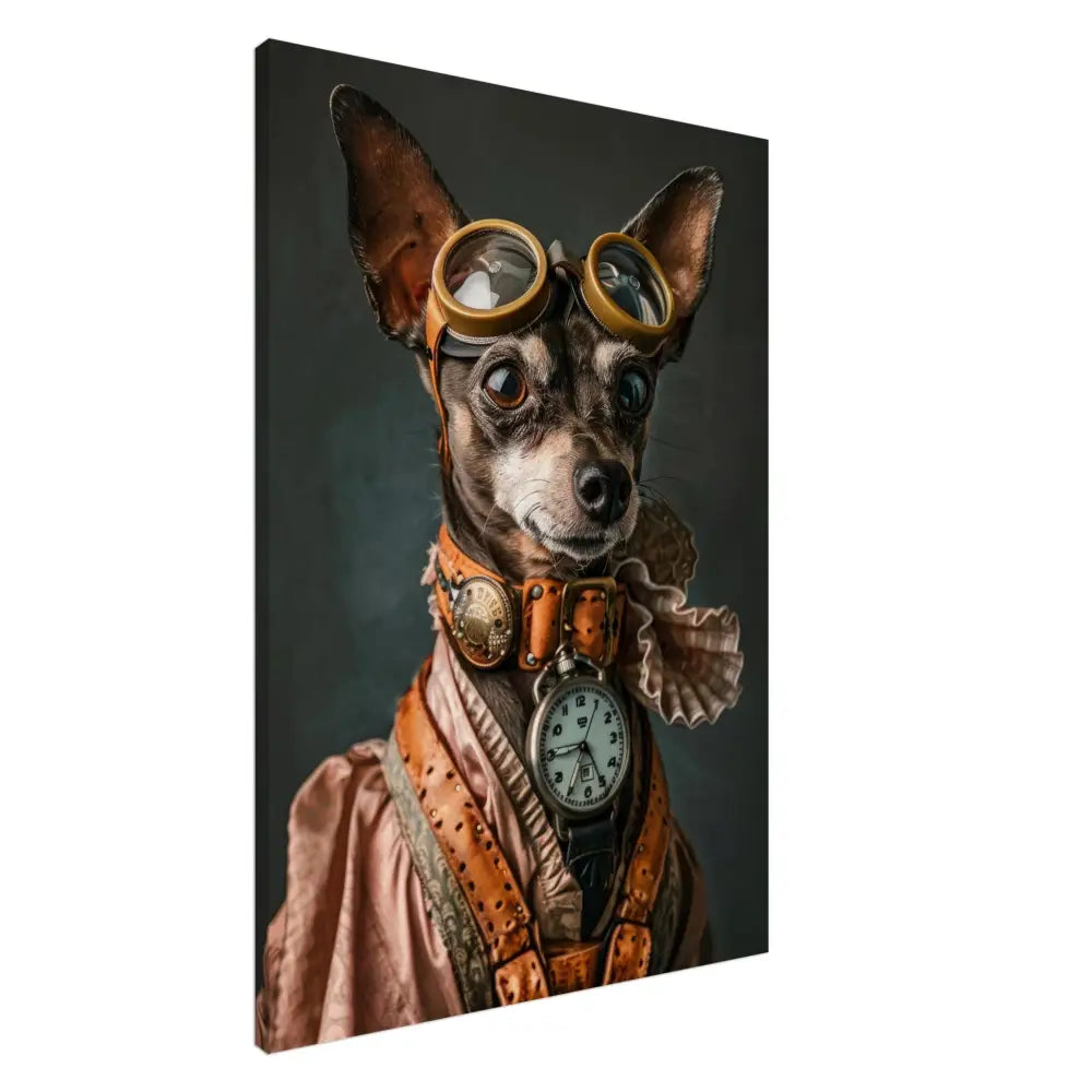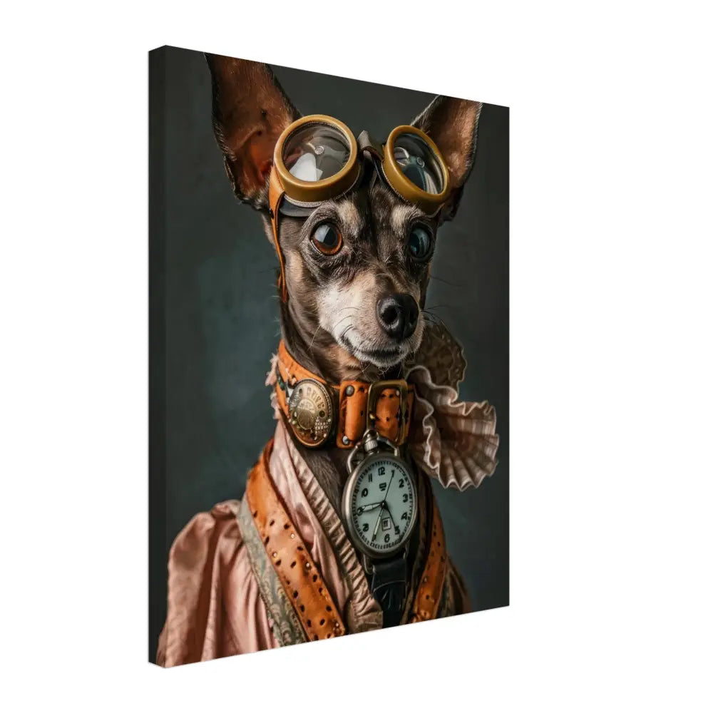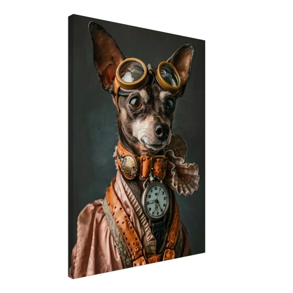Deze afbeelding toont een hond, gekleed in een prachtige vintage steampunk outfit. Het draagt een sierlijke, perzikroze jas met subtiele patronen en lederen accenten. Om de nek hangt een antieke, zilveren zakhorloge die de aristocratische uitstraling versterkt. De kop wordt gesierd door een paar grote, retro-futuristische brillen met metalen details in bronskleur, waardoor deze eruitziet als een avontuurlijke tijdreiziger. De pootjes zijn voorzien van elegante, leren manchetjes die het geheel afmaken. De donkere achtergrond met abstracte patronen voegt een mysterieus en modern tintje toe aan het schilderij.