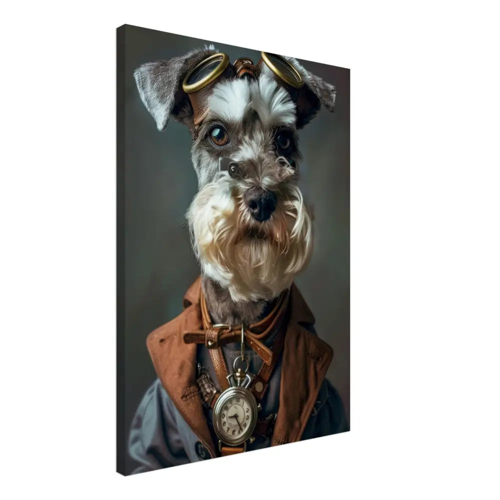 Deze afbeelding toont een hond, gekleed in een prachtige vintage steampunk outfit. Het draagt een sierlijke, bruine jas met subtiele verweerde accenten en stoere stiknaden. Om de nek hangt een antieke zilveren klok, die de avontuurlijke uitstraling versterkt. De kop wordt gesierd door een paar grote, retro-futuristische brillen met bronzen metalen details, waardoor deze eruitziet als een tijdreizende ontdekkingsreiziger. De pootjes zijn voorzien van stevige leren riemen die de ensemble compleet maken. De achtergrond is eenvoudig en donker, waardoor de nadruk volledig op het gedetailleerde kostuum en de expressieve uitstraling van de hond ligt.