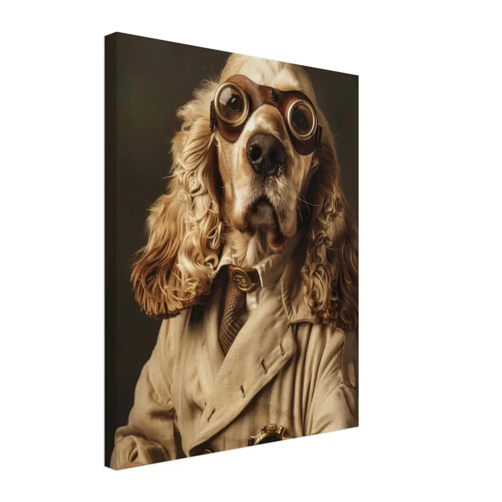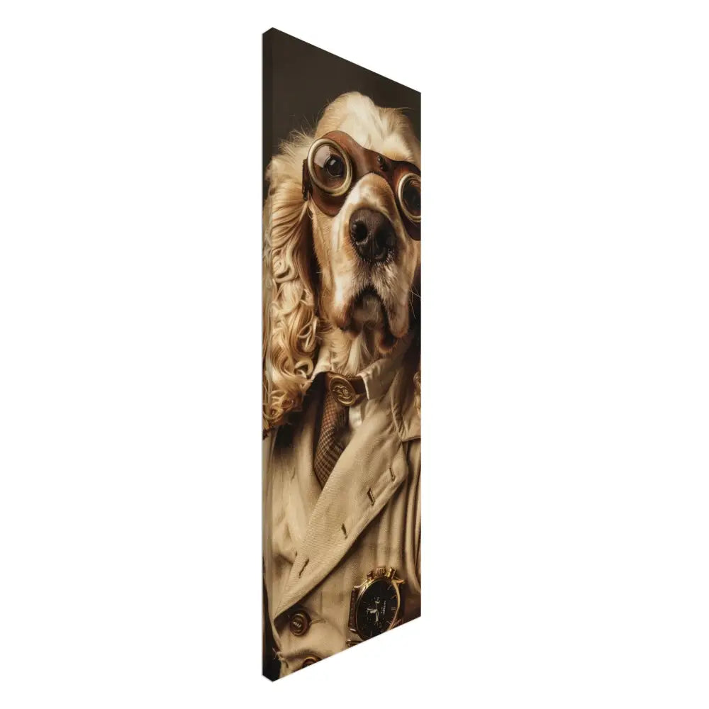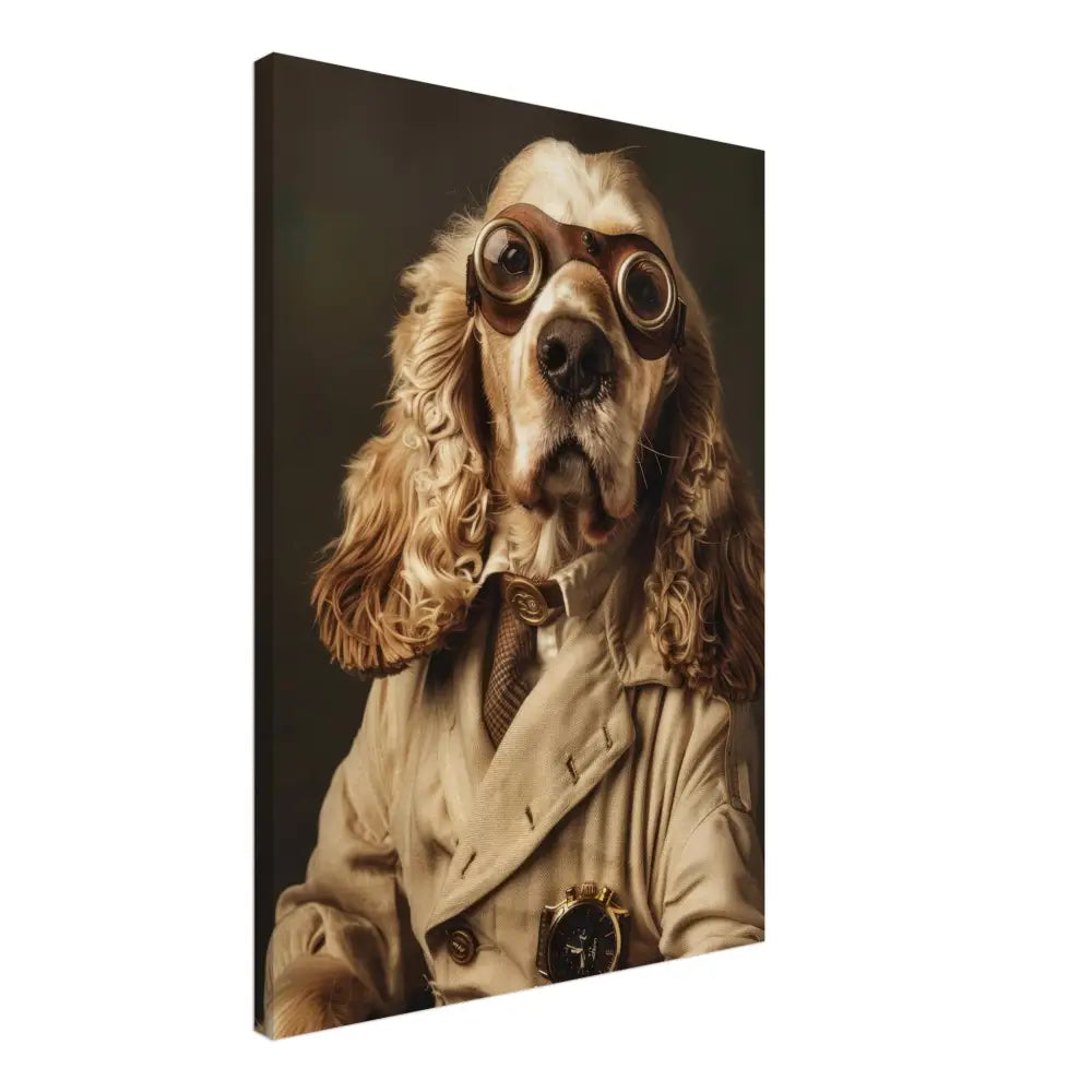 Deze afbeelding toont een dier, gekleed in een prachtige vintage steampunk outfit. Het draagt een sierlijke, beige trenchcoat met dubbele rij knopen en subtiele stiksels, waardoor het geheel een chique uitstraling krijgt. Om de nek hangt een antieke, goudkleurige klok die de aristocratische allure benadrukt. De kop wordt geaccentueerd door een retro-futuristische bril met robuuste bronzen metalen details, die het dier een avontuurlijke look geven. De pootjes zijn voorzien van verfijnde, bruine leren manchetjes die de outfit compleet maken. De achtergrond heeft een donkere, effen kleur die het dier nog meer in de schijnwerpers plaatst.