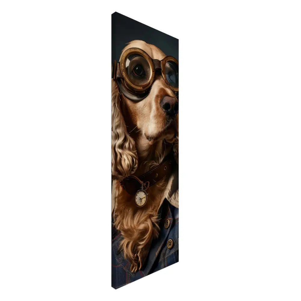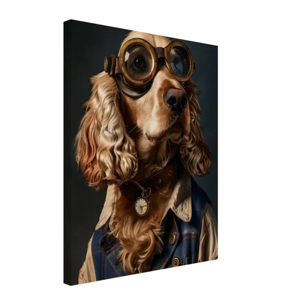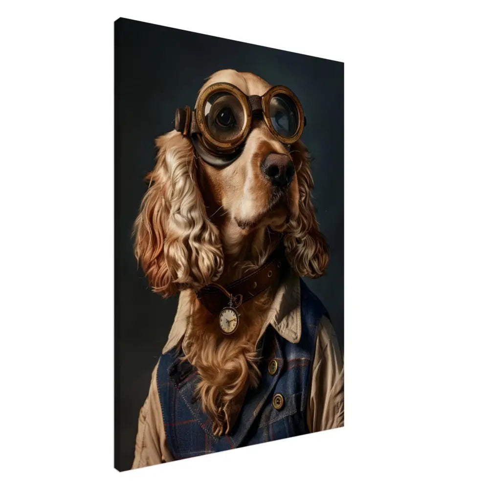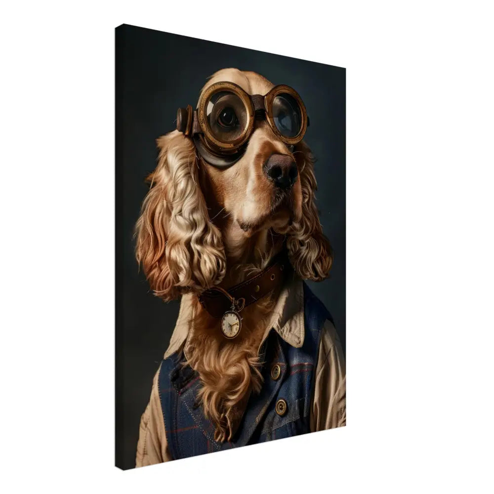 Deze afbeelding toont een dier, gekleed in een prachtige vintage steampunk outfit. Het draagt een stijlvolle, blauwe jas met een geruit patroon en gouden accenten. Om de nek hangt een antieke zakhorloge in een bronzen kleur, die de tijdloze charme van het portret benadrukt. De kop is versierd met een set grote, industriële brillen, vol met gedetailleerde metalen onderdelen in bronskleur. Elegante leren manchetjes sieren de pootjes, met vakkundig contrasterende stiksels. De achtergrond is donker en mysterieus, wat de focus volledig op het prachtig geklede dier houdt en de steampunk sfeer benadrukt.