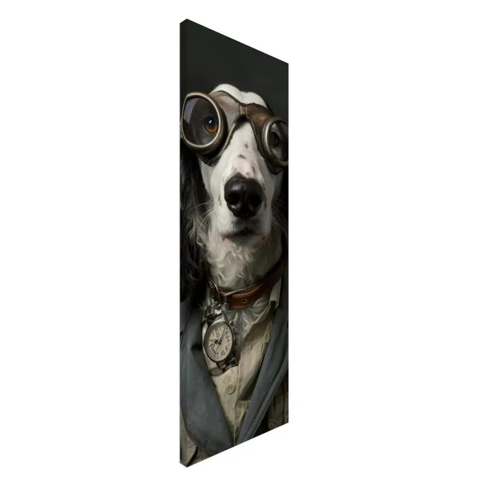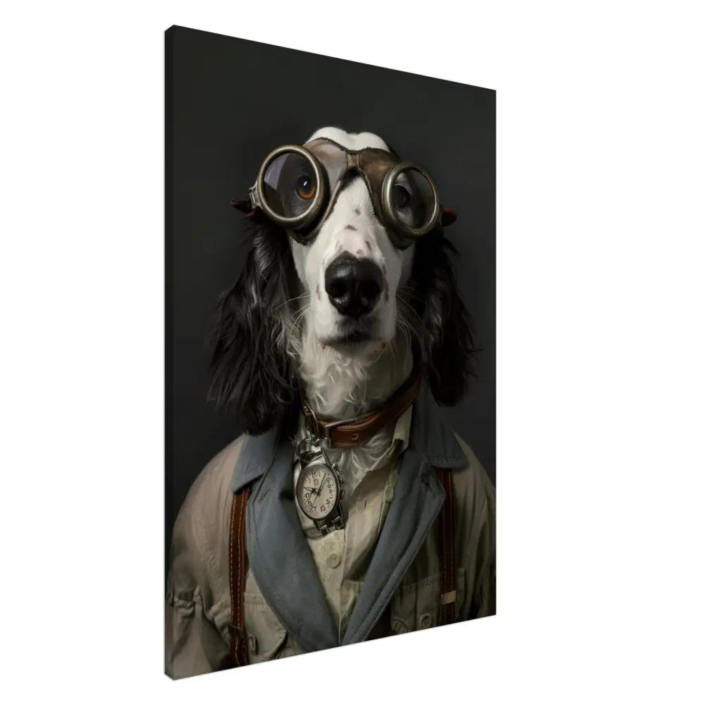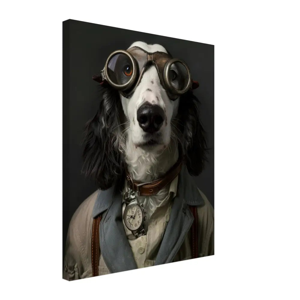 Deze afbeelding toont een dier, gekleed in een prachtige vintage steampunk outfit. Het draagt een stijlvolle, grijze jas met delicate stiksels en subtiele patroondetails. Om de nek hangt een antieke, zilveren klok, die elegant tegen de borst hangt. Op het hoofd prijkt een forse, retro-futuristische bril met metalen details in een verweerde bronskleur, wat het dier een avontuurlijke uitstraling geeft. Verder zijn er leren accenten zichtbaar, zoals de riem rond de hals, die het geheel compleet maken. De achtergrond is eenvoudig, donker en minimalistisch, waardoor alle aandacht naar het prachtig uitgedoste dier gaat.