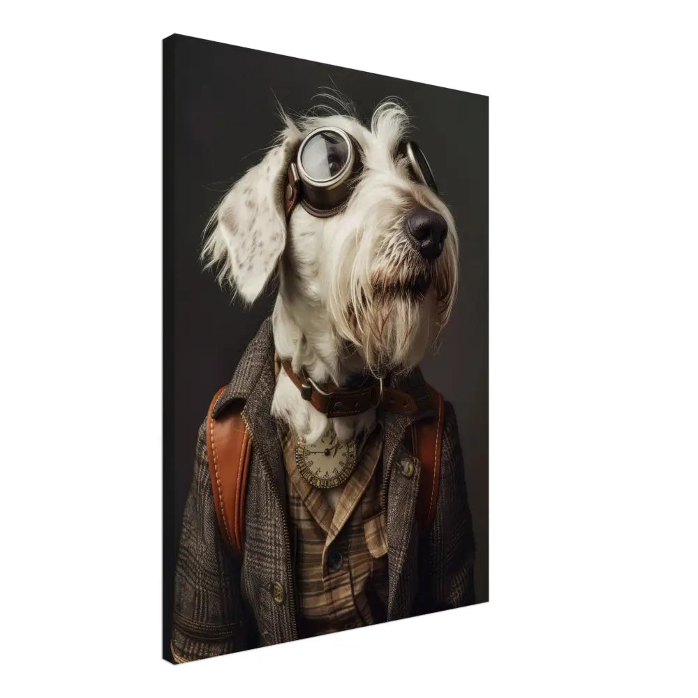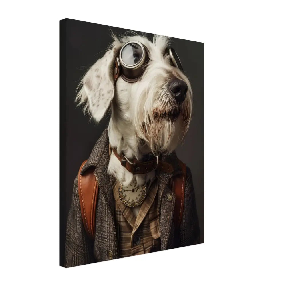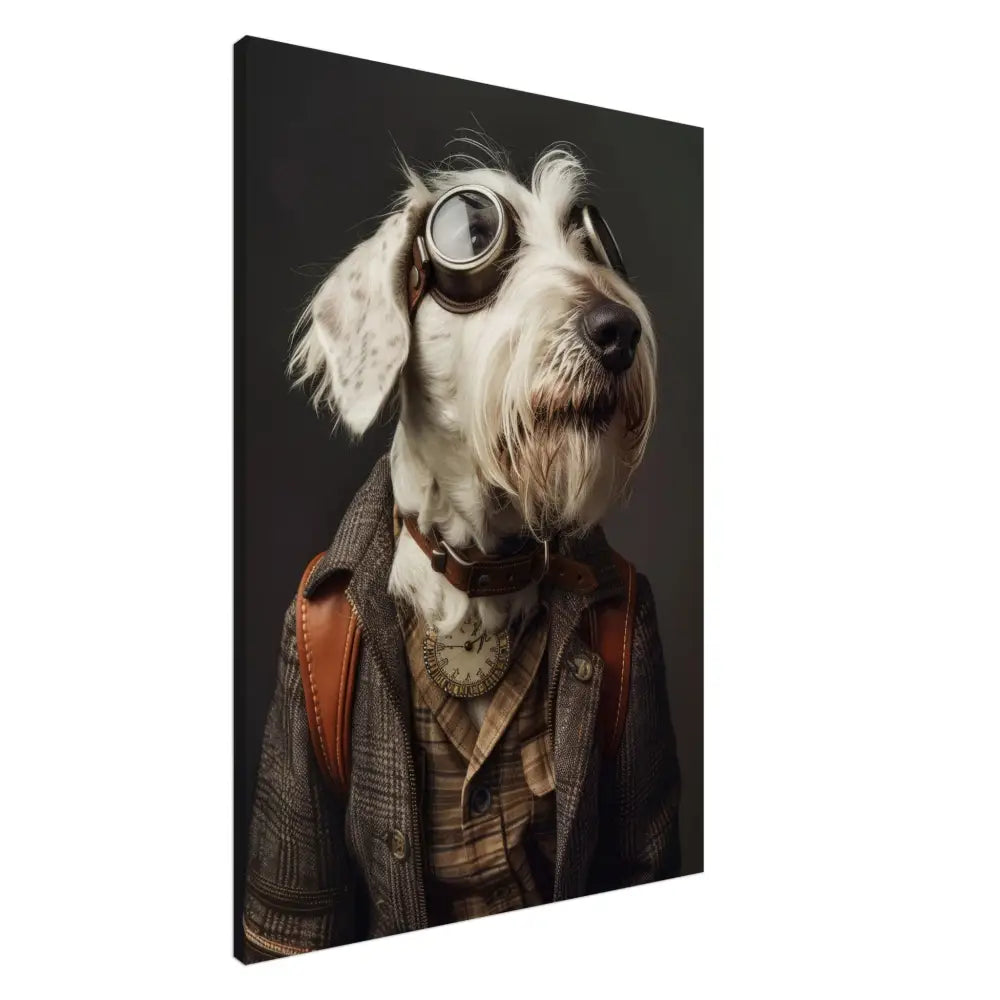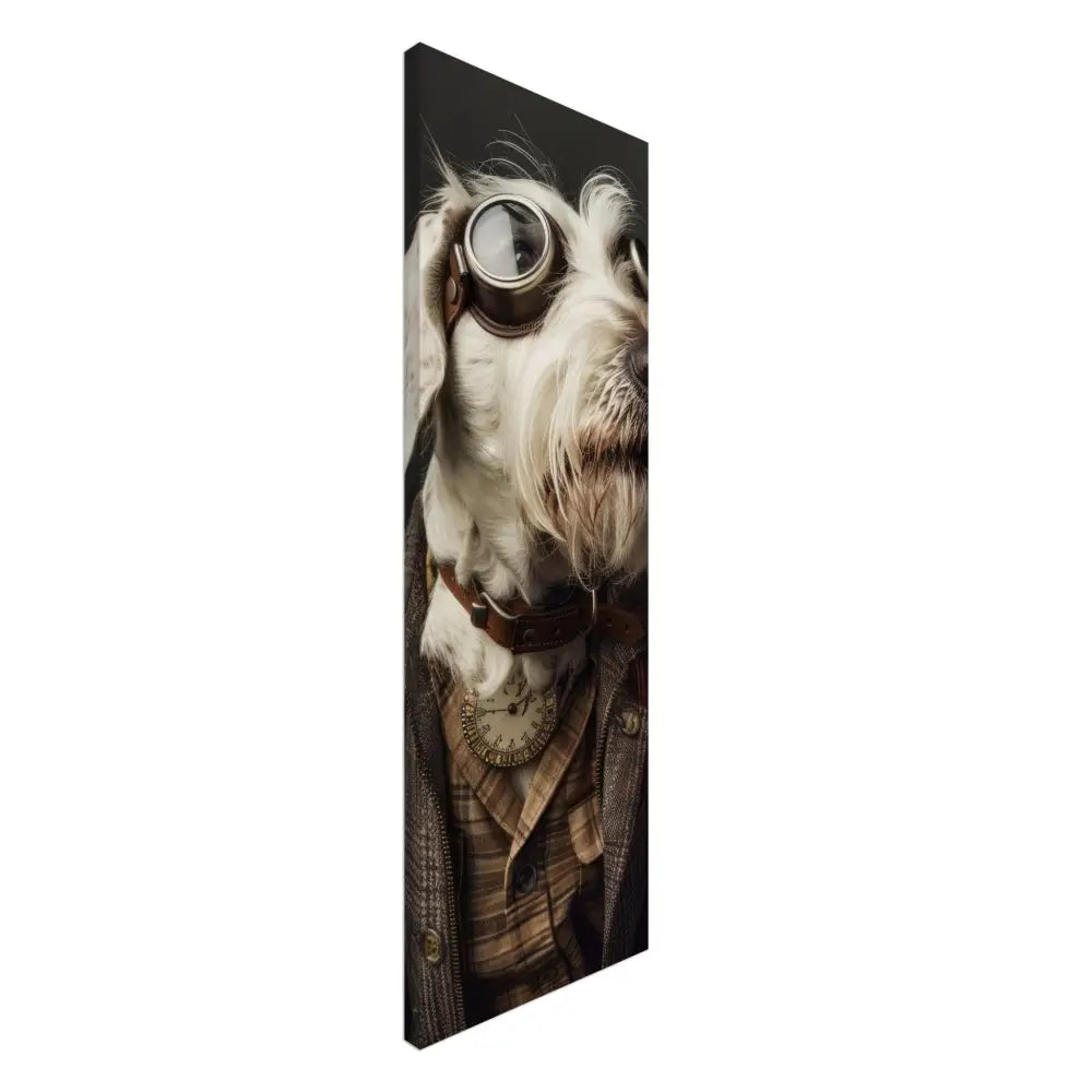 Deze afbeelding toont een dier, gekleed in een prachtige vintage steampunk outfit. Het draagt een sierlijke, bruine jas met een geruit patroon en leren accenten op de schouders. Om de nek hangt een antieke, gouden klok die de aristocratische uitstraling benadrukt. De kop wordt gesierd door een paar grote, retro-futuristische brillen met metalen details in bronskleur, wat het dier eruit laat zien als een avontuurlijke tijdreiziger. De pootjes zijn voorzien van elegante, beige bontachtige manchetjes die het geheel afmaken. De achtergrond is donker, waardoor het steampunk-thema nog meer naar voren komt, met zachte accenten die een nostalgische sfeer creëren.
