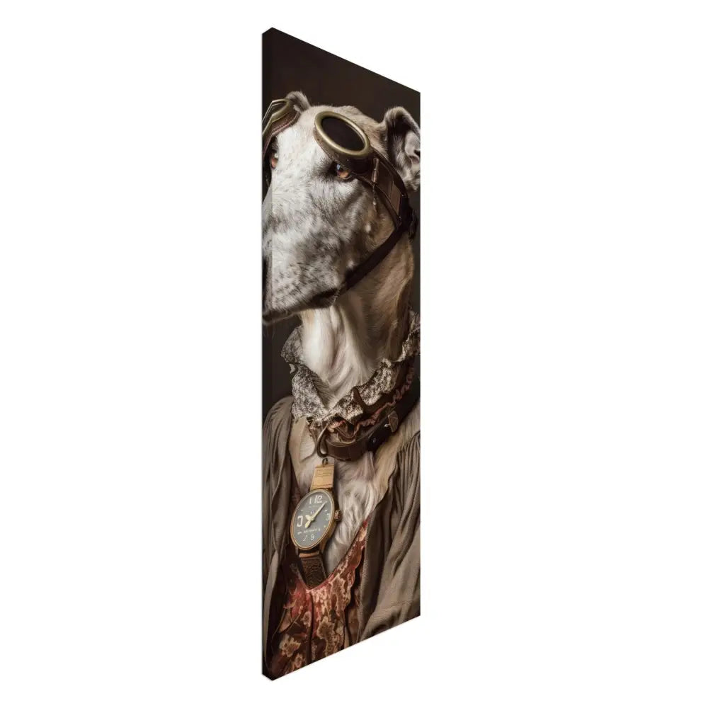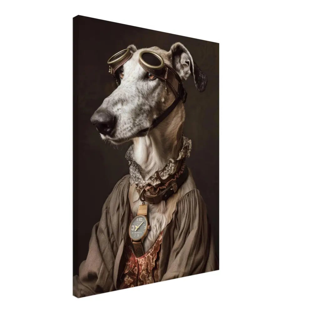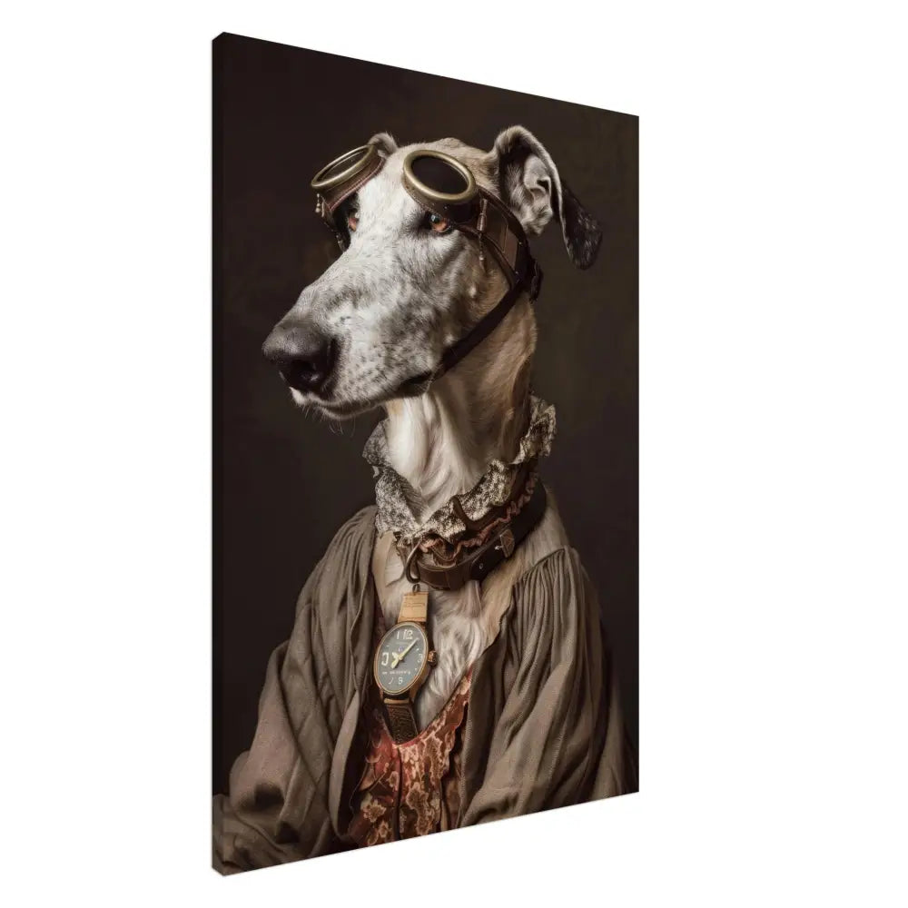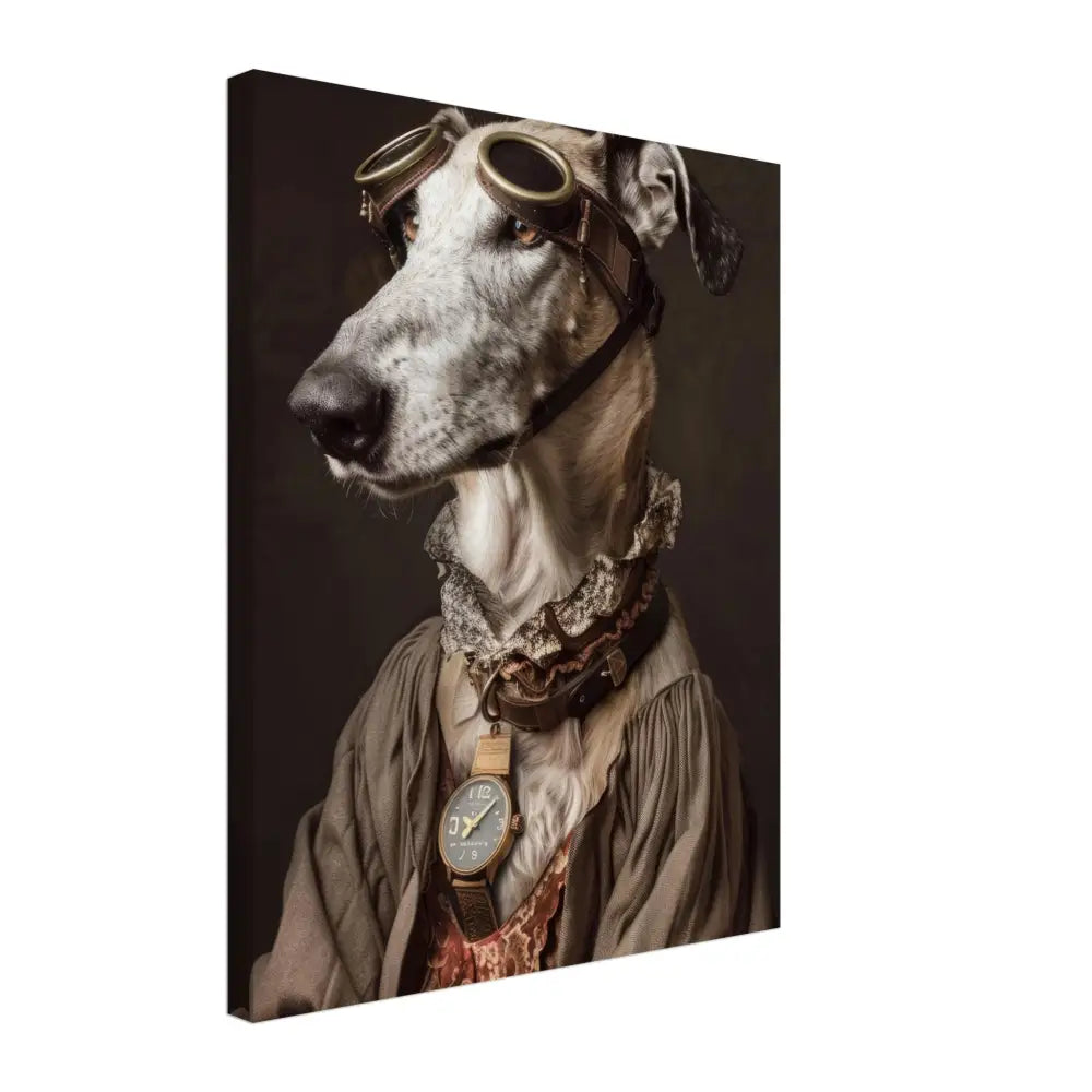Deze afbeelding toont een dier, gekleed in een prachtige vintage steampunk outfit. Het draagt een gracieuze, beige jas met subtiele patronen en verfijnde plooien. Om de nek hangt een antieke gouden klok, die de tijdloze charme benadrukt. De kop wordt gesierd door een paar grote, retro-futuristische brillen met metalen details in bronzen kleur, wat de uitstraling van een avontuurlijke ontdekkingsreiziger geeft. De pootjes zijn voorzien van elegante bronskleurige leren accenten en mooi contrasterende stiksels. De achtergrond wordt verfraaid met een ingetogen, bloemig behang, wat een vleugje nostalgische romantiek toevoegt.