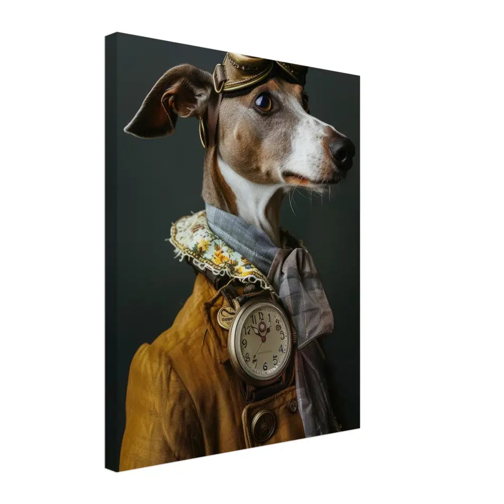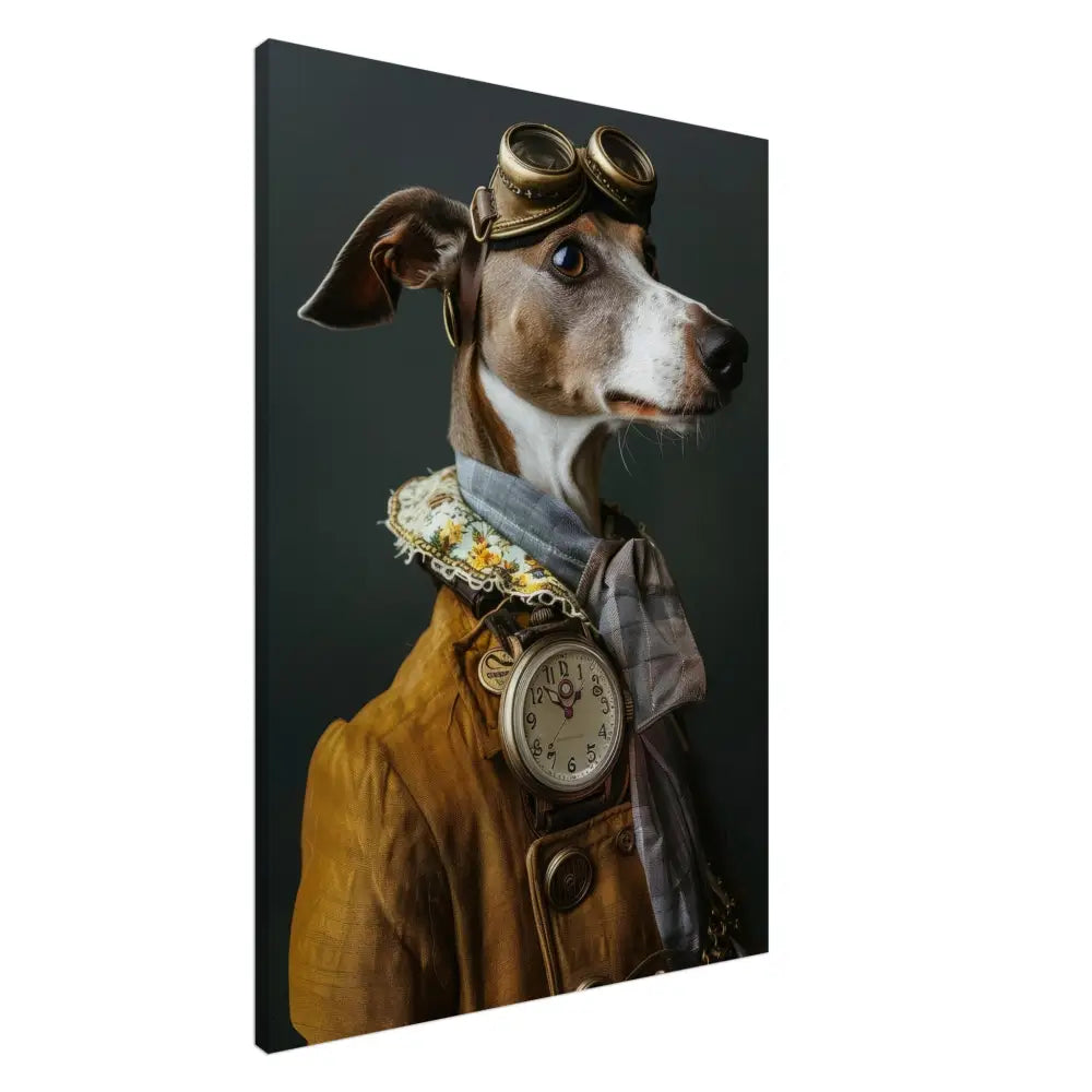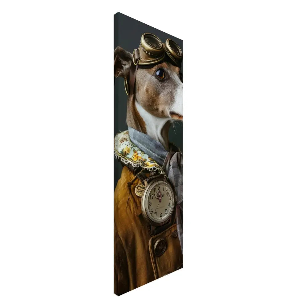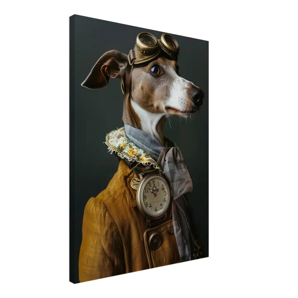 Deze afbeelding toont een dier, gekleed in een prachtige vintage steampunk outfit. Het draagt een verfijnde, mosterdgele jas met sierlijke knopen en gedetailleerde stiksels langs de randen. Om de nek hangt een antieke, zilveren klok die majestueus afsteekt tegen de stof van de jas. De kop wordt gesierd door een paar grote, retro-futuristische brillen met bronzen metalen details, waardoor deze eruitziet als een charmante ontdekkingsreiziger. Grijze bontachtige manchetjes sieren de poten, in combinatie met leren accenten die warmte toevoegen aan de look. De achtergrond is donker, wat de elegante uitstraling van het portret benadrukt.