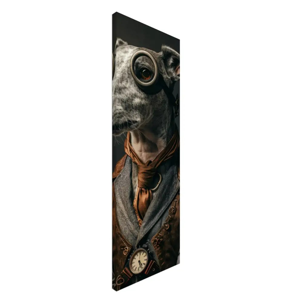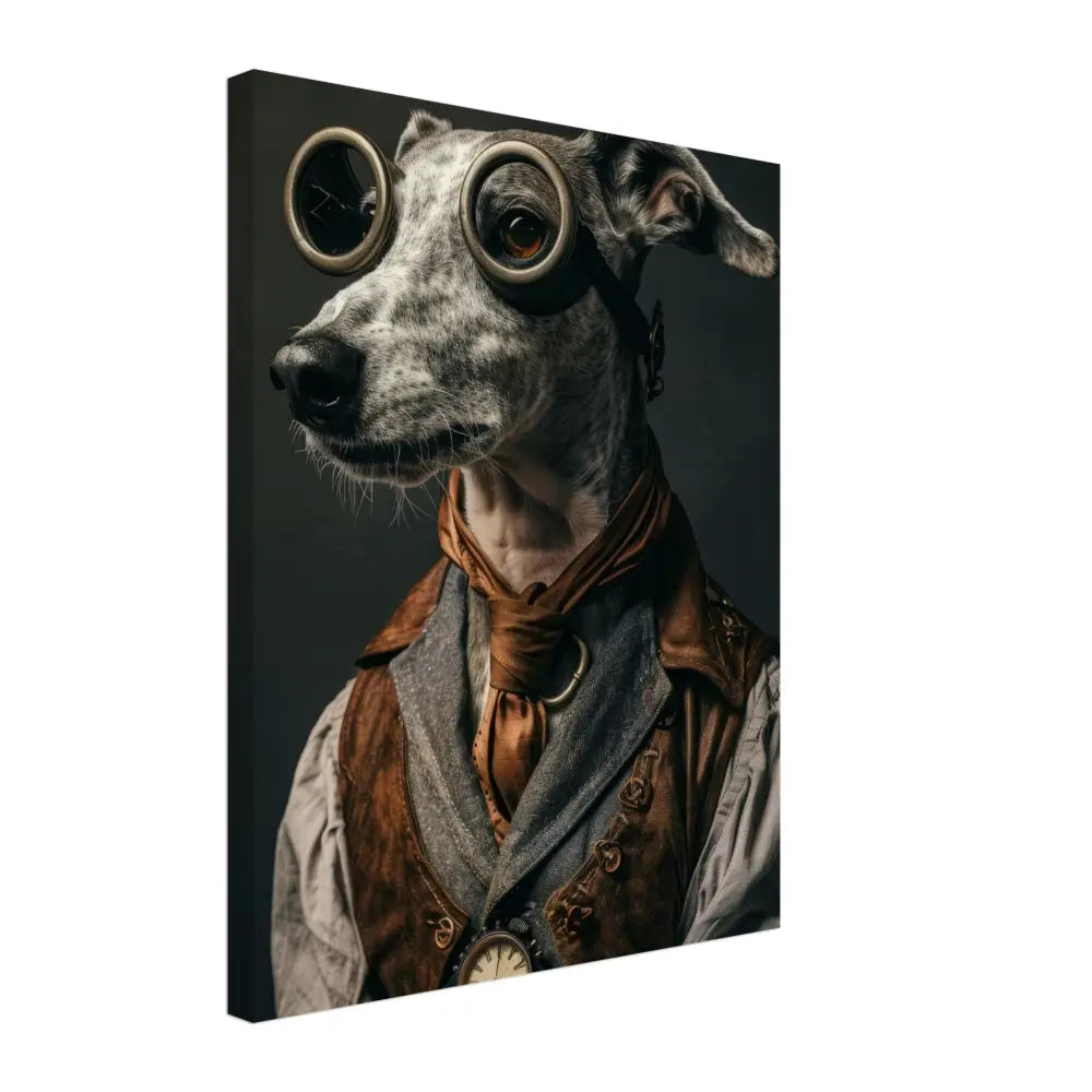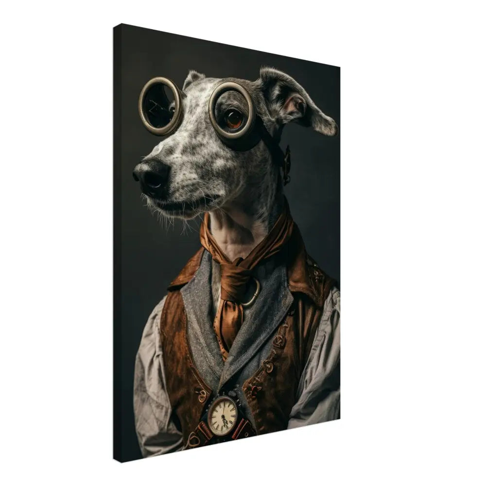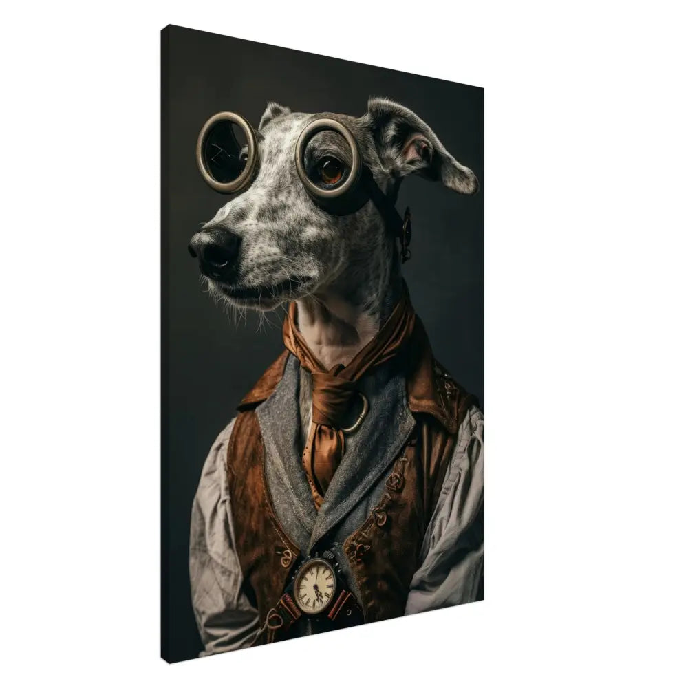 Deze afbeelding toont een hond, gekleed in een prachtige vintage steampunk outfit. Het draagt een elegante, bruine leren jas met bronzen accenten en gedetailleerde stiksels die een robuuste maar verfijnde uitstraling geven. Om de nek hangt een antieke bronzen klok, die subtiel contrasteert met de rest van de outfit. De kop wordt gesierd door een paar grote, ronde brillen met robuuste metalen details in een donkere bronskleur, wat aan de avontuurlijke stijl bijdraagt. De poten zijn versierd met leren manchetjes en contrasterende stiksels. De donkere, sfeervolle achtergrond benadrukt de dramatische en tijdloze sfeer van het portret.