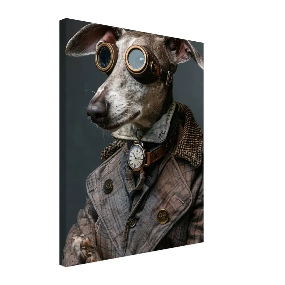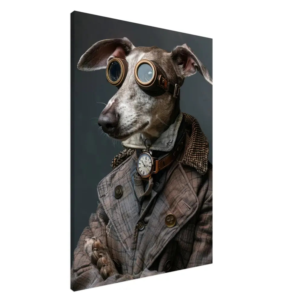 Deze afbeelding toont een dier, gekleed in een prachtige vintage steampunk outfit. De sierlijke, bruin-gestreepte jas heeft gedetailleerde knoopjes en biedt een aristocratische uitstraling. Om de nek hangt een antieke klok van koper, die meteen de aandacht trekt door de versierde wijzerplaat. Het hoofd van het dier wordt gesierd door een paar imposante retro-futuristische bril met bronzen metalen details, wat een avontuurlijke uitstraling geeft. De pootjes zijn voorzien van elegante, lederen accenten en contrasterende stiksels die het geheel elegant afmaken. De achtergrond is vaag en donker, waardoor de schitterende outfit extra opvalt.