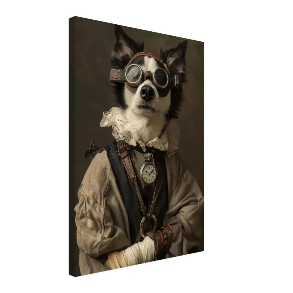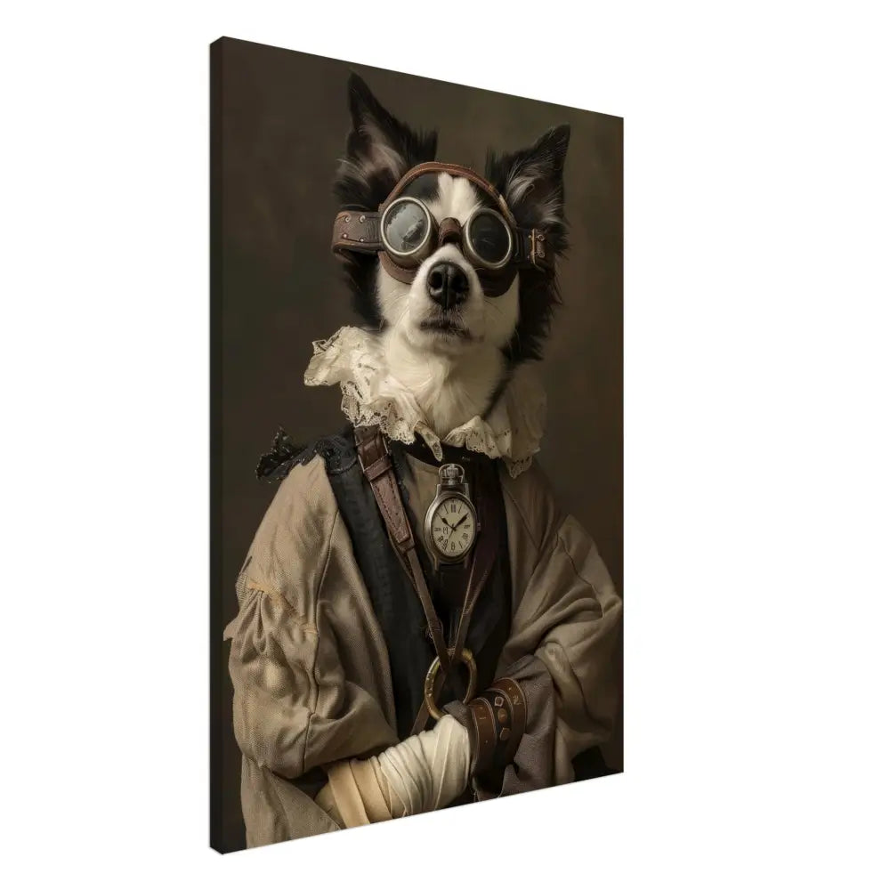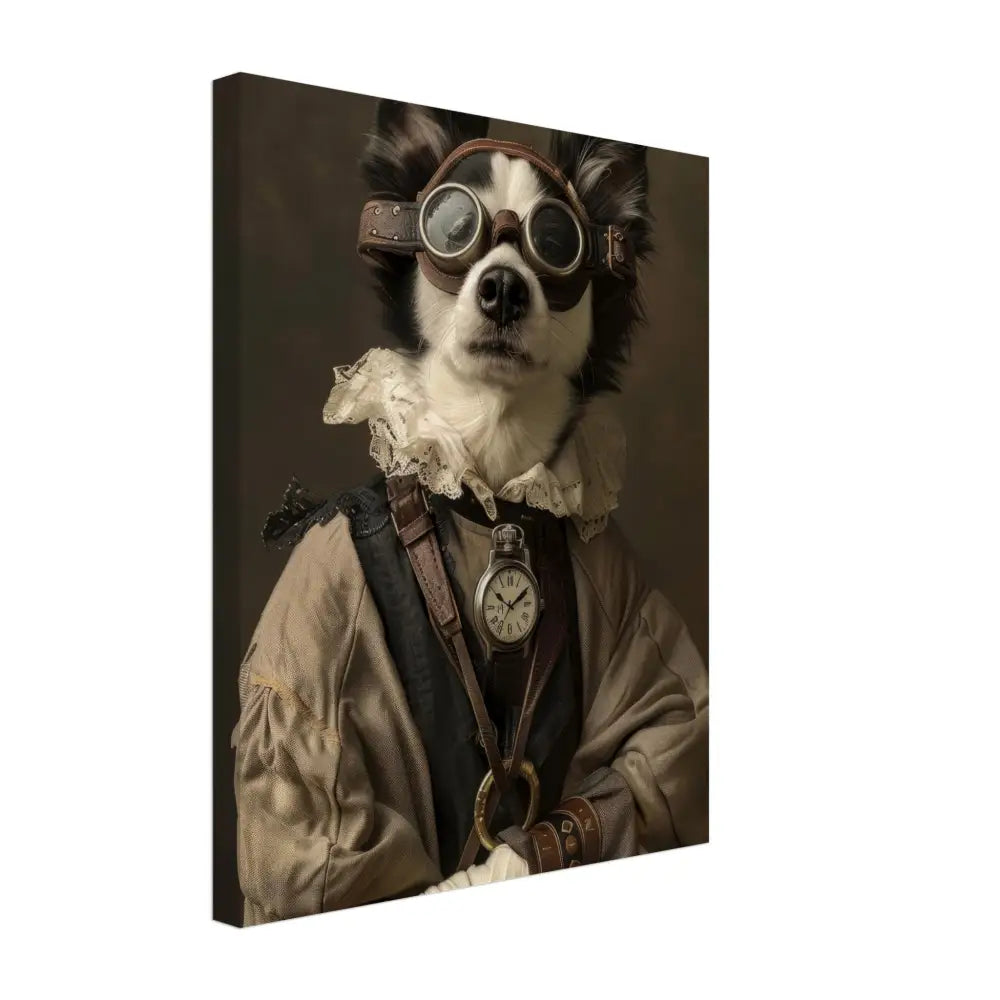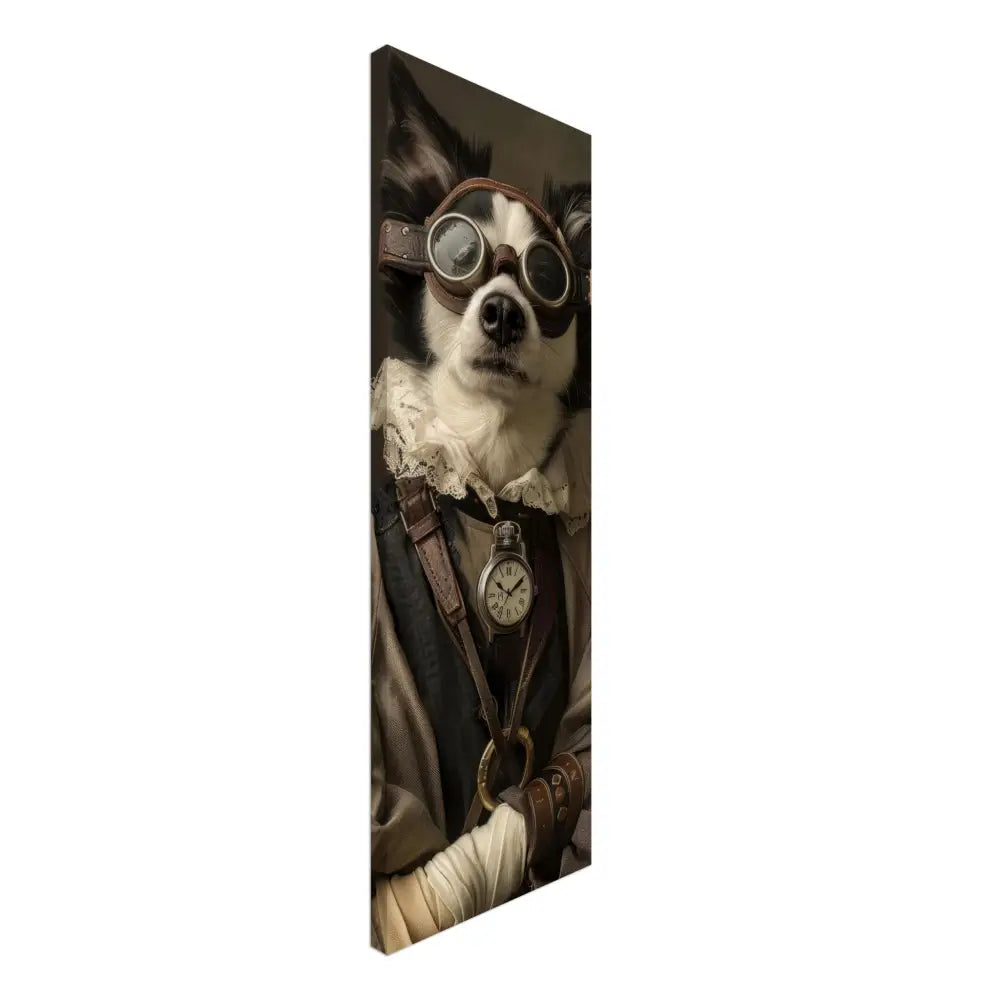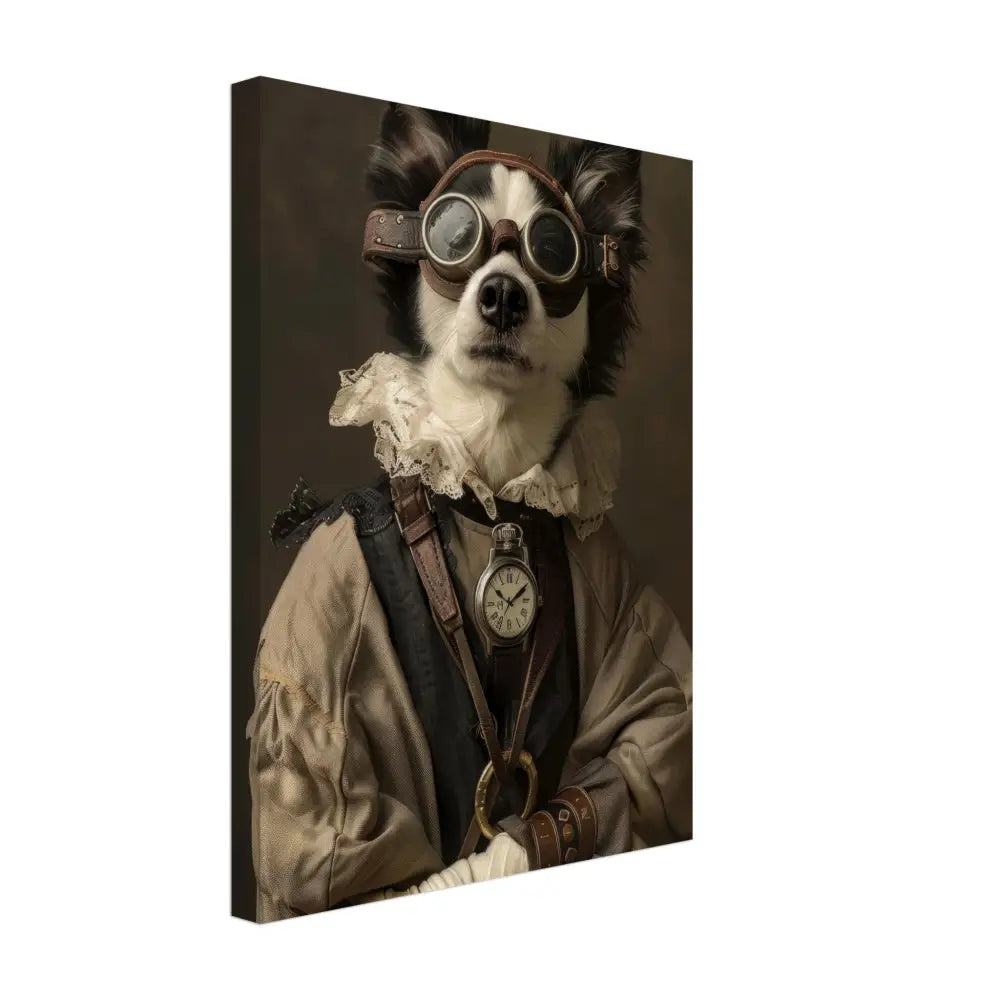 Deze afbeelding toont een dier, gekleed in een prachtige vintage steampunk outfit. Het draagt een elegant, beige gewaad met gedetailleerde gespen en plooien, perfect passend bij de steampunk esthetiek. Om de nek hangt een antieke zilveren klok die rust op een leren riem, waardoor het dier een tijdloze charme uitstraalt. Op het hoofd prijkt een paar grote, robuuste brillen met metalen details in bronskleur, die een gevoel van ontdekkingsreiziger oproepen. De poten zijn voorzien van luxueuze manchetjes die deels bedekt zijn met leren accenten en contrasterende stiksels. De achtergrond is mysterieus met een klassieke, vaag gekleurde textuur, wat het geheel compleet