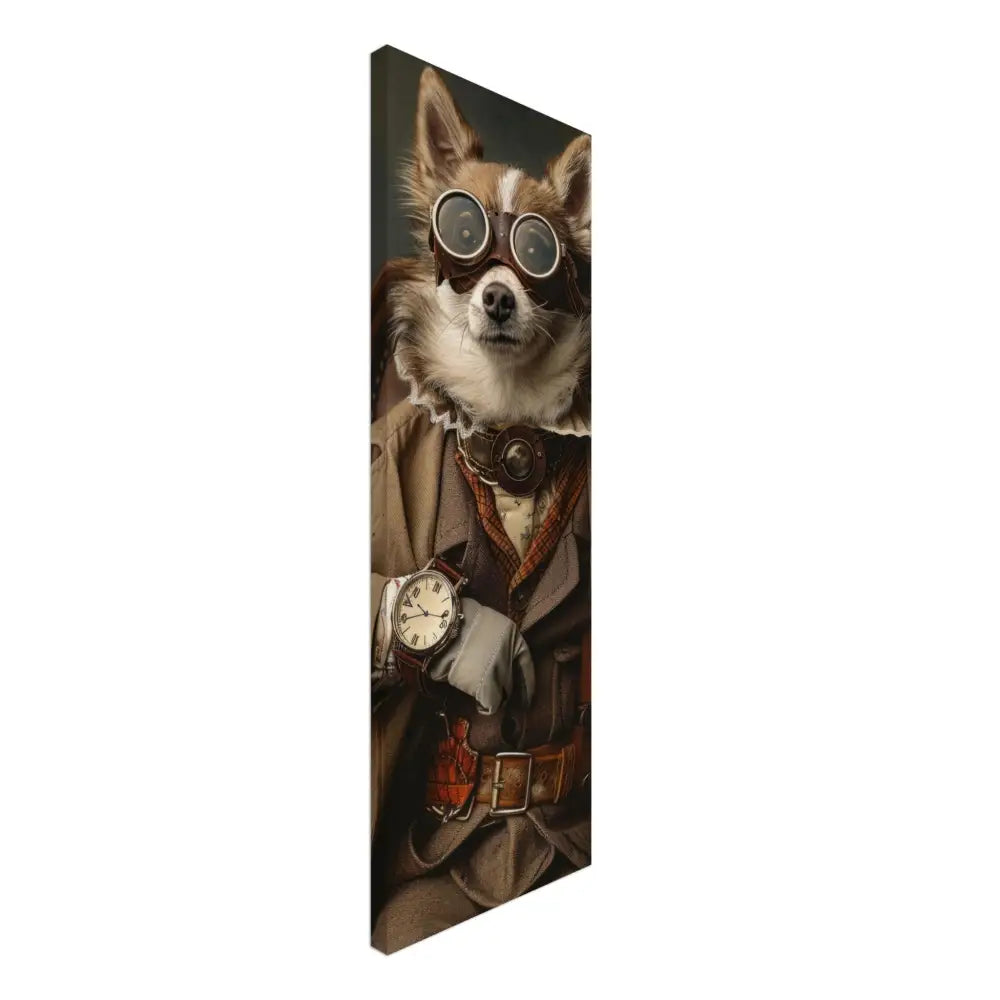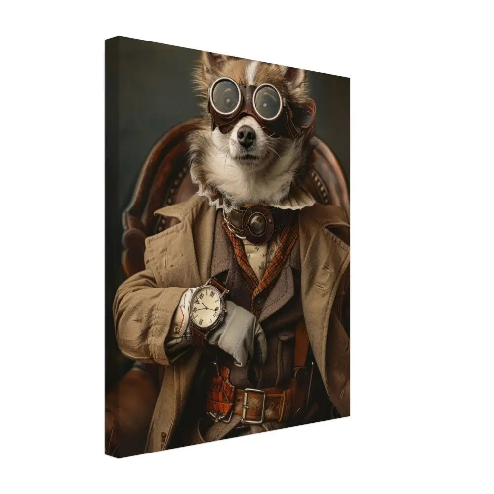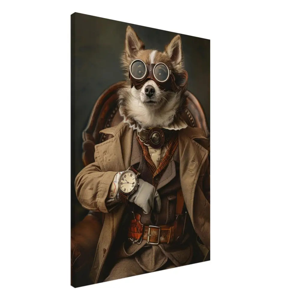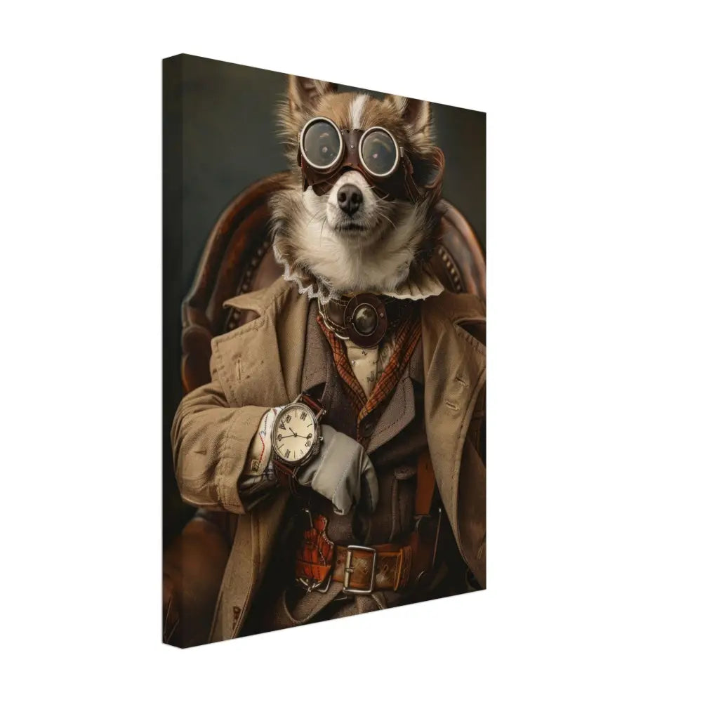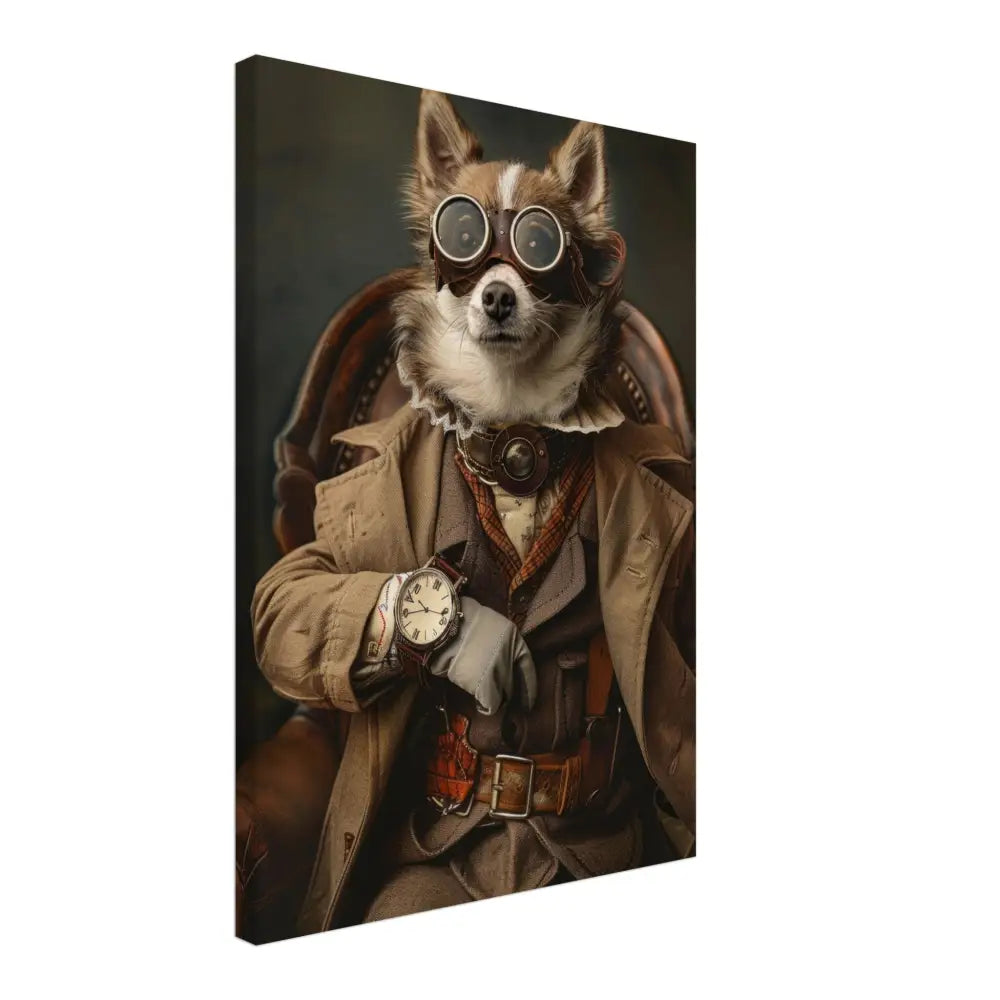 Deze afbeelding toont een dier, gekleed in een prachtige vintage steampunk outfit. Het draagt een verfijnde, beige jas met subtiele stiksels en leren accenten die de retro look benadrukken. Om de nek hangt een antieke bronzen klok, die de klassieke sfeer versterkt. Op de kop van het dier rust een par grandioze, ronde brillen met bronzen metallic details, alsof het elk moment op avontuur zou kunnen gaan. De pootjes zijn versierd met elegante, grijze bontachtige manchetjes, en de leren riem rond zijn middel voegt een robuuste touch toe. De donkere, vintage achtergrond complementeert de steampunk esthetiek perfect.
