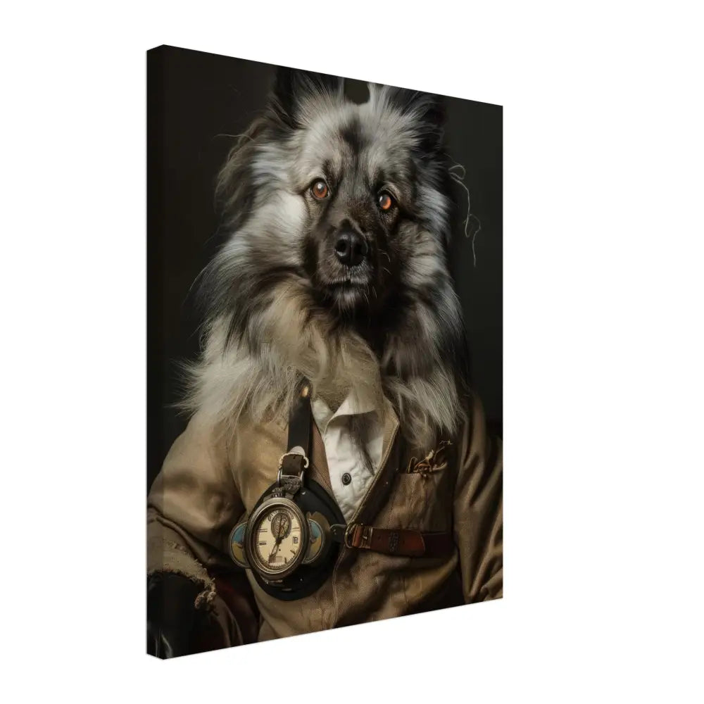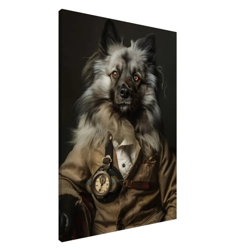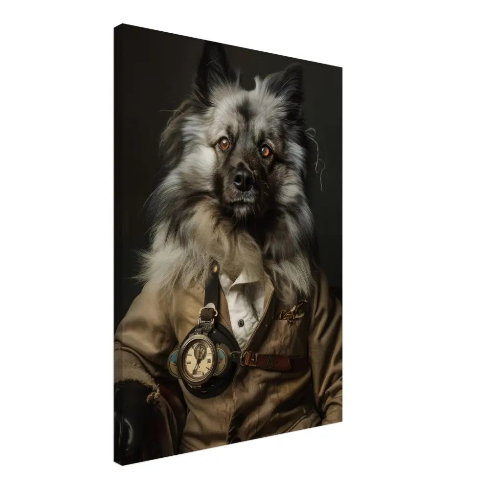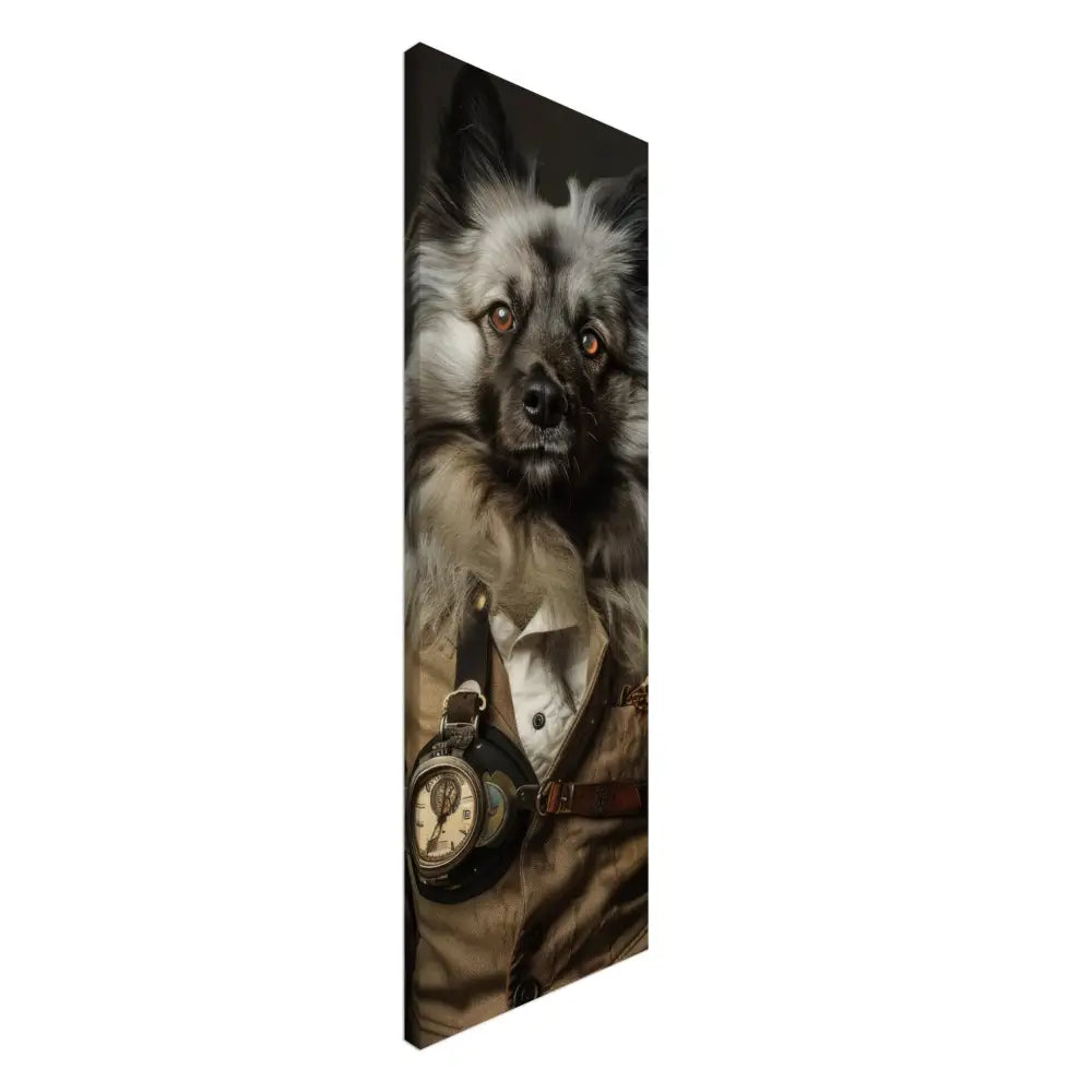 Deze afbeelding toont een dier, gekleed in een prachtige vintage steampunk outfit. Het draagt een verfijnde, beige jas met subtiele stiksels en leren accenten. Om de nek hangt een antieke klok met een koperen kleur en een intrigewekkend design, wat de look van een verfijnde tijdreiziger versterkt. Op het hoofd prijkt een paar bruin met bronzen steampunk brillen, versierd met gedetailleerde metalen elementen. De pootjes zijn voorzien van zwarte, bontachtige manchetjes, die elegant contrasteren met de rest van de outfit. De gedempte, donkere achtergrond voegt een mystieke sfeer toe, die de victoriaanse charme van het geheel compleet maakt.