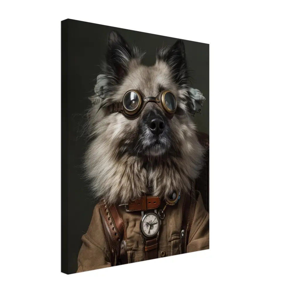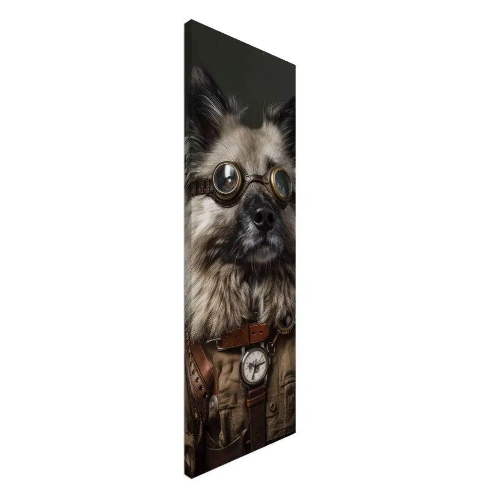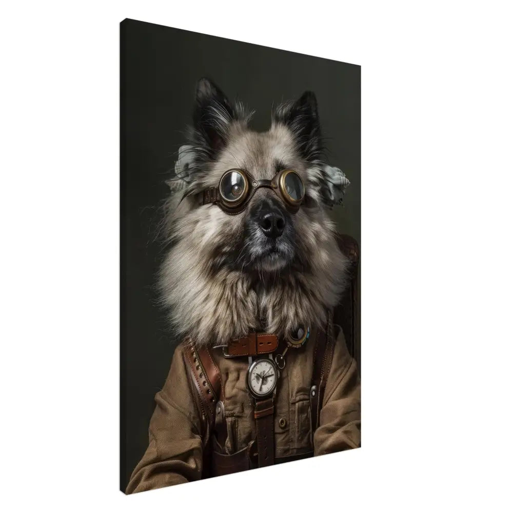 Deze afbeelding toont een hond, gekleed in een prachtige vintage steampunk outfit. Het draagt een verfijnde, bruine jas met subtiele leren accenten en stiksels die de gedetailleerde afwerking benadrukken. Om de nek van de hond hangt een indrukwekkende antieke klok, uitgevoerd in een glanzende zilveren kleur, wat een vleugje elegantie toevoegt. De kop wordt gesierd door een chique bril, met metalen details in bronskleur, wat een opvallend steampunk-effect creëert. Als extra accessoires draagt het dier stijlvolle bontachtige manchetjes, die perfect contrasteren met de leren elementen. De achtergrond is eenvoudig en donker, waardoor de hond centraal staat.