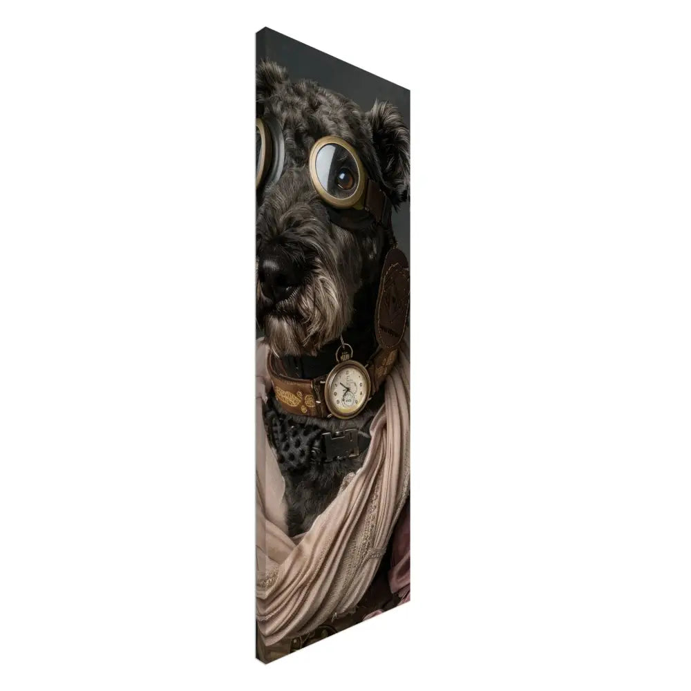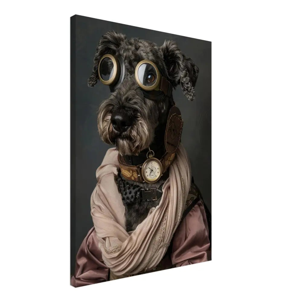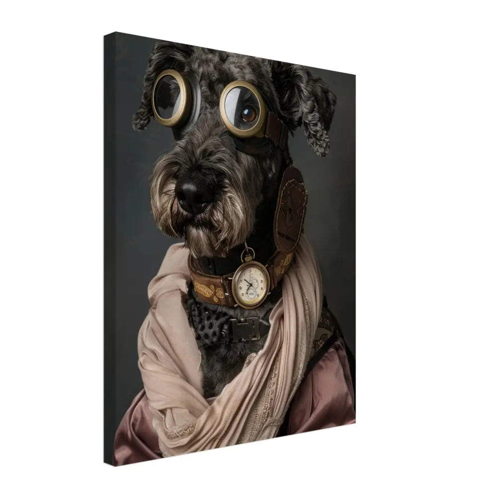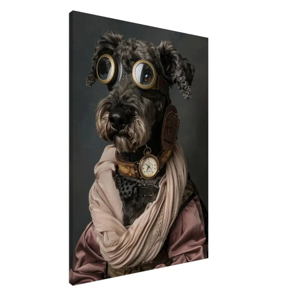 Deze afbeelding toont een dier, gekleed in een prachtige vintage steampunk outfit. Het draagt een elegante, roze jas met delicate patronen en fluweelachtige accenten. Om de nek hangt een antieke gouden klok, die een gevoel van tijdloosheid uitstraalt. De kop wordt gesierd door een paar grote, bronskleurige retro-futuristische brillen met robuuste metalen details, wat een avontuurlijke sfeer geeft. De pootjes zijn gedecoreerd met saffraankleurige bontachtige manchetjes, en leren accenten met contrasterende stiksels, die het uiterlijk completeren. De donkere, sfeervolle achtergrond versterkt de magische en mysterieuze uitstraling, waardoor het geheel tot leven komt.