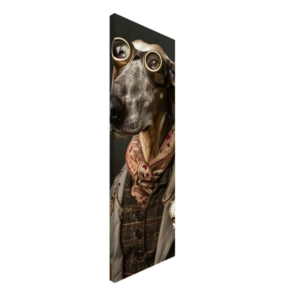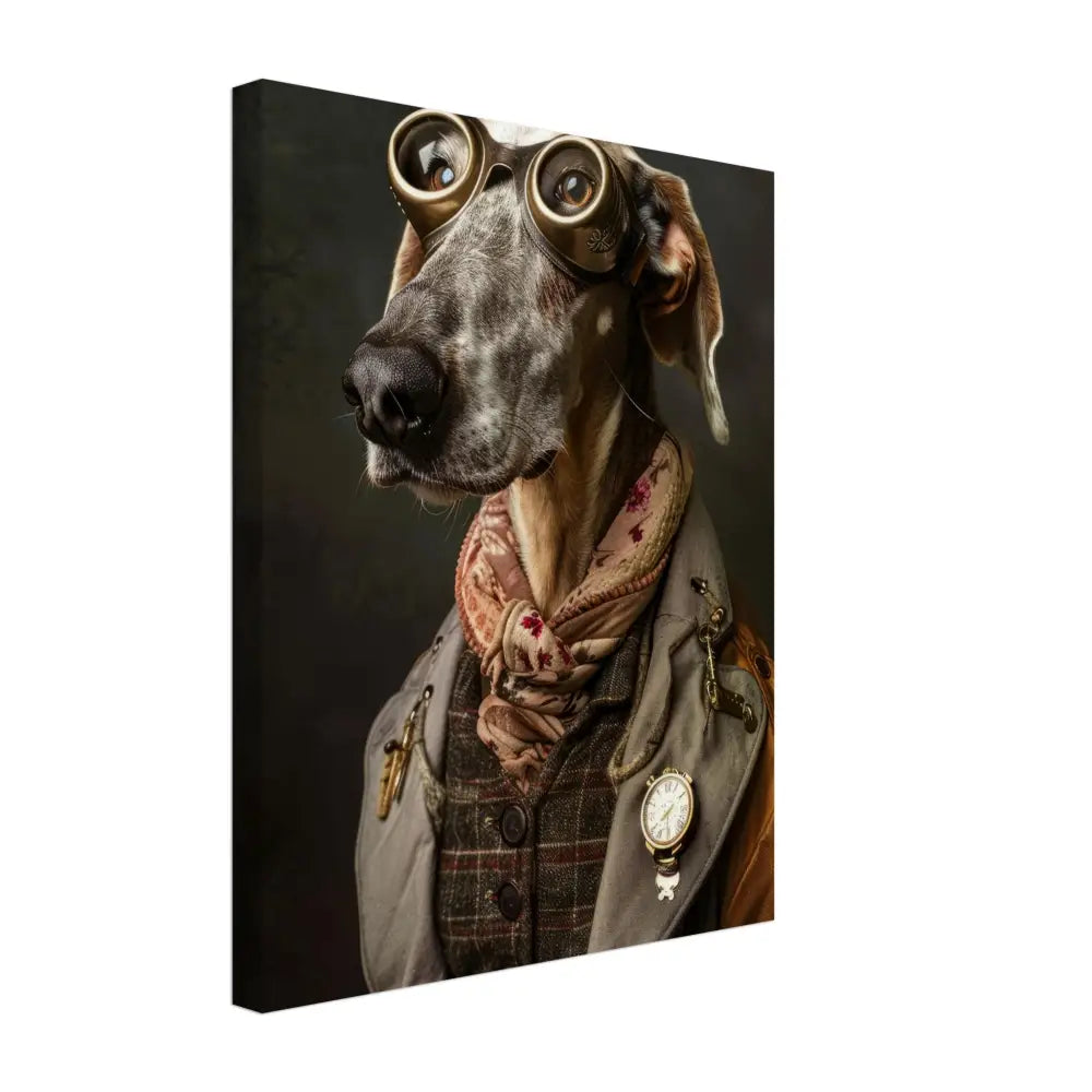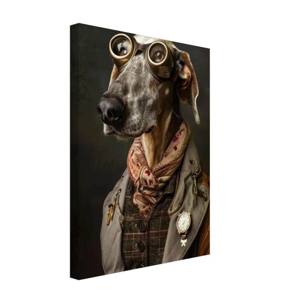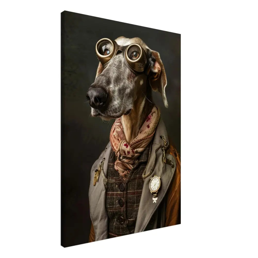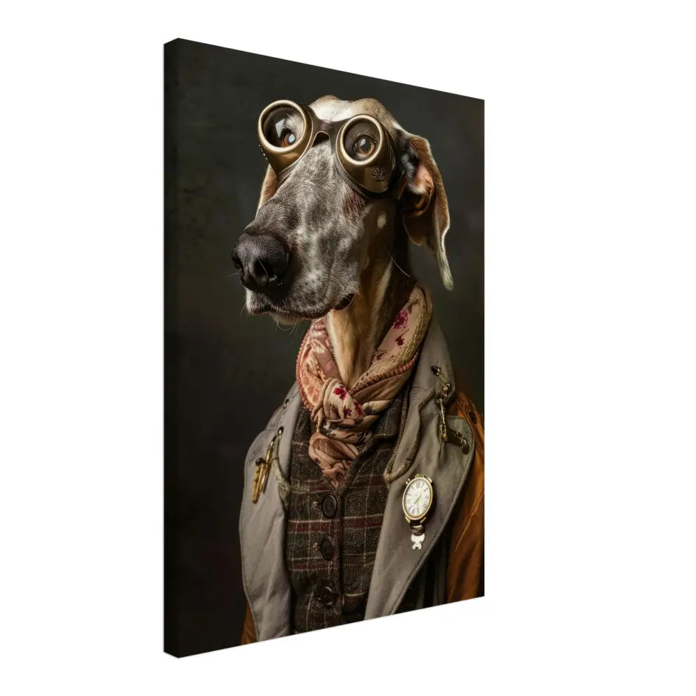 Deze afbeelding toont een hond, gekleed in een prachtige vintage steampunk outfit. Het draagt een stijlvolle, grijs-bruine jas met subtiele patronen en leren accenten. Om de nek hangt een antieke gouden klok die een vleugje nostalgie toevoegt aan het geheel. De kop wordt gesierd door een paar grote, bronzen bril met gedetailleerde metalen details, die de hond een avontuurlijk en intellectueel karakter geven. De pootjes zijn voorzien van elegante, bontachtige manchetjes die het ensemble compleet maken. De achtergrond is donker en mysterieus, wat de majestueuze uitstraling van de hond benadrukt en een intrigerende sfeer creëert.