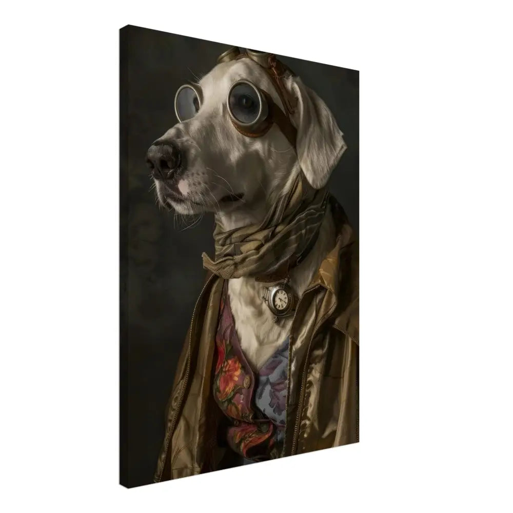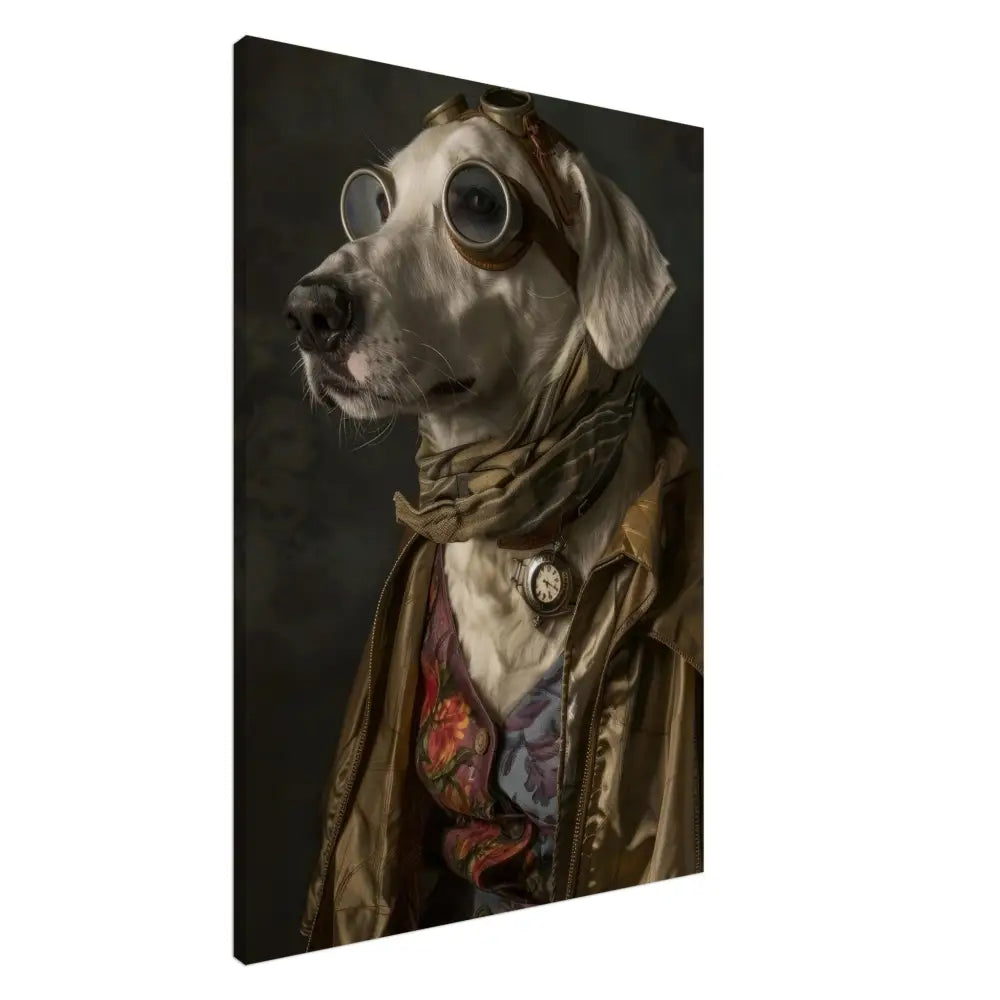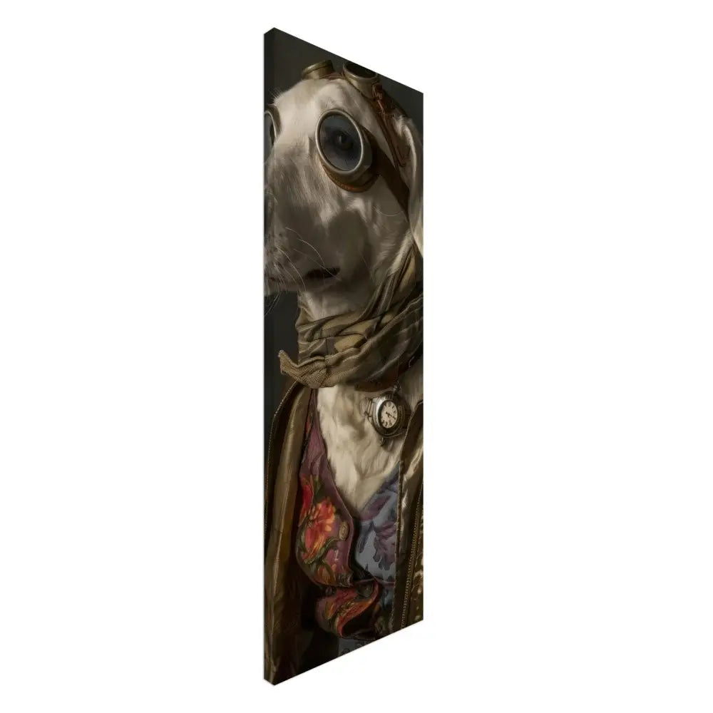Deze afbeelding toont een dier, gekleed in een prachtige vintage steampunk outfit. Het draagt een glanzende gouden jas met verfijnde stiksels en subtiele patronen die functioneren als visuele accenten. Om de nek hangt een antieke zilveren klok, die een klassieke charme toevoegt aan het geheel. De kop is voorzien van een paar grote, retro-futuristische brillen met metalen details in bronskleur, wat het dier een avontuurlijk karakter geeft. Extra accessoires bestaan uit een gestreepte sjaal en een vest met levendige bloemenpatronen. De achtergrond is donker met bloemmotieven, wat een mysterieuze ambiance creëert.