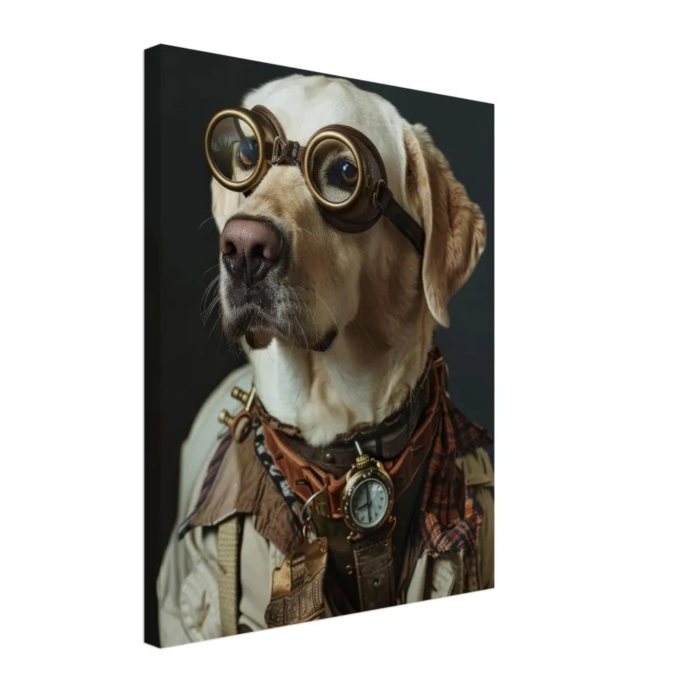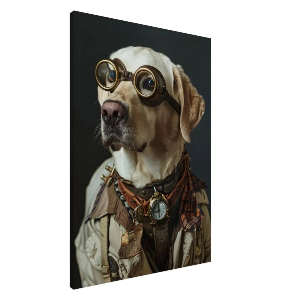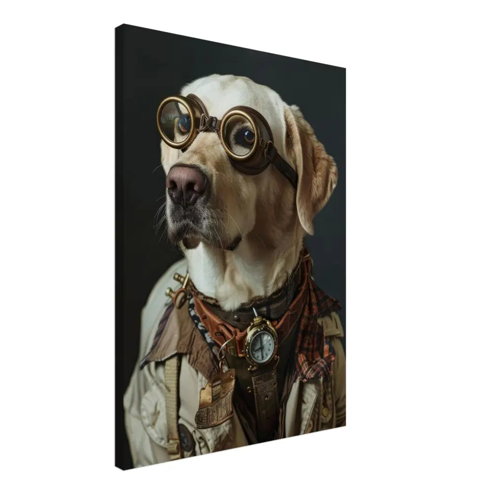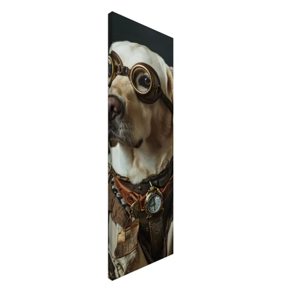Deze afbeelding toont een dier, gekleed in een prachtige vintage steampunk outfit. Het draagt een elegante, lichtbruine jas met subtiele geruite patronen en met leer verstevigde schouderstukken. Om de nek hangt een antieke gouden klok, met verfijnde details die de tijdloze charme benadrukken. Het hoofd wordt gesierd door een opvallende, bronzen bril met dikke, ronde lenzen en robuuste metalen accenten, wat het een avontuurlijke blik geeft. De voorpoten zijn versierd met stijlvolle, donkere bontachtige manchetjes, en leren riempjes met contrasterende stiksels completeren het geheel. De achtergrond is donker en neutraal, waardoor de steampunk-uitstraling van de hond nog meer tot uiting komt.