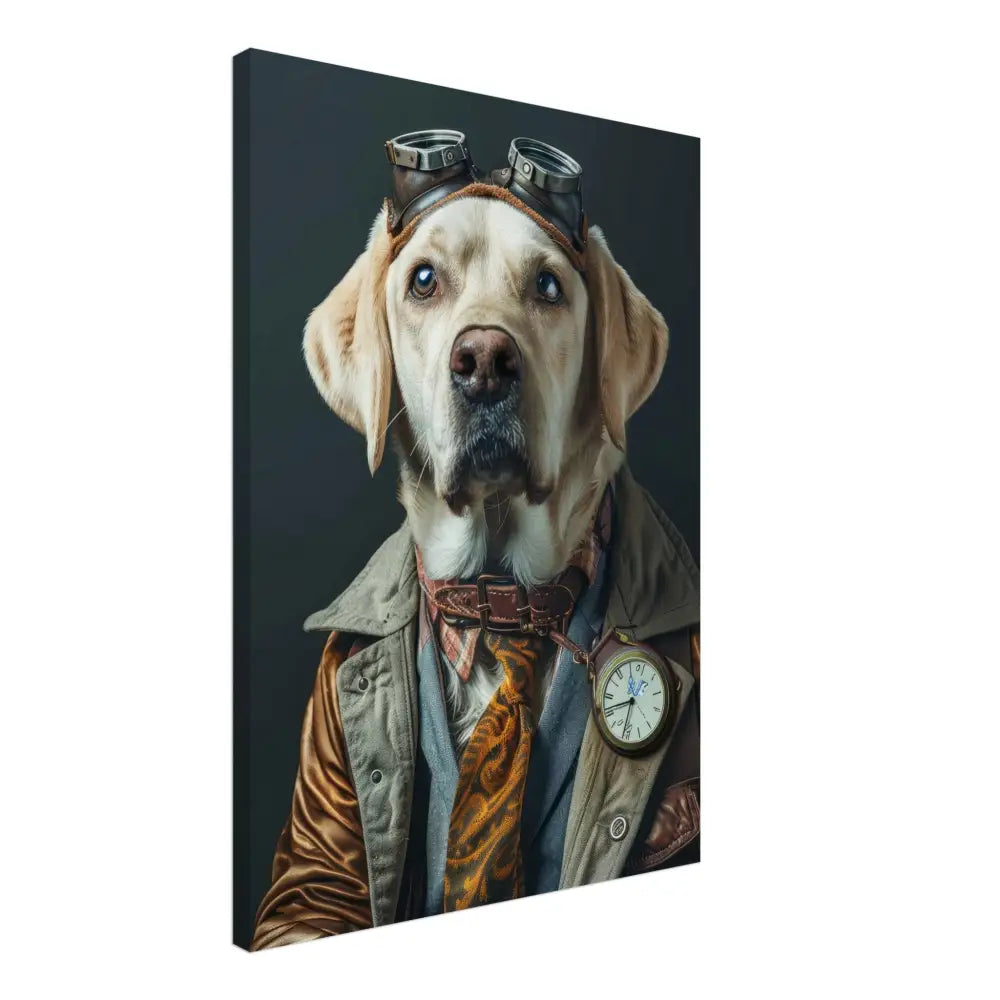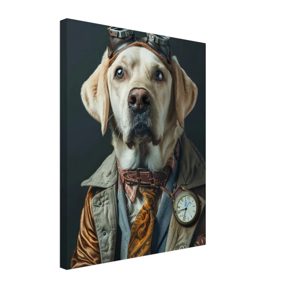 Deze afbeelding toont een hond, gekleed in een prachtige vintage steampunk outfit. De hond draagt een verfijnde bruinleren jas met lichtgrijze accenten en subtiele details. Om de nek hangt een antieke bronzen klok die elegant afsteekt tegen de warme tinten van de outfit. De kop van de hond is gesierd met een paar robuuste, retro-futuristische brillen met glanzende, metalen details die de avontuurlijke sfeer versterken. Langs de poten zijn stijlvolle leren accenten en contrasterende stiksels zichtbaar. De achtergrond is eenvoudig en donker, waardoor de gedetailleerde steampunk-outfit van de hond nog meer opvalt.