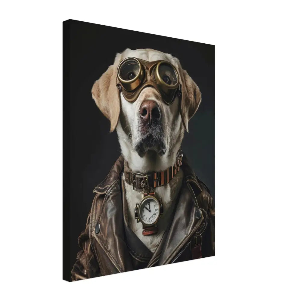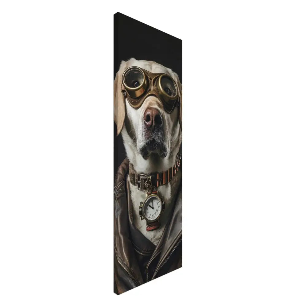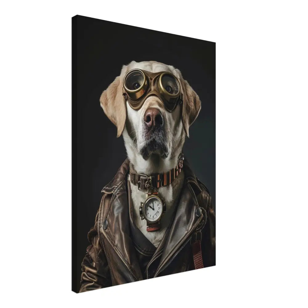 Deze afbeelding toont een dier, gekleed in een prachtige vintage steampunk outfit. Het draagt een robuuste, bruine leren jas met stoere stiksels en metalen knopen die een stoere uitstraling geven. Om de nek hangt een antieke klok in een bronskleurige behuizing, wat een vleug van aristocratie toevoegt. De kop wordt gesierd door grote, goudkleurige steampunk brillen met gedetailleerde metalen accenten, waardoor het dier een avontuurlijke tijdreiziger lijkt. De pootjes worden omlijst door leren manchetjes, compleet met contrasterende stiksels. De achtergrond is donker en mysterieus, waardoor alle aandacht naar de elegante verschijning van het dier gaat.