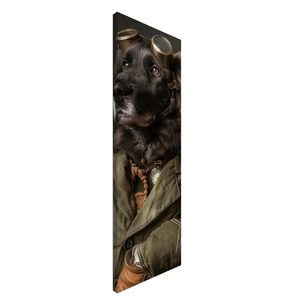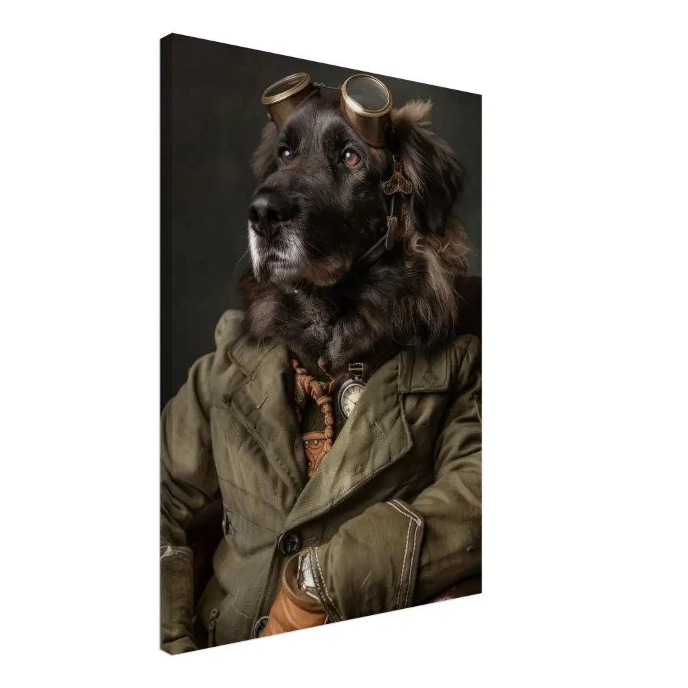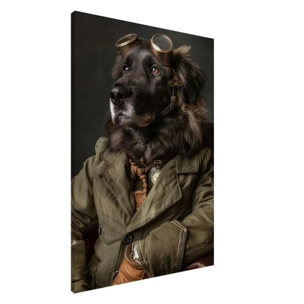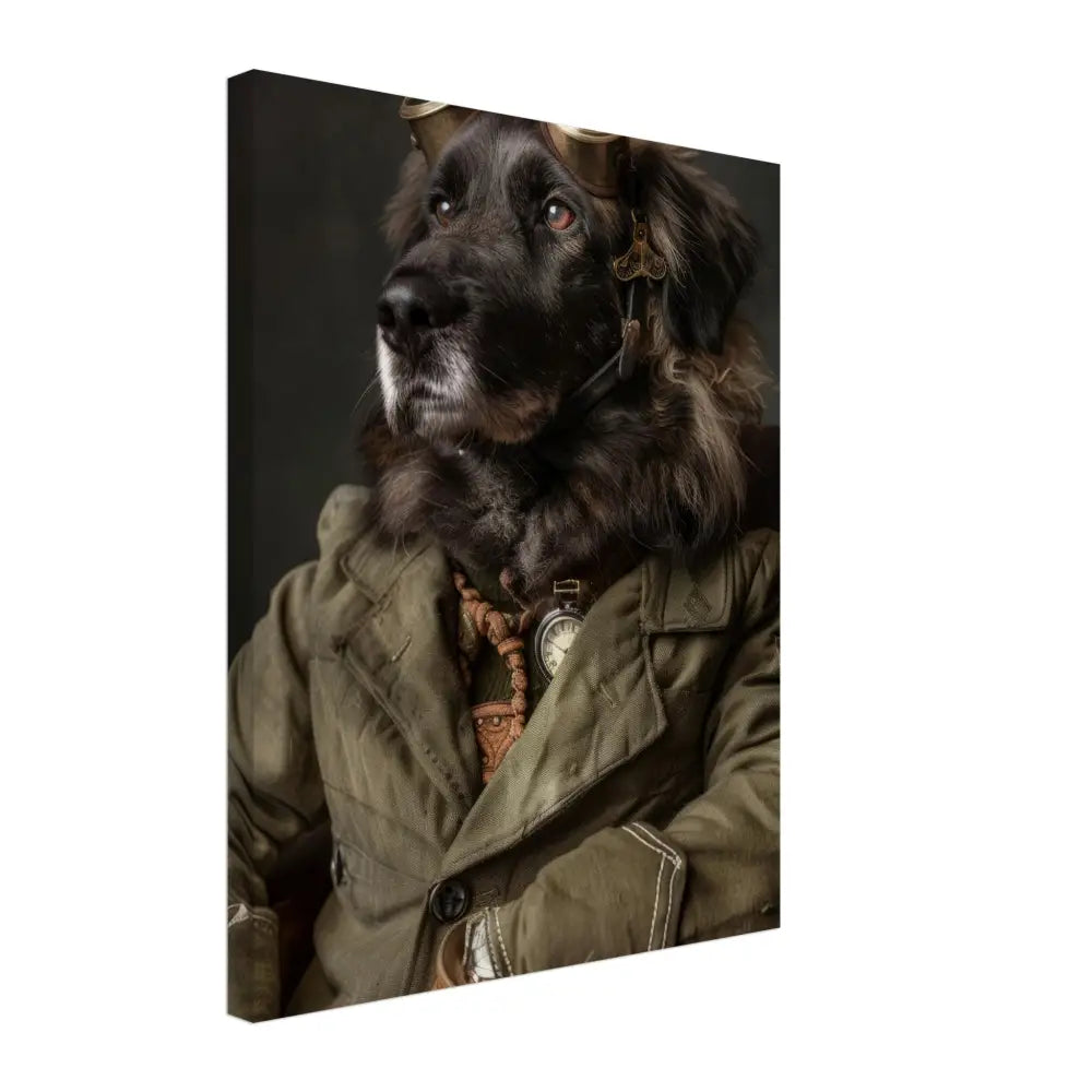 Deze afbeelding toont een dier, gekleed in een prachtige vintage steampunk outfit. Het draagt een olijfgroene jas, gedetailleerd met subtiele slijtplekken en gestikte patronen op de mouwen, die een authentieke look creëren. Om de nek hangt een antieke zilveren klok, een sierlijk accessoire dat de klassieke stijl benadrukt. De kop wordt gesierd door een paar robuuste, bronzen bril met metalen details, waardoor deze eruitziet als een ingenieuze ontdekkingsreiziger. Extra accessoires zoals bruine, leren accenten en contrasterende stiksels bij de manchetten, geven het geheel een rijke textuur. De achtergrond is rustig en donker, waardoor de kleding en accessoires goed opvallen.