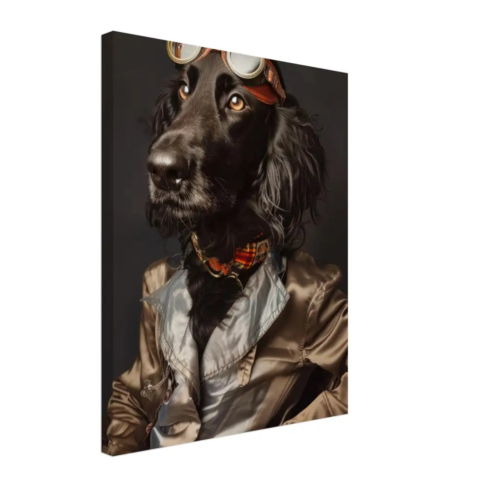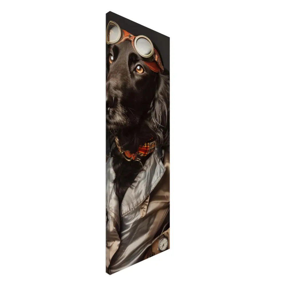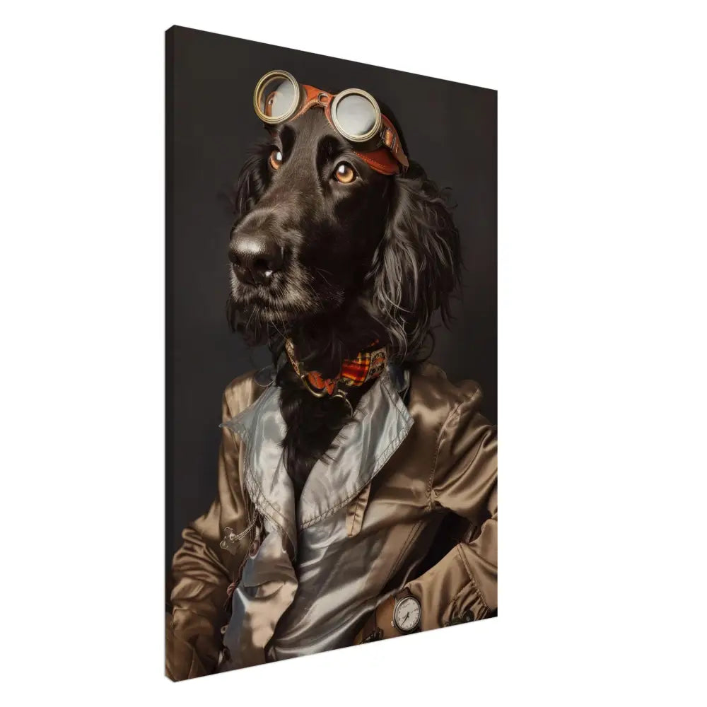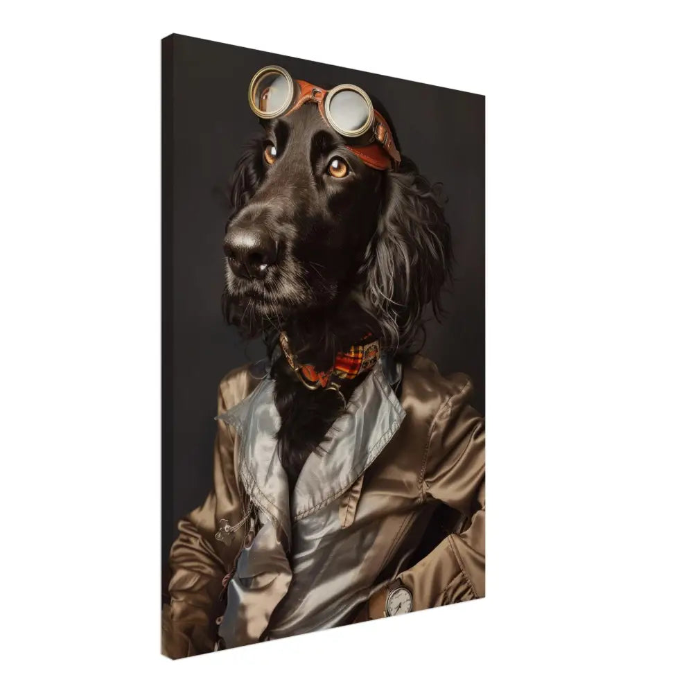Deze afbeelding toont een dier, gekleed in een prachtige vintage steampunk outfit. Het draagt een elegante, zilverkleurige jas met subtiele satijnen glans en verfijnde details. Om de nek hangt een antieke gouden klok, die de sierlijke uitstraling benadrukt. De kop wordt gesierd door grote, koperen retro-futuristische brillen met robuuste metalen details, wat het een avontuurlijk karakter geeft. De pootjes zijn voorzien van chique, zwarte bontachtige manchetjes met contrasterende rode stiksels die het geheel afmaken. De achtergrond is eenvoudig en donker, waardoor de rijke details van het kostuum naar voren komen en de aandacht naar het dier gaat.