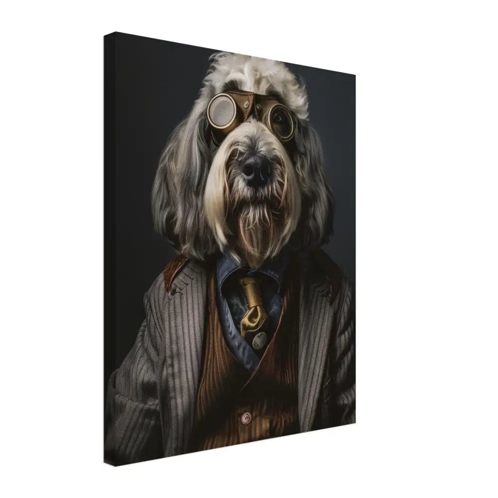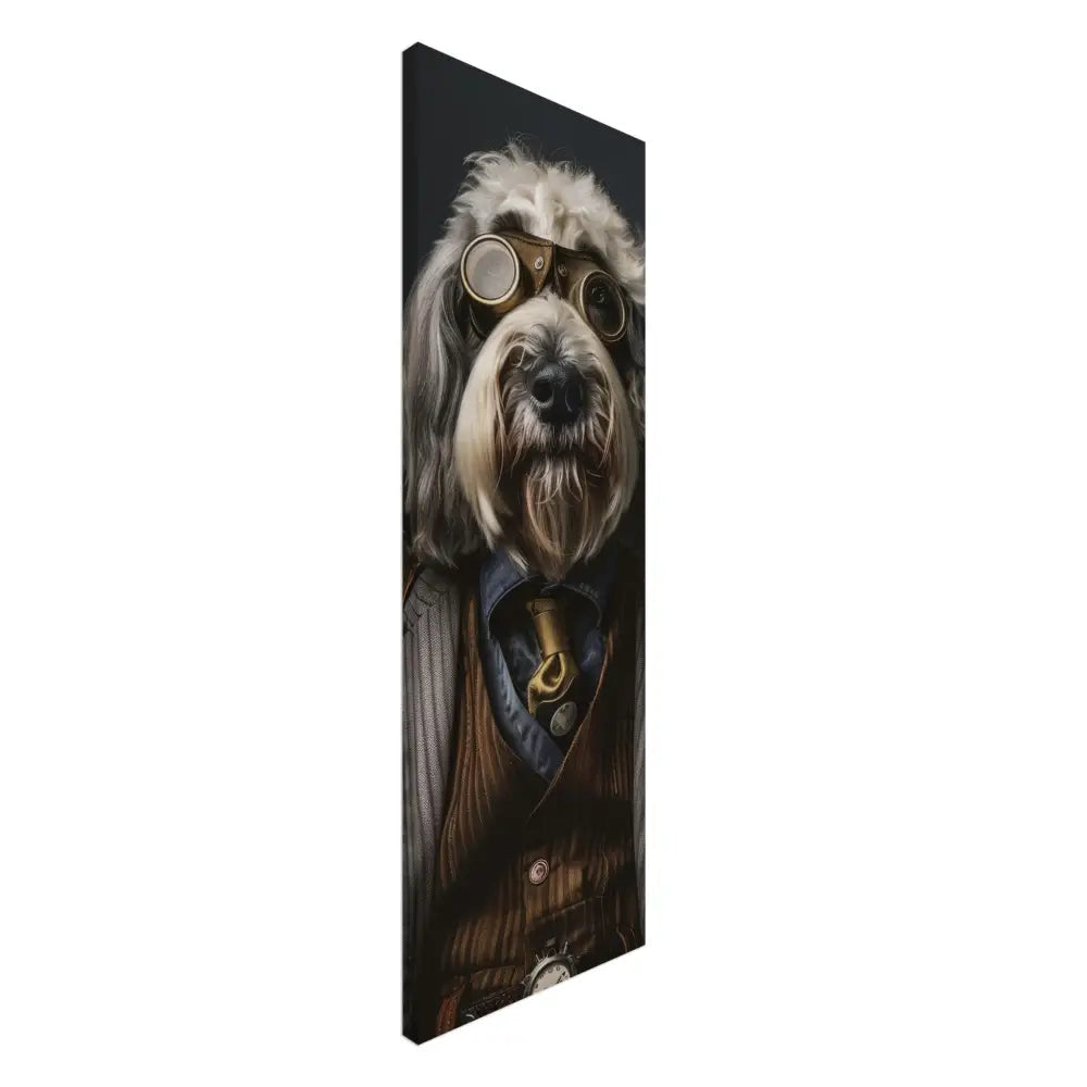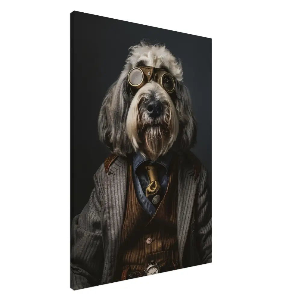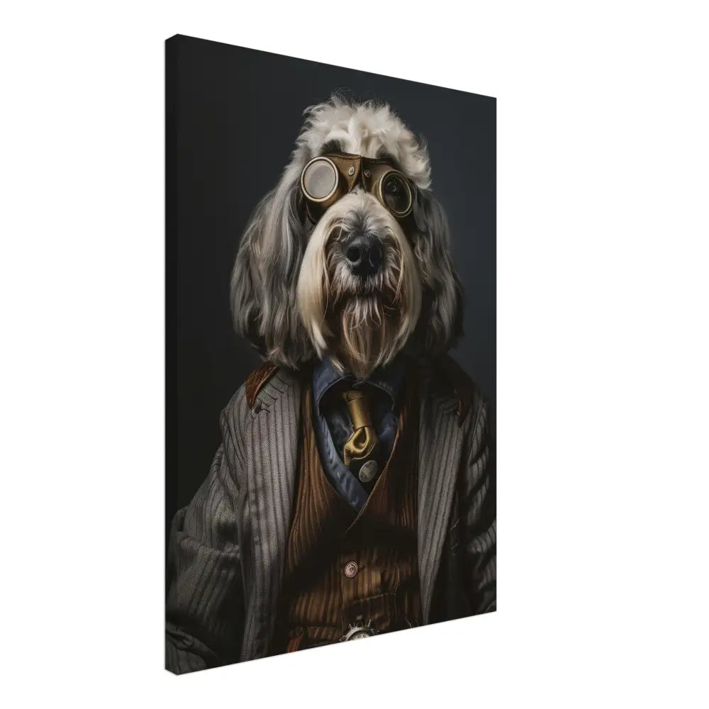 Deze afbeelding toont een dier, gekleed in een prachtige vintage steampunk outfit. Het draagt een gestreepte, grijze jas met subtiele, elegante patronen en leren accenten op de schouders. Om de nek hangt een antieke gouden klok die de nobele uitstraling van het portret benadrukt. Op de kop prijkt een paar grote, messingkleurige brillen met verfijnde metalen details, die een wetenschap-achtige charme aan het dier toekennen. De pootjes zijn versierd met verfijnde, leren manchetjes met contrasterende stiksels. De achtergrond is simplistisch en donker, waardoor de aandacht volledig op het gedetailleerde kostuum en het auguste dier zelf ligt.