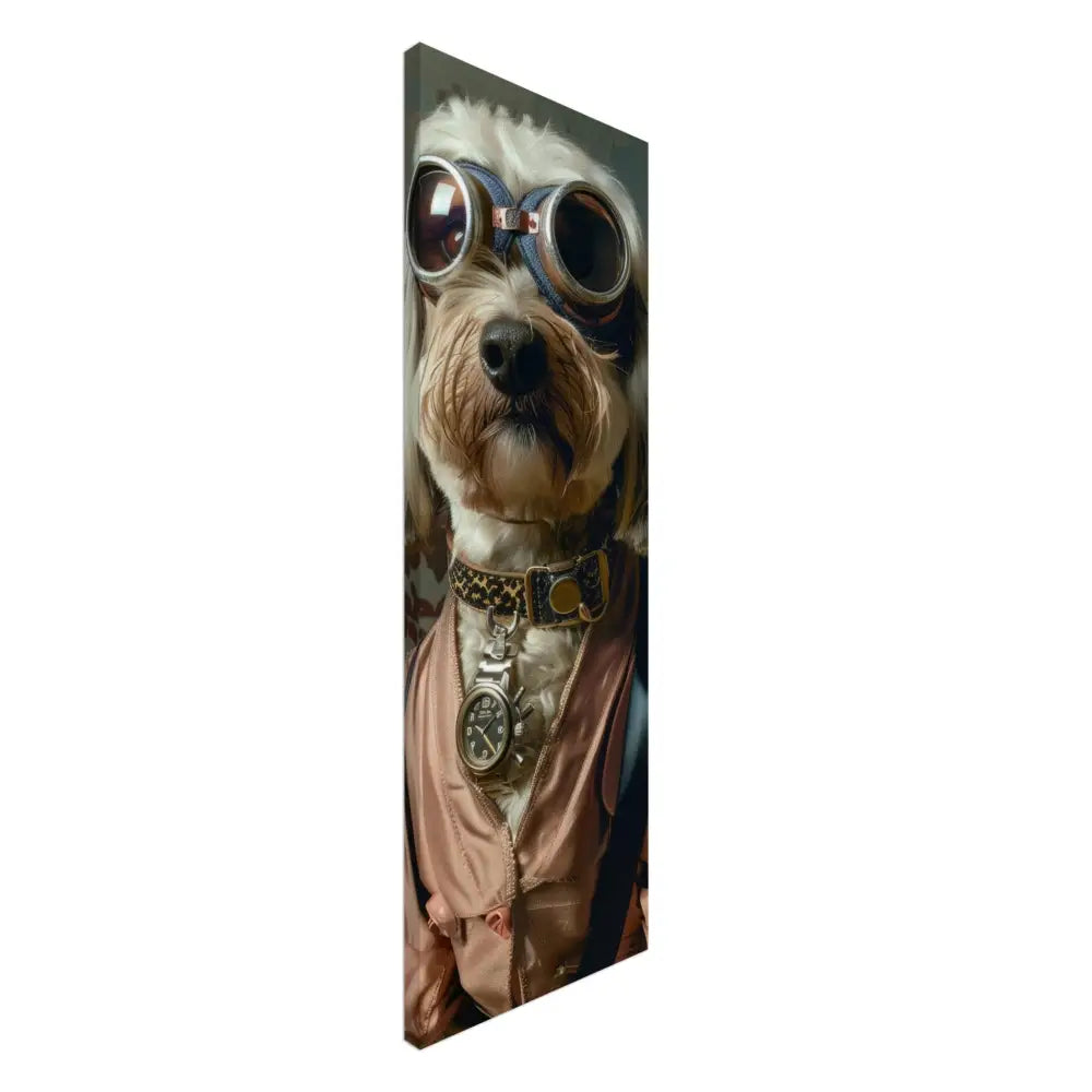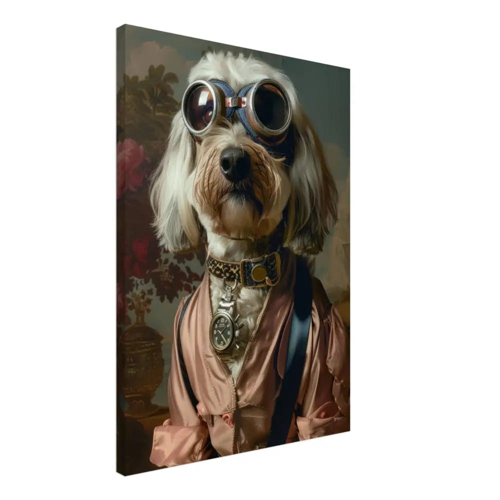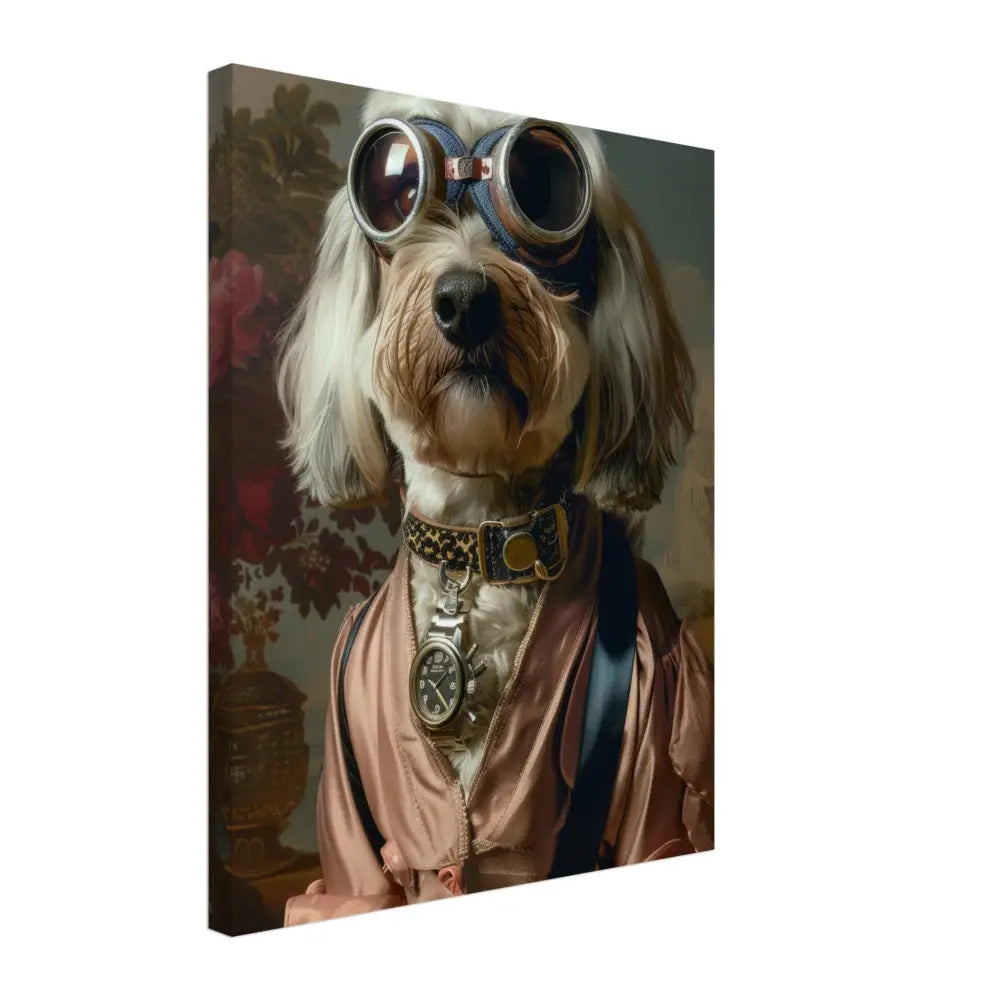 Deze afbeelding toont een dier, gekleed in een prachtige vintage steampunk outfit. Het draagt een verfijnde, perzikkleurige jas met delicate stiksels en satijnen accenten, die de vorstelijke uitstraling versterken. Om de nek hangt een antieke zilveren klok met een sierlijke wijzerplaat, subtiel contrasterend met de donkere achtergrond. De kop wordt sierlijk omlijst door een stel indrukwekkende, bronzen retro-futuristische brillen met gedetailleerde metalen elementen, die de avontuurlijke geest van het dier benadrukken. De voorpootjes zijn elegant voorzien van lichtroze, bontachtige manchetjes en leren riempjes voor extra stijl. De achtergrond is versierd met een weelderig bloemmotief en antieke