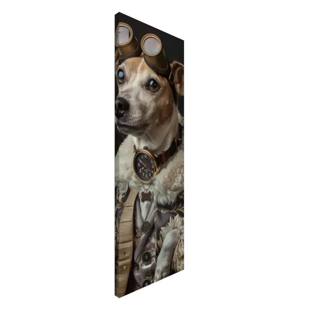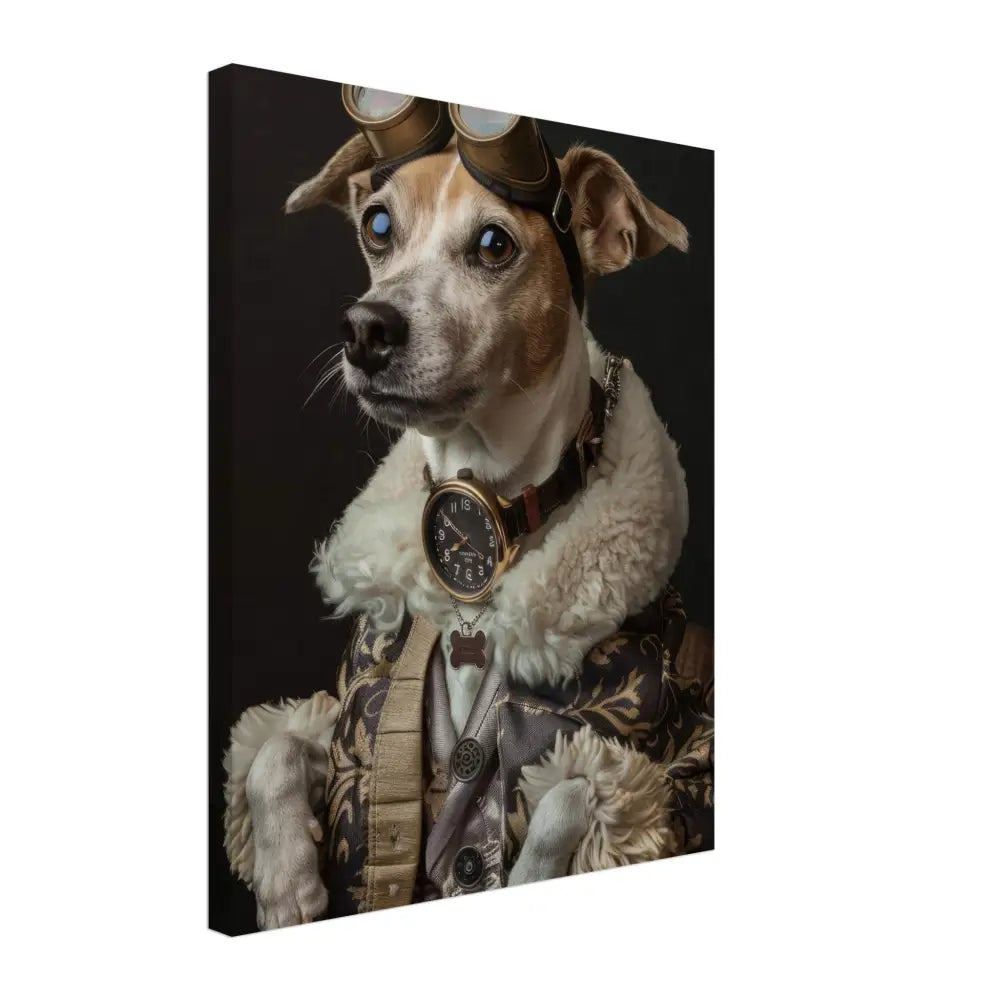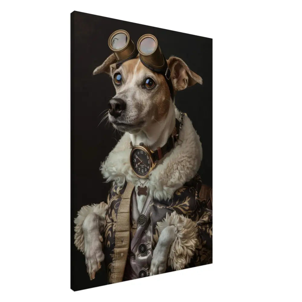 Deze afbeelding toont een hond, gekleed in een prachtige vintage steampunk outfit. De hond draagt een koninklijke, donkerblauwe jas met ingewikkelde gouden patronen en fluweelachtige accenten. Om de nek hangt een antieke zwarte klok, die de aristocratische uitstraling versterkt. Op het hoofd prijkt een paar grote, retro-futuristische brillen met metalen details in bronzen kleur, wat hem een avontuurlijke tijdreiziger doet lijken. De pootjes zijn voorzien van elegante, witte bontachtige manchetjes en leren accenten, die het geheel afronden. De achtergrond is donker en minimalistisch, waardoor de stijlvolle outfit nog meer opvalt.