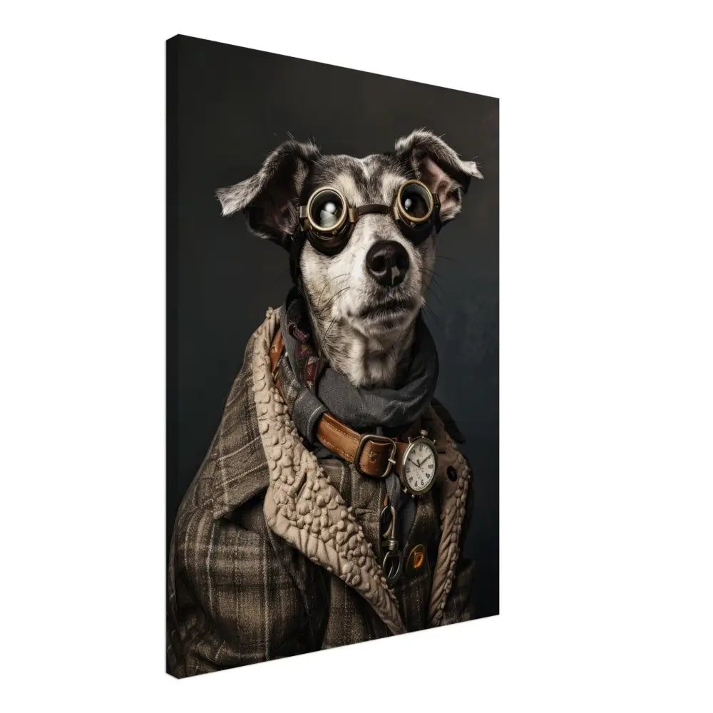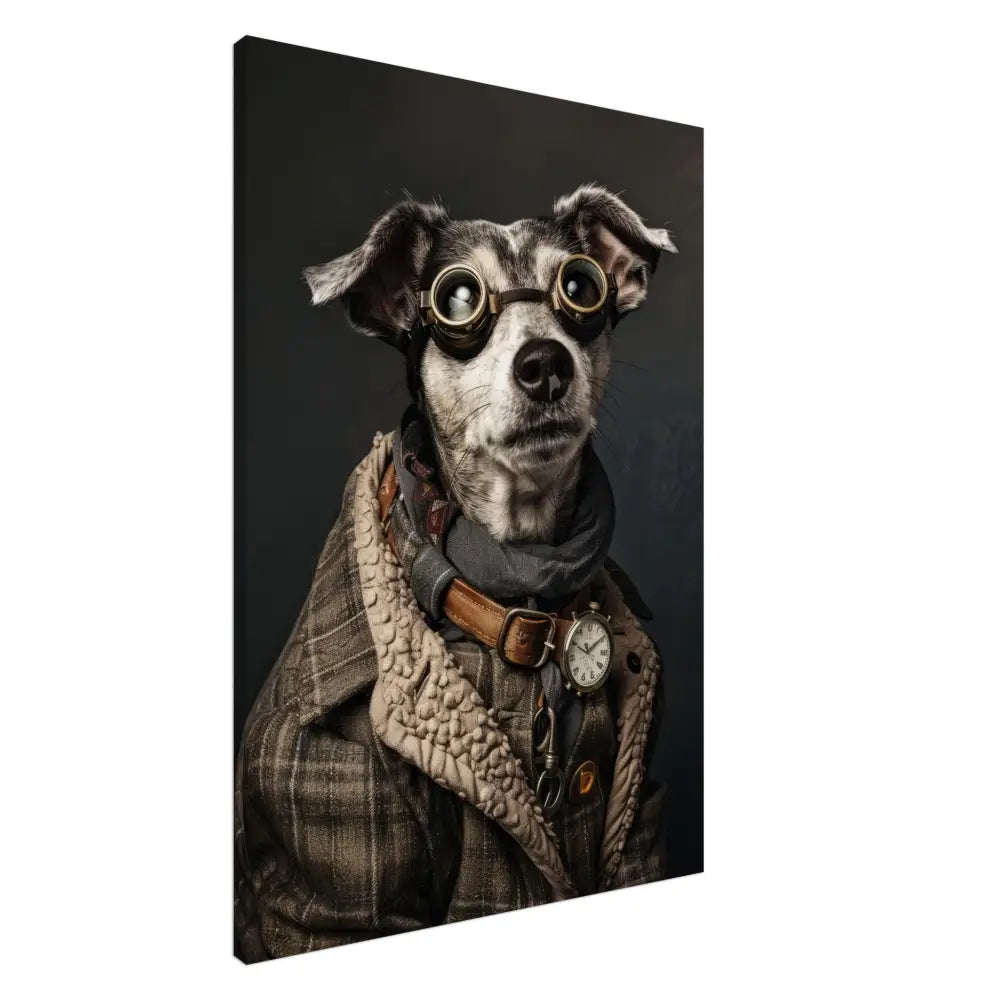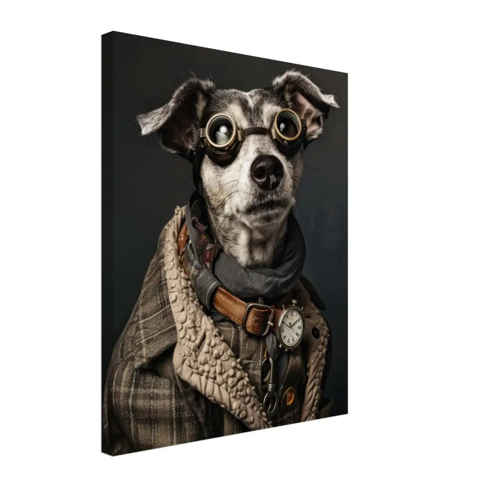 Deze afbeelding toont een dier, gekleed in een prachtige vintage steampunk outfit. Het draagt een stijlvolle, geruite jas in aardetinten met donzige voering en leren accenten. Om de nek hangt een antieke zilveren klok, die de aristocratische uitstraling versterkt. De kop wordt gesierd door een paar grote, retro-futuristische brillen met metalen details in bronskleur, waardoor deze eruitziet als een avontuurlijke tijdreiziger. De pootjes zijn voorzien van elegante, grijze bontachtige manchetjes die het geheel afmaken. De afbeelding heeft een mysterieuze sfeer door de donkere, vervaagde achtergrond.