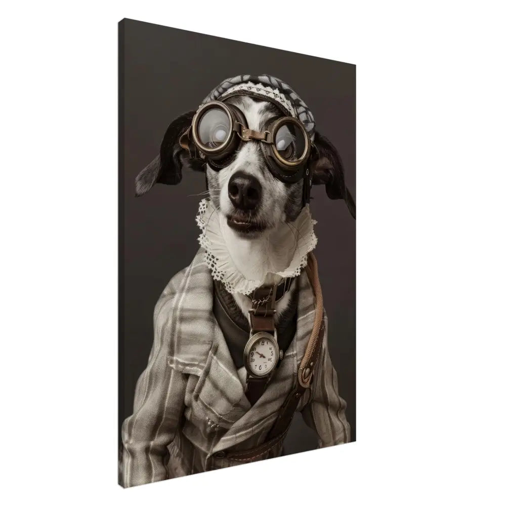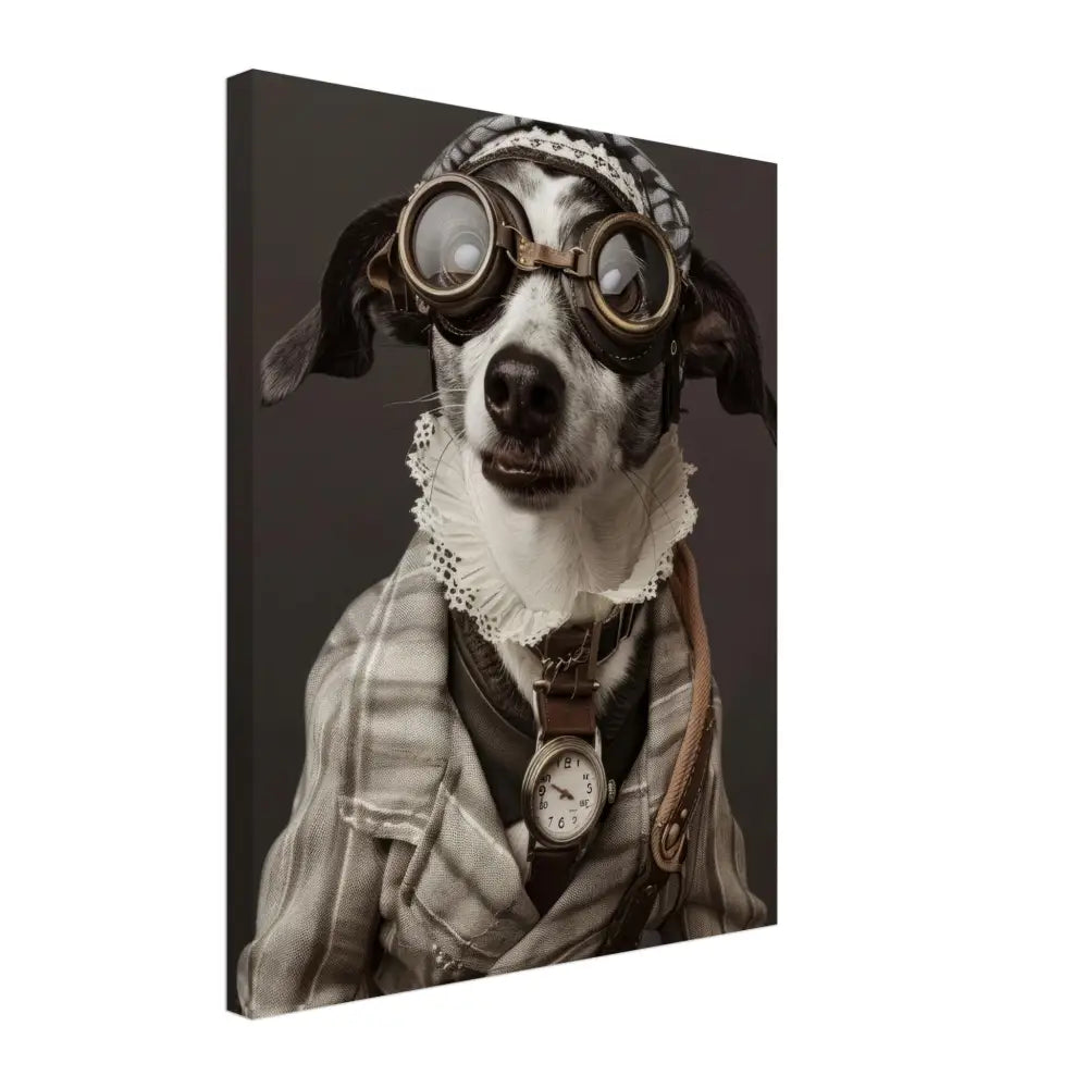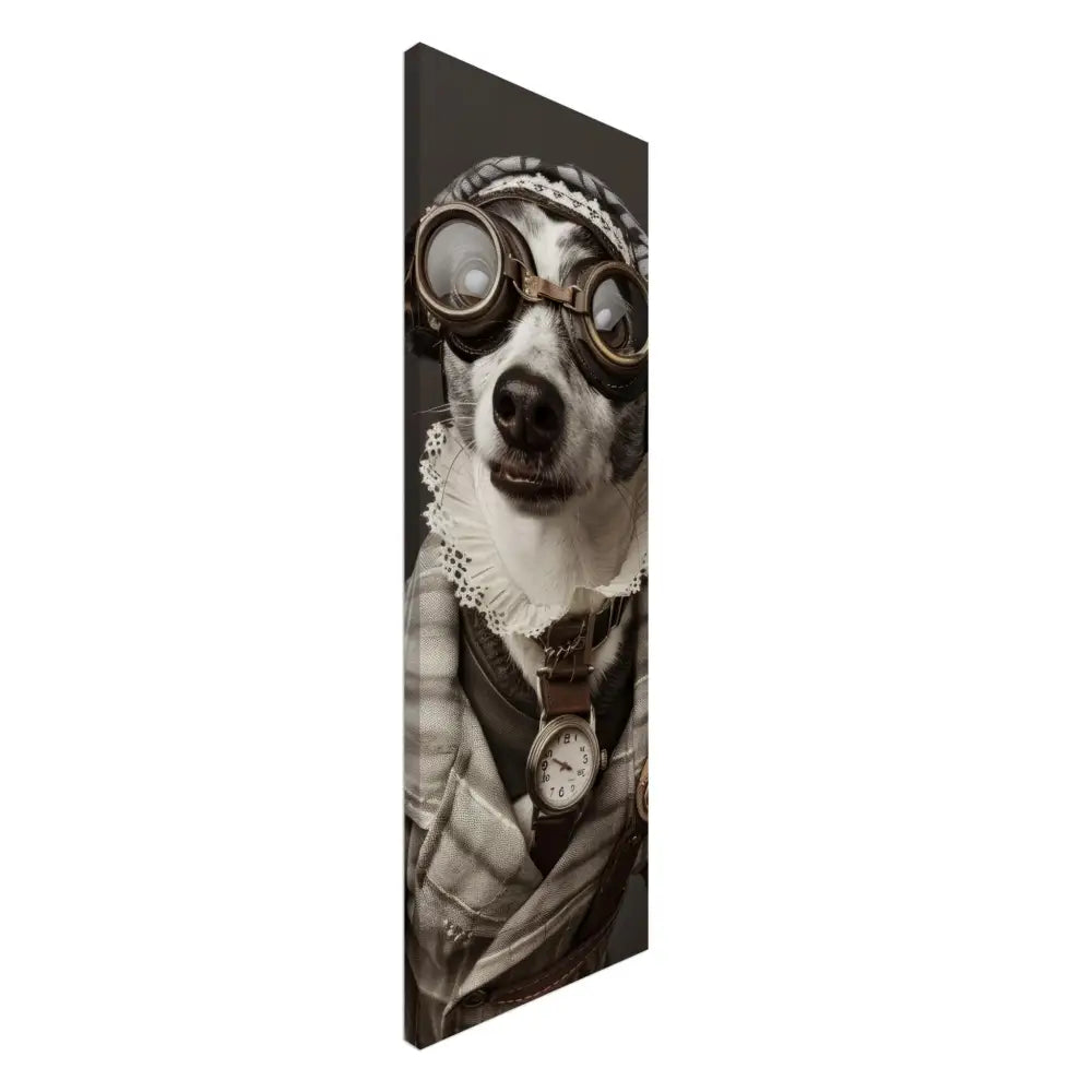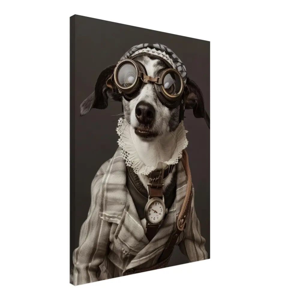 Deze afbeelding toont een dier, gekleed in een prachtige vintage steampunk outfit. Het draagt een elegant, grijs gestreepte jas met subtiele patronen en delicate accenten. Om de nek hangt een antieke zilveren klok, die het raffinement van de look benadrukt. Op zijn kop draagt het dier een paar grote, retro-futuristische brillen met bronzen metalen details, die een avontuurlijke sfeer uitstralen. De outfit wordt verder aangevuld door bontachtige manchetjes, leren riemen en contrasterende stiksels. De achtergrond is een gedempte tint, die het steampunk-thema versterkt en de aandacht naar het gedetailleerde kostuum trekt.