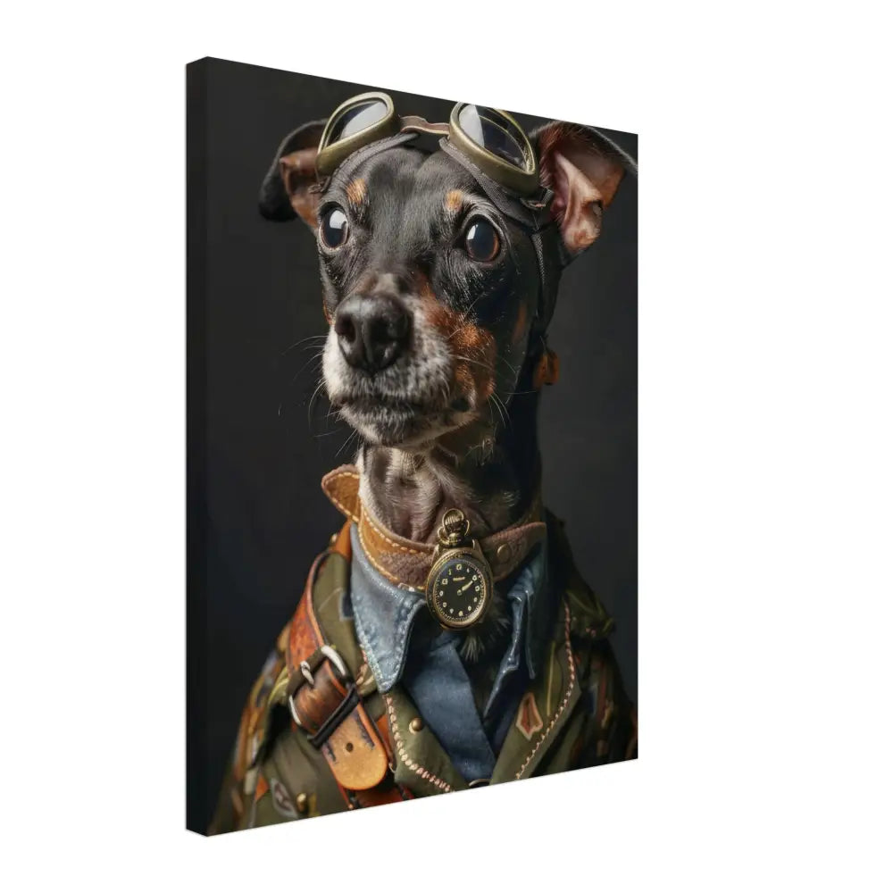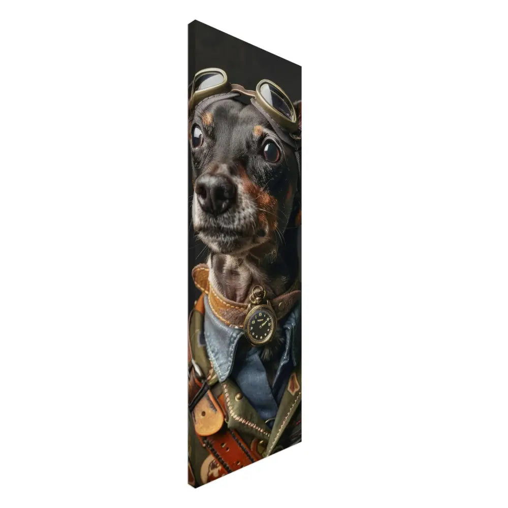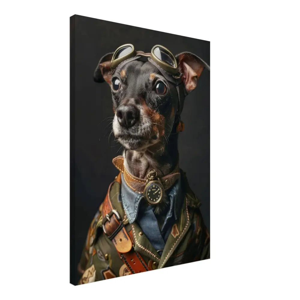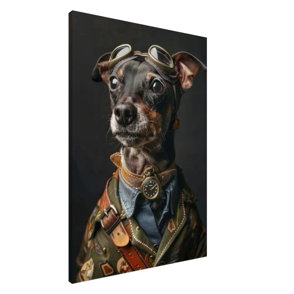 Deze afbeelding toont een dier, gekleed in een prachtige vintage steampunk outfit. Het draagt een elegante, olijfgroene jas met sierlijke patronen en koperen accenten. Om de nek hangt een antieke gouden klok, die het geheel een tijdloze charme geeft. De kop wordt gesierd door een paar stoere, bronzen retro-futuristische brillen, waardoor het dier een avontuurlijke uitstraling heeft. De pootjes zijn voorzien van stevige, bruinleren accenten en de jas is afgewerkt met contrasterende, sierlijke stiksels. De achtergrond is donker en eenvoudig, zodat alle focus op de gedetailleerde en stijlvolle outfit van het dier ligt.
